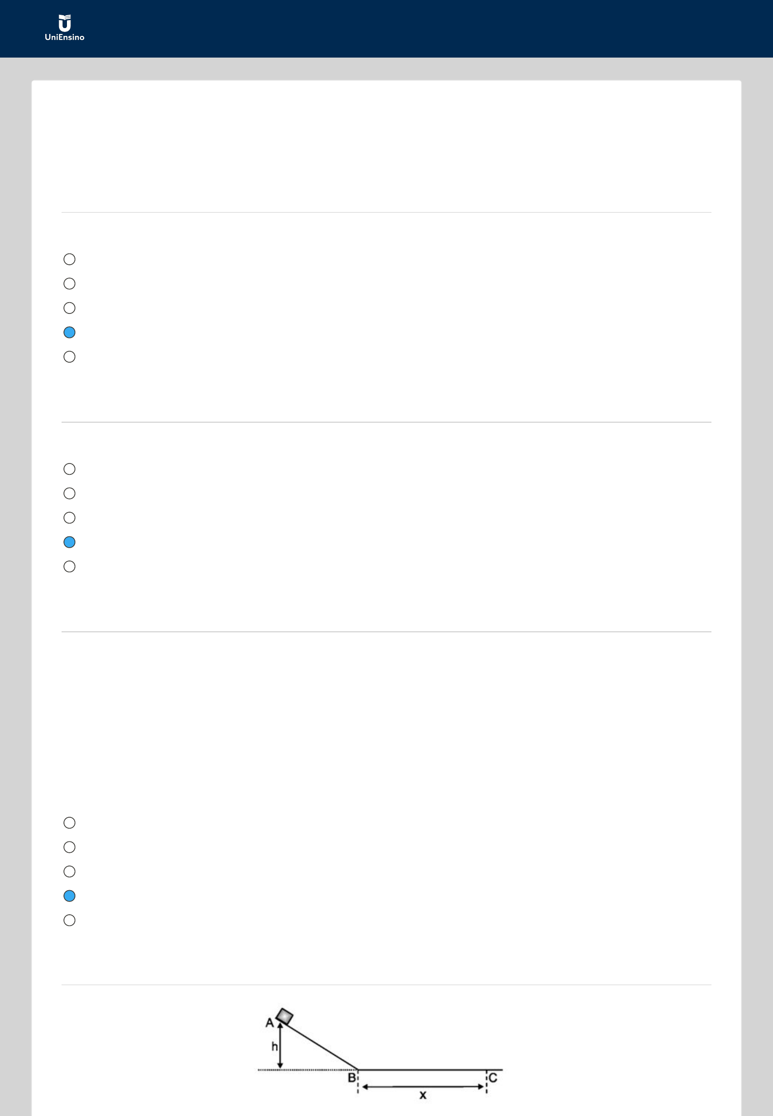 MECÂNICA - Aula 16 - Sistemas de Partículas Voltar para Aula Resolvendo Prova Instruções: Responda o seguinte questionário marcando somente a resposta correta quando houver múltiplas escolhas. Questões descritivas devem ser respondidas com no mínimo 2500 caracteres. Questão 01 A massa de uma partícula de poeira é de 0,0000000007 kg. A ordem de grandeza da massa da partícula é igual a: 1.10-10 kg 7.10-10 kg 1.10-13 g nenhuma das alternativas acima 7.10-7 g Questão 02 A física estuda a relação entre grandezas físicas. Qual das grandezas físicas abaixo é considerada uma grandeza física escalar? momento linear velocidade força energia aceleração Questão 03 As afirmações a seguir se relacionam a cada uma das leis de Newton: ( ) para você ser capaz de andar sobre uma superfície qualquer seu pé precisa fazer uma força sobre a Terra e a Terra precisa fazer uma força sobre você. ( ) um carro em um terreno lamacento ou coberto por gelo tem dificuldade de sair do lugar. ( ) os bancos dos automóveis têm encostos altos para prevenir que os passageiros quebrem o pescoço em caso de acidente. ( ) se dobrarmos a massa que levantamos no supino na academia devemos dobrar a força exercida sobre a barra. 1. Lei da inércia 2. Princípio fundamental da mecânica 3. Par de ação e reação Agora, marque a associação correta: 3 – 2 – 1 – 1 3 – 3 – 1 – 2 1 – 2 – 2 – 3 3 – 2 – 1 – 3 2 – 2 – 1 – 2 Questão 04 javascript: void(0); (Mackenzie-SP) Uma caixa de massa m é abandonada do repouso, do topo do plano inclinado liso da figura. Essa caixa passa pelo ponto B e, devido ao atrito existente no trecho horizontal, para no ponto C. O coeficiente de atrito, μ, no trecho BC pode ser dado por: h/x x/h2 x/h 2h/x 2x/h Questão 05 Uma bolinha de gude de 50 g rola de uma mesa e cai a 2 m da base da mesa. Uma bolinha de gude, agora, de 100 g rola de cima da mesma mesa com a mesma velocidade. Ela aterrissará a uma distância de: 2 m 1 m menos de 1 m entre 1 m e 2 m entre 2 m e 4 m Questão 06 (FGV-SP) Mantendo uma inclinação de 60º com o plano da lixa, uma pessoa arrasta sobre esta a cabeça de um palito de fósforos, deslocando-o com velocidade constante por uma distância de 5 cm, e ao final desse deslocamento, a pólvora se põe em chamas. Se a intensidade da força, constante, aplicada sobre o palito é 2 N, a energia empregada no acendimento deste, desconsiderando-se eventuais perdas, é: Dados: sem 60° = √3/2 e cos 60° = 1/2 √3 x 10-2 J 5 x 10-2 J 2 x 10-2 J 2√3 x 10-2 J 5√3 x 10-2 J Questão 07 Um projétil com velocidade de 500 m/s e massa 0,05 kg atinge horizontalmente um bloco de madeira de massa 4,95 kg, em repouso sobre um plano horizontal sem atrito, e nele se aloja. A velocidade do sistema projétil-bloco após a colisão é igual a: n.d.a 25 m/s – 5 m/s 5 m/s -25 m/s Questão 08 O volume da Terra expresso na unidade do SI é: 1,07.1012 km3 1,07.1027 cm3 1,07.1024 L 1,07.1021 m3 1,07.1021 L Questão 09 (UF-BA) De um ônibus que trafega numa estrada reta e horizontal com velocidade constante de 20 m/s desprende-se um parafuso, situado a 0,80 m do solo e que se fixa à pista no local em que a atingiu. Tomando-se como referência uma escala cujo zero coincide com a vertical no instante em que se inicia a queda do parafuso e considerando-se g = 10 m/s2, a que distância, em metros, este será encontrado sobre a pista. 4,2 8 0,4 2 1,2 Questão 10 Abandona-se um corpo do alto de uma torre de 100 m de altura. Desprezando-se a resistência do ar, a velocidade (no SI) do corpo ao atingir o solo será de: 52,1 m/s 48,3 m/s 54,7 m/s 44,1 m/s 50 m/s Voltar para a Aula contato@uniensino.com Copyright © 2021 - UniEnsino https://www.uniensinovirtual.com.br/curso/78/turma/3872/aula https://www.uniensinovirtual.com.br/inicio