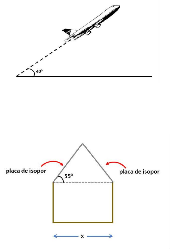 Questões de revisão (capitulo 3 e 4) 1. A figura abaixo representa um avião que decolou sob um ângulo constante de 40º e percorreu em linha reta 8000 m. Nesta situação, qual a altura que se encontrava o avião ao percorrer essa distância? Considere: sen 40º = 0,64 cos 40º = 0,77 tg 40º = 0,84 2. Para uma feira de ciências um grupo de estudantes resolveu construir uma maquete de uma casa, conforme esquema abaixo. O telhado será feito com uma placa de isopor de 1m de comprimento, que será dividida ao meio para fazer as duas partes do telhado. Sabendo que o telhado será feito segundo um ângulo de 55º, calcule a medida x da largura casa. Considere: sen 55º = 0,82 cos 55º = 0,57 tg 55º = 1,43 3. Um menino avista o ponto mais alto de um morro, conforme figura abaixo. Considerando que ele está a uma distância de 500 m da base do morro, calcule a altura (h) deste ponto. Considere: sen 20º = 0,34 cos 20º = 0,93 tg 20º = 0,36 4. As cidades A, B e C situam-se às margens de um rio e são abastecidas por uma bomba situada em P, conforme figura abaixo. Sabe-se que o triângulo ABC é retângulo em B e a bissetriz do ângulo reto corta AC no ponto P. Se BC = 6√3 km, então CP é, em km, igual a a) 6 + √3 b) 6(3 − √3 ) c) 9 √3 − √2 d) 9(√2 − 1) 5. Para determinar a distância de um barco até a praia, um navegante utilizou o seguinte procedimento: a partir de um ponto A, mediu o ângulo visual α fazendo mira em um ponto fixo P da praia. Mantendo o barco no mesmo sentido, ele seguiu até um ponto B de modo que fosse possível ver o mesmo ponto P da praia, no entanto sob um ângulo visual 2α. A figura ilustra essa situação: Suponha que o navegante tenha medido o ângulo α= 30º e, ao chegar ao ponto B, verificou que o barco havia percorrido a distância AB = 2 000 m. Com base nesses dados e mantendo a mesma trajetória, a menor distância do barco até o ponto fixo P será a) 1000 m b) 1000 √3 m c) 2000 √3/3 m d) 2000 m e) 2000 √3 m 6. Descubra o valor do lado X do no triângulo abaixo. 7. Três ilhas A, B e C aparecem num mapa em escala 1:10000, como na figura. Das alternativas, a que melhor se aproxima de distância entre as ilhas A e B é: a) 2,3 km b) 2,1 km c) 1,9 km d) 1,4 km e) 1,7 km 8. Na instalação das lâmpadas da praça de alimentação, a equipe necessitou calcular corretamente a distância entre duas delas, colocadas nos vértices B e C do triângulo, segundo a figura. Assim, a distância “d” é? a) 20√2 b) 30√2 c) 40√2 d) 50√2 e) 60√2 9. Partindo do ponto A, caminhou-se 5 km em linha reta, desviou-se 60° para a esquerda e caminhou-se mais 8 km em linha reta, chegando ao ponto B. Qual a distância aproximada entre A e B? a) 9 km b) 11 km c) 13 km d) 15 km d) 17 km 10. Os lados de um triângulo medem a, b e c centímetros. Qual o valor do ângulo interno deste triângulo, oposto ao lado que mede a centímetros, se forem satisfeitas as relações: 3a = 7c e 3b = 8c. a) 30 b) 45 c) 60 d) 120 e) 135 11. Em uma aula prática de Topografia, os alunos aprendiam a trabalhar com o teodolito, instrumento usado para medir ângulos. Com o auxílio desse instrumento, é possível medir a largura y de um rio. De um ponto A, o observador desloca-se 100 metros na direção do percurso do rio, e então visualiza uma árvore no ponto C, localizada na margem oposta sob um ângulo de 60°, conforme a figura abaixo. Nessas condições, conclui-se que a largura do rio, em metros, é: a) 100√3 3 b) 100√3 2 c) 100√3 d) 50√3 3 e) 200 12. A prefeitura de certa cidade vai construir, sobre um rio que corta essa cidade, uma ponte que deve ser reta e ligar dois pontos, A e B, localizados nas margens opostas do rio. Para medir a distância entre esses pontos, um topógrafo localizou um terceiro ponto, C, distante 200 m do ponto A e na mesma margem do rio onde se encontra o ponto A. Usando um teodolito (instrumento de precisão para medir ângulos horizontais e ângulos verticais, muito empregado em trabalhos topográficos), o topógrafo observou que os ângulos BCA e CAB mediam, respectivamente, 30° e 105°, conforme ilustrado na figura a seguir. Com base nessas informações, é correto afirmar que a distância, em metros, do ponto A ao ponto B é de a) 200√3 b) 180√3 c) 150√3 d) 100√3 e) 50√3
