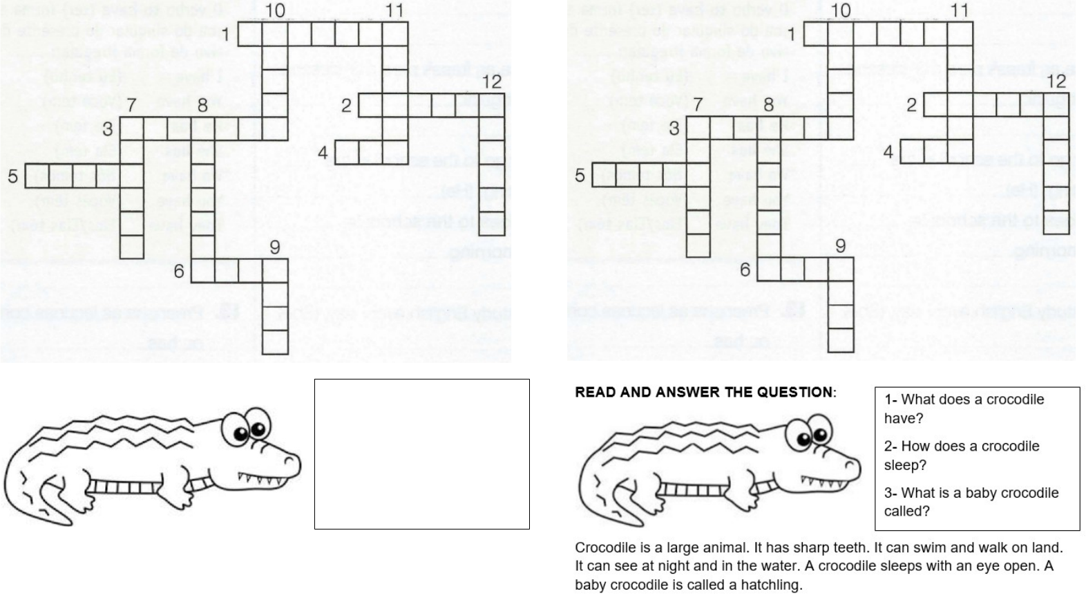 RESOLVA A CRUZADINHA USANDO OS VERBOS NA 3ª PESSOA DO SINGULAR DO PRESENTE DO INDICATIVO- SIMPLE PRESENT 1- to study 4- to have 7- to rush 10- to take 2- to dance 5- to play 8- to cross 11- to speak 3- to reach 6- to say 9- to sit 12- to smile READ AND ANSWER THE QUESTION: 1- What does a crocodile have? 2- How does a crocodile sleep? 3- What is a baby crocodile called? Crocodile is a large animal. It has sharp teeth. It can swim and walk on land. It can see at night and in the water. A crocodile sleeps with an eye open. A baby crocodile is called a hatchling. RESOLVA A CRUZADINHA USANDO OS VERBOS NA 3ª PESSOA DO SINGULAR DO PRESENTE DO INDICATIVO- SIMPLE PRESENT 1- to study 4- to have 7- to rush 10- to take 2- to dance 5- to play 8- to cross 11- to speak 3- to reach 6- to say 9- to sit 12- to smile