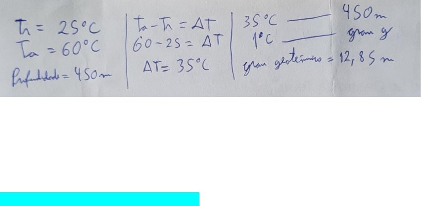 Universidade Federal do Piauí Centro de Ciências da Natureza Departamento de Biologia Disciplina: Geologia Primeira Avaliação Data 18/03/2021 Período Letivo: 2º/2021 Prof. Marco Antônio Aluno: Francisco Anderson da Silva Nascimento Questões 1 – Determine o grau geotérmico de um local onde foi encontrada água subterrânea em um poço tubular profundo com 450 metros de profundidade, a uma temperatura de 600C. Considere a temperatura média anual da região de 250C. 2 – Sobre a região da questão anterior, diga se a mesma é região estável ou instável do ponto de vista tectônico. R = Instável 3– Sobre a Cor e o Traço de um mineral podemos afirmar que: a) a cor é sempre igual ao traço b) a cor pode ser diferente do traço c) ambos dependem da impureza contida no mineral d) Nenhuma das respostas anteriores 4– A densidade dos materiais na superfície da Terra exibe valor em torno de 2,7. Sabendo que a densidade média do planeta é de 5,5, estabeleça um número para mostrar que a densidade aumenta para o interior da Terra. Sugestão: suponha a Terra composta por duas camadas e utilize uma média para o cálculo. 5 – Para que seja obtido o traço de um mineral, a placa deverá ter dureza conforme a alternativa abaixo: a) Dureza maior que a do mineral b) Dureza menor que a do mineral c) Dureza igual à do mineral d) A dureza da placa não é fator importante Nome da camada 2,7 3,0 35 200 900 6370 14 11 5,5 3,3 5100 2900 2000 8,5 2550 3000 5000 25 1000 1400 D e ns id a de P ro f u nd id a d e (k m ) T em pe ra tu ra ( ºC ) V e lo ci d a de o n da s p ( km /s ) Constituição litológica Incursão ao Centro da Terra Encontre, na figura, os pontos para as profundidades10km,28km,100km, 400km,1000km,4000km e 6000km. Em seguida, para cada uma dessas profundidades calcular também os valores de densidade e temperatura. 6 – Em uma incursão ao centro da Terra, calcule o valor da densidade e da temperatura dos materiais para a profundidade de 20 km. Para resolver esta questão considere que você encontrou, com a régua, uma medição de 3 cm entre os limites da primeira camada. 7 – Faça o mesmo cálculo da questão anterior para a profundidade de 4000 km. Para resolver esta questão considere que você encontrou, com a régua, uma medição de 2 cm entre os limites da quinta camada.
