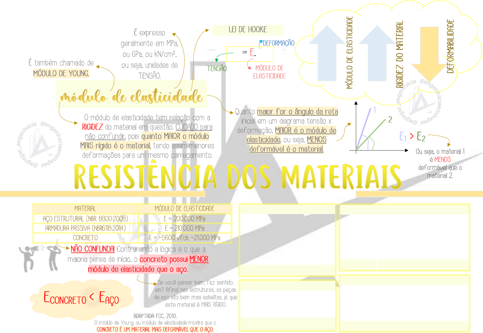 módulo de elasticidade Resistência dos materiais CEBRASPE, 2015 Na equação σ = E.e, quanto maior for o módulo de elasticidade, ou módulo de Young, identificado na equação por E, menor será a deformação elástica resultante da aplicação de uma mesma tensão de tração, pois esse módulo indica a rigidez do material. Gabarito: CERTA. CEBRASPE, 2010 O módulo de elasticidade de um material é uma medida da sua rigidez: quanto menor o módulo de elasticidade, mais rígido é o material e, consequentemente, menor será a sua deformação elástica quando submetido a tensão. Gabarito: ERRADA. CEBRASPE, 2013. De acordo com a Lei de Hooke, quanto maior a área da secção transversal e a rigidez do material, medida pelo módulo de elasticidade, maior será o seu alongamento. Gabarito: ERRADA. FUNDATEC, 2017. O aço é mais elástico do que o concreto, pois seu Módulo de Elasticidade é maior do que o Módulo de Elasticidade do Concreto. Gabarito: ERRADA. σ ε σ ε Referências deste mapa: Resistência dos materiais, para entender e gostar. Botelho; Resistência dos Materiais. Beer & Johnston A concepção estrutural e a Arquitetura. Rebello. flexão Resistência dos materiais flexão pura flexão simples flexão composta CEBRASPE, 2011 A flexão é considerada simples quando atuam conjuntamente o momento fletor e a força cortante, produzindo tensões normais e tangenciais na seção. Gabarito: CERTA. ADAPTADA CEBRASPE, 2018 As peças submetidas à flexão composta sofrem ação de flexão acompanhada de FORÇA NORMAL. Gabarito: CERTA. Referências deste mapa: Luiz Fernando Martha. Beer & Johnston.