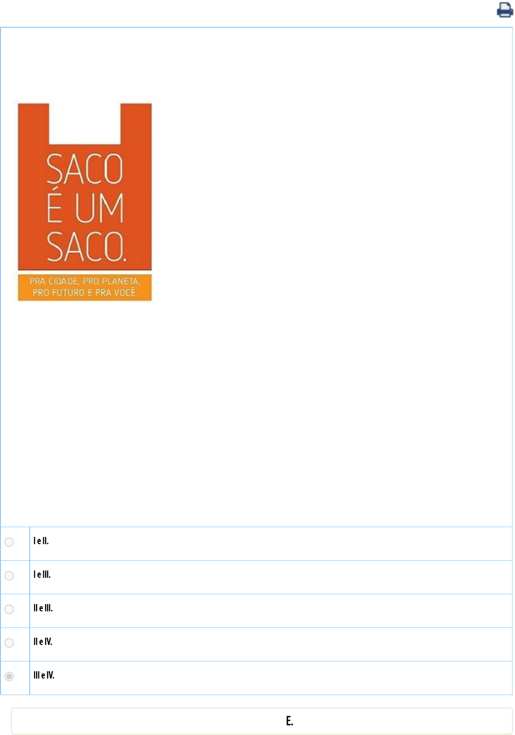 Em junho de 2009 o Ministério do Meio Ambiente lançou campanha para o consumo consciente de sacolas plásticas, que já atingem, aproximadamente, o número alarmante de 12 bilhões por ano no Brasil. Veja o slogan dessa campanha: O possível êxito dessa campanha ocorrerá porque I cumpriu-se a meta de emissão zero de gás carbônico estabelecida pelo Programa das Nações Unidas para o Meio Ambiente, revertendo o atual quadro de elevação das médias térmicas globais. II na confecção de sacolas plásticas deixaram de ser empregados materiais oxibiodegradáveis e os chamados bioplásticos que, sob certas condições de luz e de calor, se fragmentam. III foram adotadas, por parcela da sociedade brasileira, ações comprometidas com mudanças em seu modo de produção e de consumo, atendendo aos objetivos preconizados pela sustentabilidade. IV houve redução tanto no quantitativo de sacolas plásticas descartadas indiscriminadamente no ambiente, como também no tempo de decomposição de resíduos acumulados em lixões e aterros sanitários. Estão CORRETAS somente as a�rmativas A I e II. B I e III. C II e III. D II e IV. E III e IV. Você já respondeu e acertou esse exercício. A resposta correta é: E.