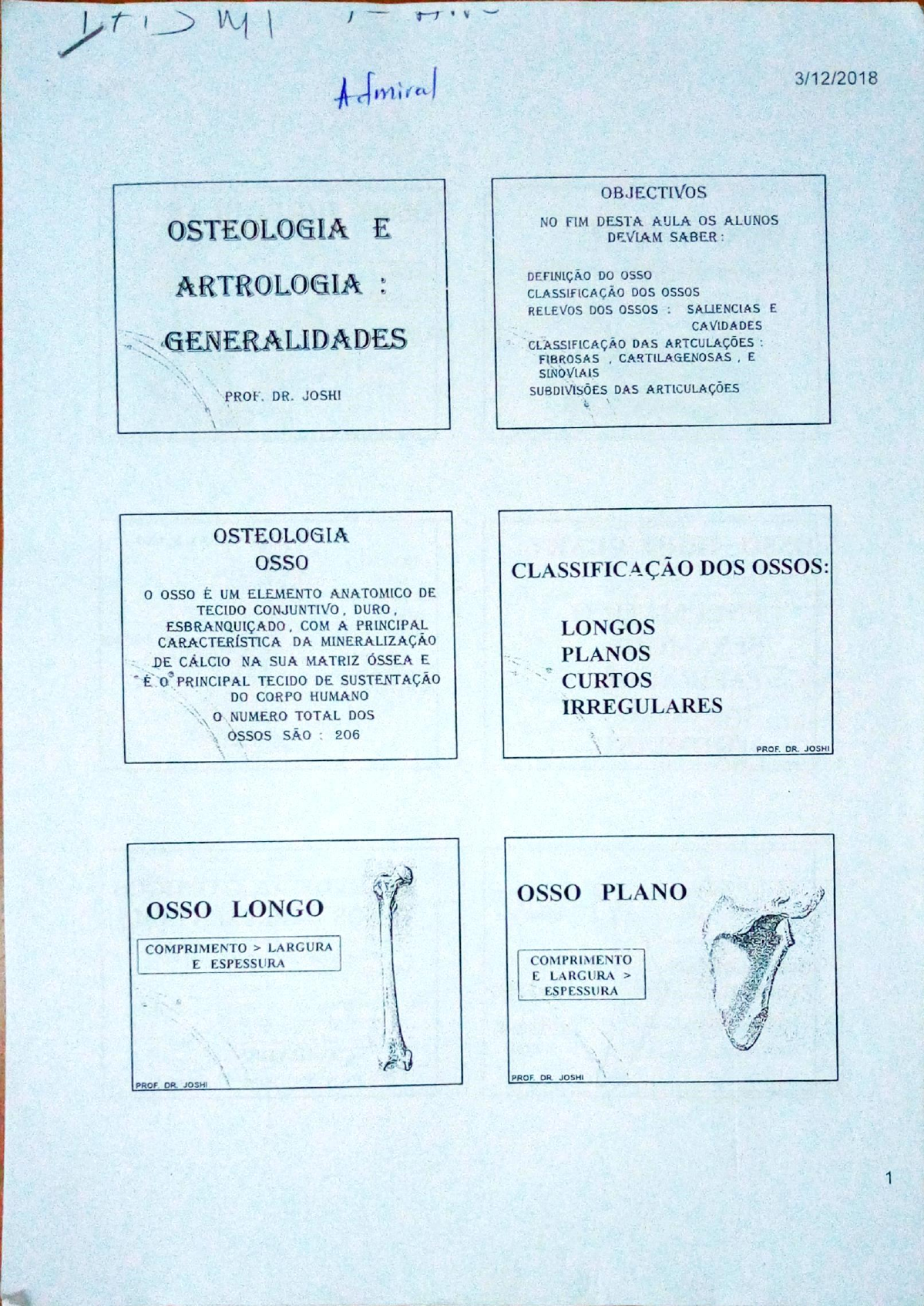 OSTEOLOGIA E ARTROLOGIA GENERALIDADES PROF. DR. JOSHI OSTEOLOGIA osso O OSSO É UM ELEMENTO ANATOMtCO DE TECIDO CONJUNTIVO, DURO , ESBRANQUIÇADO , COM A PRINCIPAL CARACTERÍSTICA DA MINERALIZAÇÃO DE CÁLCIO NA SUA MATRIZ ÓSSEA E O'PRINCIPAL TECIDO DE SUSTENTAÇÃO DO CORPO HUNtANO O NUMERO TOTAL DOS Ossos SÃO : 206 OSSO LONGO COMPRIMENTO > LARGURA E ESPESSURA PROE OR JOSH 3/12/2018 OBJECTIVOS NO FIM DESTA AULA OS ALUNOS DEVIAM SABER : DEFINIÇÃO DO OSSO CLASSIFICAÇÃO DOS OSSOS RELEVOS DOS OSSOS . SALIENCIAS E CAVIDADES CLASSIFICAÇÃO DAS ARTCULAÇÓES FIBROSAS , CARTILAGENOSAS , E SINOVIAIS SUBDIVISÕES DAS ARTICULAÇÕES CLASSIFICAÇÃO DOS OSSOS: LONGOS PLANOS CURTOS IRREGULARES PROF. OR- JOSHI OSSO PLANO COMPRIMENTO ESPESSURA PROE JOSHI 1 OSSO CURTO OSSO IRREGULAR • PNEUMÁTICO SESAMOID PAPIRACIO RADIÁRIO WORMIANO PROE OR JOSH OSSOS LONGOS POSSUEM: PROV EPÍFISE PROXIMAL DIÁFISE EPÍFISE DISTAL OSSO IRREGULAR Mistura de 2 grupos n."Ñ0 osso IRREGULAR ossos (CARPO} OSSOS LONGOS (SIESIB"ROS) RELEVOS ANATOMICOS OSSOS APRESENTAM : SALIÊNCIAS CAVIDADES 2 3/12/2016 SALIÊNCIA ARTICULAR CAVIDADE PROF SALIÊNCIA NÃO ARTICULAR CAVIDADE ARTICULAR CAVIDADE NÃO ARTICULAR Crista Processo (Apófise) Liph4 Trocanter Maleolo Saliência estreita e alongada. Es : Occipital interna e externa, crista iliaca , obturador Proeminência óssea marcante Ex : odontoidea, mastoidea, Olecraneana, Estiloide, zigomática, acromial Bordos menosa proeminentes Ex: Miloidea, áspera do fémur Apófise massiva E,x: Fémur Lx: Tibia c Fibula Epicôndilo Projecção acima dc um côndilo PROE JOSH' Some Eminência Espinha ubércolo ade Protuberánkia Nome Cabeça Côndilos Troclea Definição e exemplos Saliência difusa.proeminência óssea difusa cnenos marcante E-v: Parietal. Frontal Saliência mais elevada que bossa.com base bem delimitada ú: Arquata, Mentoniana, Mamilares, itiopúbicn Projeccio delgada e pontiaguda Ei : Spix. Nasal. Ilíaca Proeminência pequena e arredonda E': Conoide , Zi atico costal , escaleno Proeminência grande e arredonda EN: Deltoidea, Biccipital. Glútea Elevaçae maior que tuberosidade Occipital intcrna C externa Definiçáo c exemplo Uma extremidade articular globosa reoonda e Metacarpo articular de grande dc aspecto Arredondado. Ex: Mandíbula, Occipital, Fémur Projecçao articular Com forma dc roldana Es: número. Talo, Falanges 3 3112120 Nome Fosscta Glenoidea Acetabular DefiniÇáo e Exemplo Pequena depressão articular Ex: Atlas e Radial Cavidade superficial mais ou menos oval ou redonda,.Ex: Temporal, Atlas, Escapula , Tíbia Cavidade profunda E,x: Coxal Nome Fóvea Vossa Sulco Seios DefiniÇáo c Exemplo Depressio pequena, Ex: Cabeça do Fémur Depressao grande , Fax: Pituitária (esfenóide , Dcprcssho alongada na forma de linha , Lx, Sulco Bicipital Cavidade ou espaço oco, Lx; Canal Pequena passagem tubular Fax: Optico , Hipoglosso. pterigoideo Foramen Buraco de transmissão, para .AJyéolo Fissura passagem de vasos e nervos. Ex . Oval , Redondo , Estilomastoide Fosso ou encaixe profundo. Ex:AIveolo dentário Abertura estreita tipo incisio Ex. Fissura orbital superior ESQUELETO o CONJUNTO Dos ossos QUE SÃO UNINDOS ENTRE SE POR INTERMÉDIO DAS ARTICULAÇÕES NA SUA POSIÇÃO ANATOMICA BURACOS ( FORAMENS ) FORAME NUTRíC1 FORAMEN DE TRÂNSMISSÁO TODOS OS OSSOS DO ESQUELETO ARTICULAM SE ENTRE SI , COM EXCEPÇÃO DO Osso HIÓIDE 4 3/12/2018 DIVISÃO DO ESQUELETO ESqUELETO AXIAL PROF.OR ESQUELETO AXIAL DIVISÃO AXIAL APENDICULAR OTAL NUMERO DOS ossos 80 126 206 APENDICULAR REGIÃO CRÁNEO NEUROCRANEO FACE VISCEROCRANEO PESCOÇO TÓRAX ABDOMEN JOTAL NUMERO DOS ossos 14 14 08 37 7 80 REGIÃO MEMBRO SUPERIOR MEMBRO INFERIOR TOTAL NUMERO DOS ossos 64 62 126 NEURO CRANEO OS OSSOS DO CRÁNEO FRONTAL ETMÓIDE ESFENÓIDE OCCIPITAL PARIETAIS TEMPORAIS ossrcueos TOTAL 1 1 1 1 2 2 6 VISCERO CRANEO OS OSSOS DA FACE MAXILA 2 ZIGOMATICO 2 NASAL 2 LACRIMAL 2 PALATINO 2 CORNETO INFERIOR 2 VOMER 1 MANDIBULA 1 TOTAL 14 5 PESCOÇO TORAX VERTEBRAS CERVICAIS HIOIDE 1 TOTAL 8 ABDOMEN VERTEBRAS LOMBARES s SACRO 1 cocxx 1 TOTAL 7 MEMBRO SUPERIOR VERTEBRAS TORACICAS 12 COSTELAS 24 ESTERNO 1 TOTAL MEMRO SUPERIOR CINTURA ESCAPULAR BRAÇO ANTE - BRAÇO MÃO — CARPOS METACARPOS FALANGES TOTAL TOTAL (2 LADOS ) 2 1 2 8 5 14 32 64 MEMRO INFERIOR REGIÃO CINTURA ESCAPULAR (2) BRAÇO (1) ANTE-BRACO (2) MÃO TOTAL ossos ESCÁPULA CLA VICULA ÚMERO ULNA RADIO CARPOS (8) METACARPOS (5) FALANGES (14) 32 CINTURA PELVICA COXA PERNA PE — TARSOS METATARSOS FALANGES TOTAL TOTAL (2 UDOS ) 1 2 2 7 5 14 31 62 6 3/12/2018 MEMBRO INFERIOR APENDICULAR REGIÄO CINTURA PEI-VICA (1) COXA (Z) PERNA (2) TOTAt. ossu CORAL FEMUR PATEL-A TiBlA FiBUL.A TARSOS (7) METATARSOS (5) FALANGES (14) 31 REGIÄO MEMBRO SUPERIOR MEMBRO INFERIOR TOTAL NUMERO OOS ossos 64 62 126 ESQUELETO DIVISÄO AXIAL APENDICULAR TOTAL NUMERO DOS ossos 80 126 206 ARTICULACÖES 3 GRUPOS . ARTROLOGIA SLNDESMOLOGIA PROF. DR. JOSHI TIPOS DE ARTICULACÖES FIBROSAS FIBROSO CARTILAGINOSO SINOVIAL OR JOSHI 7 TIPOS DE ARTICULAÇÕES CARTILAGINOSAS ARTICULAÇÕES GRUPO FIBROSO CARTILAGI koso SINOVIAL NOME MOBILIDADE ANTIGO SINFIBROSE IMOVEL ANFIARTROSE SEMIMOVEL DIARTROSE MOVEI ARTICULAÇÕES GRUPO FIBROSO SUTURAS Plana Dentada Escamosa Esquindilase TIPOS DE ARTICULAÇÕES SINOVIAIS ARTICULAÇÕES GRUPO FIBROSO • SUTURA SINDESMOSE • GONFOSE PROF. OR JOSH' SUTURAS Plana Inter nasal Dentada Sagital Esca mosa Temporo . Parietal Esquindilase Esfeno - Vomeriana 8 3/12/2018 SUTURAS (TIPOS) TIPOS DE SUTURAS DE TADA PLANA ESCAMOSA ESCAMOSA ESQUINDILESE INTERPARIVTAL) (TEMPORO-PARIETAL SINDESMOSE GONFOSE TiBIA FiBULA (EPÍFISE (EPÍFISE DISTAL) DISTAL TECIDO FIBROSO INTERPOSTO EM GRANDE QUANTIDADE ARTICULAÇÕES CARTILAGINOSAGRUPO CARTILAGINOSO SINFISE SINFISE PUBICA ANFIARTROSE : INTERVERTEBRAL SINCONDROSE SACRO PROF OR JOSH' Sinfise úbica 3/12120i8 GRUeo SINOVIAI- CARACTF.RISTICAS GERAIS • MtMBRANA SINOVIAL • CAVIDADE ARTICULAR • SUPERFICIES ARTICULA