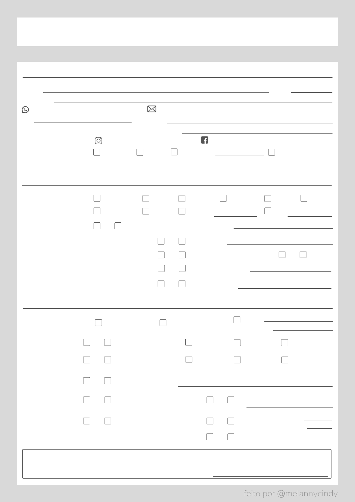 Como nos encontrou? Redes sociais Anúncios Indicação/Quem? Outros Dados Pessoais Redes Sociais: (Opcional) / / Ficha de Anamnese Capilar Nome: Idade: Endereço: Fone: E-mail: RG: CPF/CNH: Data de nasc.: Profissão: Motivo da visita: Histórico Neoplasias/Câncer Outras Diabetes Doenças Vasculares Doenças Dermatológicas Doenças Hepáticas Doenças Cardíacas Doenças Neurológicas Doenças Autoimunes Doenças Endócrinas S N Está em algum tratamento médico? S N Já fez tratamento capilar anteriormente? Possui quelóide ou histórico de má cicatrização? Hábitos de Vida Está tomando algum medicamento? Antibiótico Anti-inflamatório Anticoncepcional Reposição Hormonal Outros Há quanto tempo? É fumante? S N Costuma tomar sol? ExposiçãoIntensa Exposição Moderada Pouca Exposição S N Ingere bebida alcoólica? Com frequência Raramente Não bebo Pratica atividade Física? S N Seu intestino é regular? S N S N Se não, por quê? Possui alguma patologia? A patologia está ativa? Possui histórico alérgico? S NPassou por alguma cirurgia recentemente? Se sim, qual? Ingere a quantidade suficiente de água? Se sim, descreva qual e com que frequência: Considera sua alimentação balanceada? Afirmo a veracidade de todas as informações fornecidas acima e. comprometo-me a avisar ao profissional sobre qualquer alteração sobre meu histórico, situação de saúde e hábitos de vida durante o decorrer do tratamento. / /, Ass. do paciente: Se sente estressado com frequência? S N Considera ter um sono de qualidade? S N feito por @melannycindy S N Que horas costuma dormir? Que horas costuma acordar? S N Qual e há quanto tempo? Passou por alguma doença inflamatória recente? S N Se sim, qual? (ex. COVID) Há quanto tempo? Tem ou já teve o hábito de puxar ou arrancar os fios de cabelo? S N Licenciado para - M aria - 06365063393 - P rotegido por E duzz.com Cuidados em casa S N S N Dia sim, dia não 2 vezes por semanaLava o cabelo com que frequência? 1 vez por semanaou menosDiariamente S N Avaliação Profissional / /, Ass. do paciente: Se sim, qual ou quais? Há outras informações que julga importante mencionar? Quer iniciar um tratamento por algum motivo específico? Se sim, qual ou quais? Campo destinado à mulheres: S N Ciclo menstrual regular? Se sim, quantas semanas? Data do último ciclo: / / Caso tenha filhos, quando foi sua última gestação ? S N S N S N S N S N Dermatite seborreica Eczema Ptiríase Psoríase Quebra de fios Miniaturização de fios Queda de fios (mais de 100/dia) Crescimento lento (< 1cm/mês) Densos Esparsos Lisos (mongolóides) Ondulados ou cacheados (caucasianos) Crespos (elicoidal) Forma dos fios Oleosidade normal Seco Oleoso Misto Oleosidade Alopecias Se adapta bem ao seu cabelo? feito por @melannycindy Usa algum produto específico para o cabelo? Faz alguma suplementação oral? Esse campo será preenchido pelo profissional Afirmo a veracidade de todas as informações fornecidas acima e. comprometo-me a avisar ao profissional sobre qualquer alteração. Concordo com as avaliações feitas pelo profissional. Está gestante? Tem ou teve alguma forma de aplique ? Fica com o cabelo preso com frequência? Dorme ou prende o cabelo molhado? Faz uso de produtos químicos no cabelo? Dermatopatologias Características do fio DensidadeAfecções do fio Não cicatriciais Eflúvio Telógeno Puerpério Emagrecimento Cirurgia recente Deficiencia de ferro/ zinco Pós COVID Estados estressantes prolongados Uso de medicamentos (antioagulantes, anticonvulsionantes, antibióticos, captopril, isotretinoina, propanolol...) Doenças sistêmicas (lupus, anemia grave, diabetes mellitus, disfunções da tireóide, hepatites As possíveis causas estão ativas? Há quanto tempo está em queda? S N Licenciado para - M aria - 06365063393 - P rotegido por E duzz.com / /, Ass. do paciente: Alguma outra observação? As possíveis causas estão ativas? S N feito por @melannycindy Concordo e reafirmo o relatório profissional acima. Alopecia Areata Placa única ou unifocal Placas múltiplas/ multifocal Ofiásica (acomete laterais) Reticular (topo) Total (couro cabeludo ou corpo todo) Difusa (acomete frontal) Há quanto tempo está em acometimento? Alopecia Androgenética Escala de Ludwig e SavinEscala de Norwood-Hamilton Alopecias Cicatriciais Congênita Infecciosa Neoplásica Agentes Físicos Dermatoses (origens incertas/síndromes) Diagnósticos, exames (laboratoriais, tricograma, hormônios) Licenciado para - M aria - 06365063393 - P rotegido por E duzz.com Rota de Tratamento / /, Ass. do paciente: Proposta de Tratamento: Home Care Proposto: Acompanhamento das sessões: ___/___/____ ___/___/____ ___/___/____ ___/___/____ ___/___/____ ___/___/____ ___/___/____ ___/___/____ ___/___/____ ___/___/____ ___/___/____ ___/___/____ Data Procedimento Observações Ass. do paciente feito por @melannycindy Declaro ter sido informado(a) sobre todos os procedimentos realizados, afirmo estar ciente de todas os benefícios, riscos, indicações, contraindicações, recomendações e reações esperadas durante a evolução do tratamento. Assim como comprometo-me a seguir todas as orientações do(a) profissional. Licenciado para - M aria - 06365063393 - P rotegido por E duzz.com