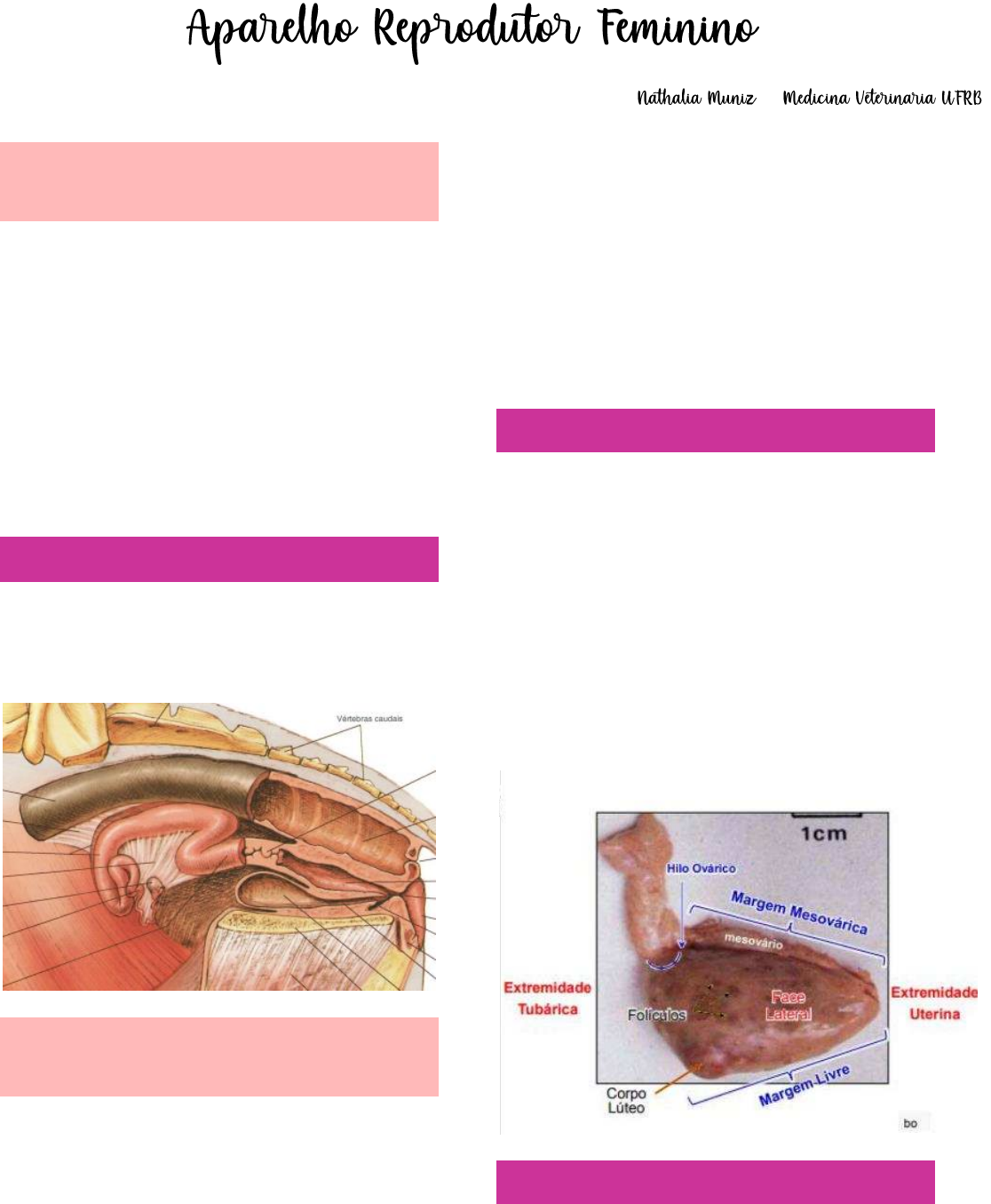 Composição anatômica - Ovários - Tubas uterinas - Útero - Vagina - Vestíbulo da vagina Partes genitais externas: vulva e clitóris ** Em coelhos e lebres o septo se estende até a estrutura da cérvice separando totalmente os cornos uterinos em duas partes. Situação anatômica - É o órgão intermediário, entre reto/cólon descendente dorsalmente e bexiga/uretra ventralmente. Ovários - Órgãos pares - Formação de gametas - Região cortical e medular - Localização: intra-abdominal e sub-lombar (varia entre as espécies domésticas), geralmente no interior da cavidade corpórea. - Origem: caudal aos polos caudais dos rins. - Podem apresentar tamanhos diferentes em um mesmo animal. - Superfície relativamente lisa no animal jovem e irregular quando chega na puberdade. - Tornam-se gradativamente fibrosos com o avanço da idade e há regressão de tamanho também. - Posição e forma variadas entre as espécies domésticas: em éguas, por exemplo, há uma inversão do parênquima; - Também vareia de acordo com o estado funcional da fêmea: puberdade, gestação e pós- parto. Limites anatômicos Duas faces: lateral e medial. A lateral está voltada para parede lateral da cavidade pélvica. Duas margens: livre e mesovárica Duas extremidades: - Extremidade tubárica (cranial): relacionada ao infundíbulo da tuba uterina - Extremidade uterina (caudal): onde se fixa o ligamento próprio do ovário, conectando o ovário ao corno do útero correspondente. Estrutura geral Túnica albugínea: envolve todo o ovário Hilo ovárico: chegada e saída de estruturas: artéria ovárica, veia ovárica, ductos linfáticos e nervos que vão chegar no estroma/medula. – Córtex (zona parenquimatosa externa; função germinativa) e medula (zona vascular interna). - Em éguas, há uma inversão do parênquima, em que a medula se encontra internamente e o córtex externamente, fazendo com que sua superfície seja lisa, diferente das demais espécies em que sua superfície é irregular. Com isso, é observado uma fossa de ovulação em sua extremidade, que é o local pelo qual a égua irá liberar o seu ovócito maduro. Folículos: primários, secundários, terciário ou de Graaf que irá se romper e liberar o ovócito. Quando este folículo terciário se rompe, forma-se o corpo hemorrágico e depois, por altos níveis de LH, torna-se uma estrutura temporária, o corpo lúteo. Corpo lúteo: é uma glândula endócrina cordonal, que secreta progesterona e estrógeno para manter o ovócito, e dar início a gestação caso haja a fecundação. Corpo albicans: regressão do corpo lúteo caso não haja fecundação. Meios de fixação Pendentes a cada lado da coluna vertebral pelo mesovário (margem cranial do ligamento largo do útero ou mesométrio). - Fixados ao útero pelo ligamento próprio do ovário, que conecta o ovário ao corno do útero. - Fixados a tuba uterina pelo ligamento tubo-ovarico. Ligamento suspensório do ovário - Presente apenas em carnívoros - Prega de peritônio que se estende entre o ovário e a fáscia transversal (camada de peritônio que recobre as paredes abdominais) junto a margem caudal da última costela (13ª). - Continua-se como ligamento próprio do ovário Bolsa ovariana - Formada pela união do mesovário e mesossalpinge (uma prega que sustenta a tuba uterina e é derivada do ligamento largo do útero). - Envolve o ovário totalmente na porca e cadela e parcialmente na égua, gatas e fêmeas de ruminantes. - Abertura da bolsa ovariana - Para a cirurgia de castração, é preciso dissecar todo o tecido da bolsa ovariana para encontrar o ovário, sendo que não deve ficar nenhum resquício de tecido ovariano, para que não haja ovário remanescente. 1, ovário; 2, infundíbulo da tuba; 3, ampola da tuba; 4, istmo da tuba; 5, corno uterino; 6, mesovário; 7, mesossalpinge; 8, mesométrio; 9, seta indica a entrada da bolsa ovárica. Carnívoros Situação: posição sublombar, próximo a 13ª costela e L1 e L2. Faz relação também com os músculos sublombares e se encontra caudal aos polos caudais do rim. Pedículo vascular: ramos da artéria ovariana e uterina, provenientes da aorta abdominal. (A) cadela, (B) gata Égua Situação: dorsal a cavidade abdominal e cranioventralmente às asas do ílio, próximo a entrada cavidade pélvica na altura de L5. Características: - Formato de feijão, proporcionalmente grandes. - Apresentam a fossa de ovulação na borda livre e possui córtex/medula invertidos. Vaca Situação: está cranial a entrada da pelve, no limite entre cavidade abdominal e pélvica. O útero irá sofrer uma ventroflexão arrastando também os ovários para entrada da pelve e lateralmente ao pécten do osso púbis, geralmente relacionados com a parte ventral do corpo do ílio, próximos ao nível de bifurcação dos cornos do útero. Características: - Proporcionalmente pequenos em relação ao tamanho do animal (muito menores do que os da égua), não guardando relação de proporção com o corpo do animal. - Ovalados, com uma extremidade uterina pontiaguda. - A extremidade mais angulada fica voltada para tuba uterina, enquanto a mais aberta volta-se para o útero. Porca Situação: intermediária, poucos centímetros lateroventralmente a entrada da pelve, próximo ao flanco ou fossa paralombar. Características gerais: - Hilo distinto - Superfície irregular e lobulada com muitos folículos e corpos lúteos. Formato de amora/cacho de uva. - A porca pode ovocitar mais de uma vez - A gestação é bicornual, onde há conceptos em ambos os cornos uterinos. Tubas uterinas Antigas trompas de falópio, ovidutos ou salpinges. - Fixadas a mesossalpinge - Continuidade direta com os ovários e parcialmente em contiguidade através do óstio abdominal da tuba uterina. Esse óstio faz a comunicação da tuba uterina com a cavidade abdominal, porém, essa comunicação só será permitida em condições de cio e parto, que é quando a cérvice uterina se abr