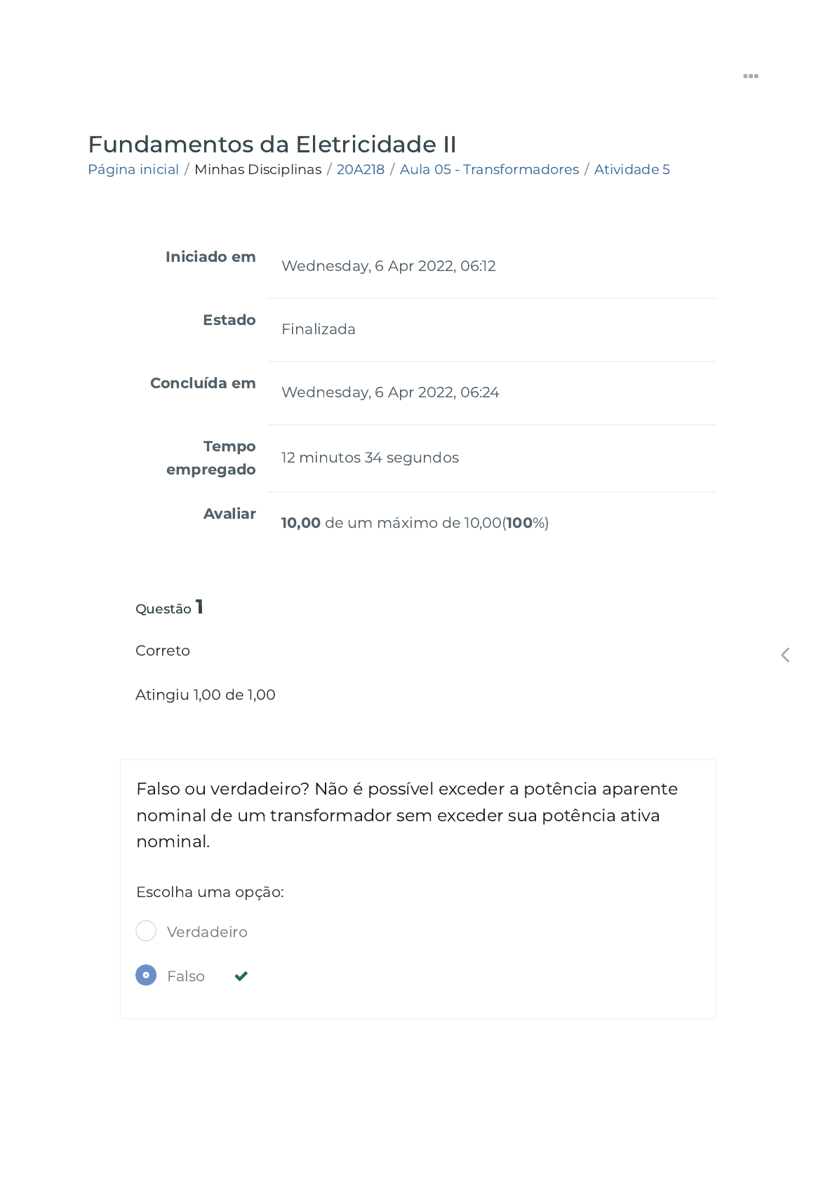 06/04/2022 06:24 Atividade 5 https://ava.politecnicabr.com.br/mod/quiz/review.php?attempt=2854631 1/7 Página inicial / Minhas Disciplinas / 20A218 / Aula 05 - Transformadores / Atividade 5 Fundamentos da Eletricidade II Iniciado em Wednesday, 6 Apr 2022, 06:12 Estado Finalizada Concluída em Wednesday, 6 Apr 2022, 06:24 Tempo empregado 12 minutos 34 segundos Avaliar 10,00 de um máximo de 10,00(100%) Questão 1 Correto Atingiu 1,00 de 1,00 Falso ou verdadeiro? Não é possível exceder a potência aparente nominal de um transformador sem exceder sua potência ativa nominal. Escolha uma opção: Verdadeiro Falso https://ava.politecnicabr.com.br/ https://ava.politecnicabr.com.br/course/view.php?id=955 https://ava.politecnicabr.com.br/course/view.php?id=955#section-8 https://ava.politecnicabr.com.br/mod/quiz/view.php?id=30548 https://ava.politecnicabr.com.br/ 06/04/2022 06:24 Atividade 5 https://ava.politecnicabr.com.br/mod/quiz/review.php?attempt=2854631 2/7 Questão 2 Correto Atingiu 1,00 de 1,00 Qual é a e�ciência de um transformador que requer 1880 W de potência no primário para fornecer 1730 W de potência no secundário? Escolha uma opção: a. 85% b. 92% c. 95% d. 88% e. 98% https://ava.politecnicabr.com.br/ 06/04/2022 06:24 Atividade 5 https://ava.politecnicabr.com.br/mod/quiz/review.php?attempt=2854631 3/7 Questão 3 Correto Atingiu 1,00 de 1,00 Quais tipos de transformadores usam núcleos de ferro laminado? Escolha uma opção: Questão 4 Correto Atingiu 1,00 de 1,00 Falso ou verdadeiro? A relação de espiras é igual à relação de tensão em um transformador com acoplamento de 100%. Escolha uma opção: a. Transformadores de Tensão e Corrente b. Transformadores de potência e Transformadores de corrente c. Transformadores de potência e transformadores de áudio. d. Transformadores de áudios e Transformadores de corrente e. Transformadores de CA e CC Verdadeiro Falso https://ava.politecnicabr.com.br/ 06/04/2022 06:24 Atividade 5 https://ava.politecnicabr.com.br/mod/quiz/review.php?attempt=2854631 4/7 Questão 5 Correto Atingiu 1,00 de 1,00 Falso ou verdadeiro? Em um transformador abaixador, a tensão no secundário é maior que a tensão no primário. Escolha uma opção: Questão 6 Correto Atingiu 1,00 de 1,00 Relacione: O enrolamento especi�cado pelo fabricante como o primário pode ser usado como secundário? O coe�ciente de acoplamento pode ser superior a 1? Verdadeiro Falso Sim Não https://ava.politecnicabr.com.br/ 06/04/2022 06:24 Atividade 5 https://ava.politecnicabr.com.br/mod/quiz/review.php?attempt=2854631 5/7 Questão 7 Correto Atingiu 1,00 de 1,00 Falso ou verdadeiro? A carga resistiva no secundário de um transformador é re�etida para o primário como uma corrente em fase com a tensão. Escolha uma opção: Questão 8 Correto Atingiu 1,00 de 1,00 Falso ou verdadeiro? A força magnetizante devido à corrente no secundário se opõe à força magnetizante devido à corrente no primário. Escolha uma opção: Verdadeiro Falso Verdadeiro Falso https://ava.politecnicabr.com.br/ 06/04/2022 06:24 Atividade 5 https://ava.politecnicabr.com.br/mod/quiz/review.php?attempt=2854631 6/7 Questão 9 Correto Atingiu 1,00 de 1,00 Falso ou verdadeiro? A relação espiras por volt do primário é geralmente maior para um transformador de 2 kW do que para um transformador de 50 W. Escolha uma opção: Questão 10 Correto Atingiu 1,00 de 1,00 Falso ou verdadeiro? Com acoplamento de 100%, a relação espiras por volt do primário deve ser menor que a relação espiras por volt do secundário. Escolha uma opção: Verdadeiro Falso Verdadeiro Falso https://ava.politecnicabr.com.br/ 06/04/2022 06:24 Atividade 5 https://ava.politecnicabr.com.br/mod/quiz/review.php?attempt=2854631 7/7 © 2022 - Escola Politécnica Brasileira Entre em Contato https://www.politecnicabr.com.br 0800 084 2627 indisponível devido a pandemia de COVID-19, use outro canal! 0800 084 2627 comercial@politecnicabr.com.br Links Úteis Dicas da nossa Diretora Acadêmica Planner de Estudos Declaração de Matrícula Orientações do AVA Abertura de Ticket Fale com o Tutor Cronograma de Estudos Manual de Estágio Manual de Competência Siga-nos nas redes sociais https://ava.politecnicabr.com.br/mod/quiz/0 https://www.politecnicabr.com.br/ mailto:comercial@politecnicabr.com.br https://soundcloud.com/user-501638417/sets/escola-politecnica-brasileira https://storage.googleapis.com/sirius-pubstore/semestre_plannerdeestudo%20poli.pdf https://storage.googleapis.com/sirius-pubstore/declaracao_matricula.pdf https://storage.googleapis.com/sirius-pubstore/orientacoes_ava.pdf https://storage.googleapis.com/sirius-pubstore/abertura_ticket.pdf https://storage.googleapis.com/sirius-pubstore/fale_com_tutor.pdf https://storage.googleapis.com/sirius-pubstore/cronograma_estudos.pdf https://storage.googleapis.com/sirius-pubstore/manual_estagio.pdf https://storage.googleapis.com/sirius-pubstore/manual_competencia.pdf https://www.facebook.com/politecnicabr https://www.instagram.com/politecnicabr_oficial https://ava.politecnicabr.com.br/