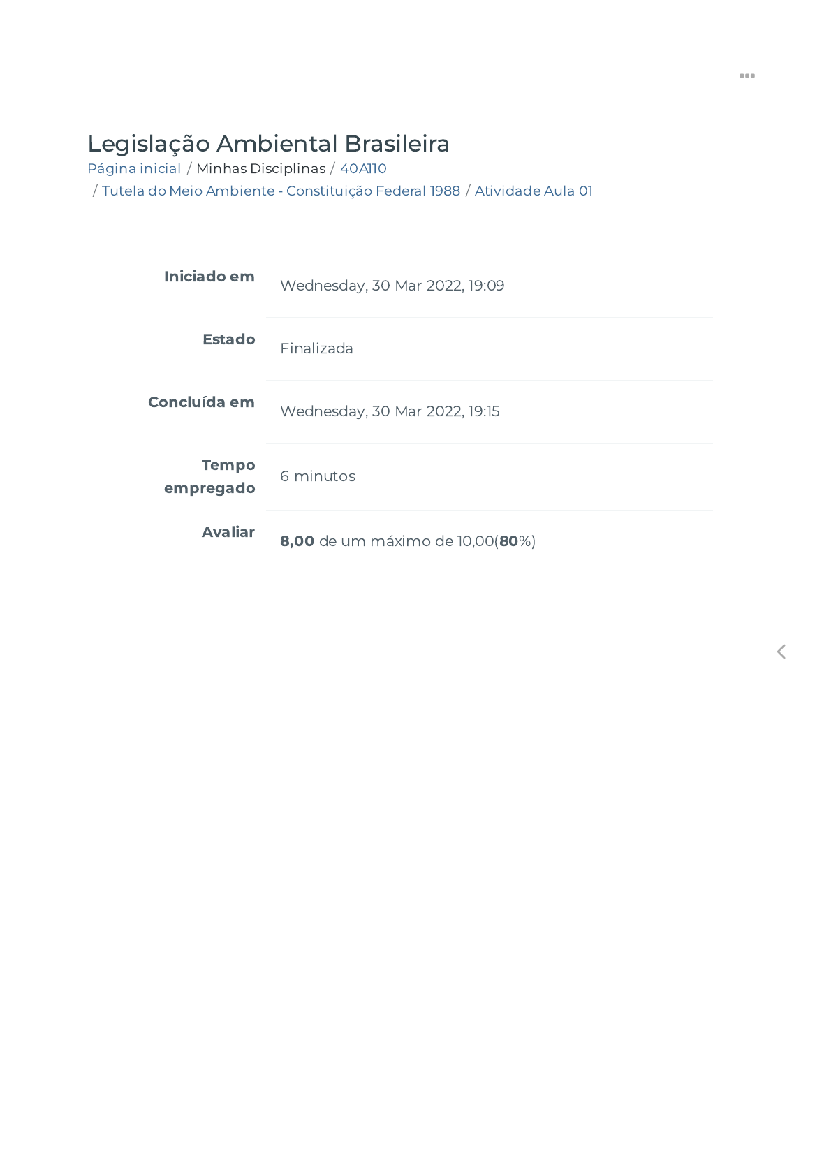 30/03/2022 19:15 Atividade Aula 01 https://ava.politecnicabr.com.br/mod/quiz/review.php?attempt=2828333 1/7 Página inicial / Minhas Disciplinas / 40A110 / Tutela do Meio Ambiente - Constituição Federal 1988 / Atividade Aula 01 Legislação Ambiental Brasileira Iniciado em Wednesday, 30 Mar 2022, 19:09 Estado Finalizada Concluída em Wednesday, 30 Mar 2022, 19:15 Tempo empregado 6 minutos Avaliar 8,00 de um máximo de 10,00(80%) https://ava.politecnicabr.com.br/ https://ava.politecnicabr.com.br/course/view.php?id=1051 https://ava.politecnicabr.com.br/course/view.php?id=1051#section-3 https://ava.politecnicabr.com.br/mod/quiz/view.php?id=33890 https://ava.politecnicabr.com.br/ 30/03/2022 19:15 Atividade Aula 01 https://ava.politecnicabr.com.br/mod/quiz/review.php?attempt=2828333 2/7 Questão 1 Correto Atingiu 2,00 de 2,00 O meio ambiente caracteriza-se por interesse difuso, pois trata de interesses dispersos por toda a comunidade e apenas ela, enquanto tal, pode prosseguir, independentemente determinação de sujeitos. Quais demais direitos podem ser considerados difuso (3ª geração) como o Meio Ambiente. Marque a alternativa ou alternativas corretas: Escolha uma opção: a. direito a paz. b. direito de comunicação. c. direito a qualidade de vida. d. todas as alternativas anteriores estão corretas. https://ava.politecnicabr.com.br/ 30/03/2022 19:15 Atividade Aula 01 https://ava.politecnicabr.com.br/mod/quiz/review.php?attempt=2828333 3/7 Questão 2 Correto Atingiu 2,00 de 2,00 A Constituição Federal, ao estabelecer o direito de todos ao meio ambiente ecologicamente equilibrado, quali�ca-o como: Marque a alternativa correta. Escolha uma opção: a. Bem de Uso Comum do Povo. b. Bem de Uso Comum e Sustentável. c. Bem Comum e do Desenvolvimento sustentável. d. Nenhuma das alternativas anteriores. https://ava.politecnicabr.com.br/ 30/03/2022 19:15 Atividade Aula 01 https://ava.politecnicabr.com.br/mod/quiz/review.php?attempt=2828333 4/7 Questão 3 Correto Atingiu 2,00 de 2,00 Marque a alternativa correta quanto a relação do Direito Ambiental com o Direito Penal. Escolha uma opção: a. a responsabilidade por dano ambiental alcança o Direito Penal, conforme disposto no § 3º do art. 225 da CF/88 e nº § 1º do art. 14 da Lei nº 6.938/81. A Lei nº 9.605, de 12-2-1998, estabelece os crimes ambientais, embora outras normas também instituam crimes especí�cos, correlatos às questões ambientais, como, por exemplo, a Lei nº 6.766, de 19-12-1979, que trata do parcelamento do solo urbano. b. na formulação do Direito Ambiental, o Direito Processual é instrumento não apenas de reparação de danos, e obrigação de fazer e não fazer por meio de ação especí�ca – Ação Civil Pública –, como de outras formas de buscar, no Poder Judiciário e na Administração Pública (processo administrativo), preventivamente ou não, a tutela do ambiente. c. os órgãos e entidades da Administração Pública competentes para tratar das questões ambientais encontram-se estruturados no Sistema Nacional de Meio Ambiente (SISNAMA). Independentemente de sua natureza jurídica – órgão colegiado, fundação, autarquia, empresa etc. –, a sua atuação é pautada pelo art. 37 da CF/88, que trata da Administração Pública. d. nenhuma das alternativas anteriores. https://ava.politecnicabr.com.br/ 30/03/2022 19:15 Atividade Aula 01 https://ava.politecnicabr.com.br/mod/quiz/review.php?attempt=2828333 5/7 Questão 4 Correto Atingiu 2,00 de 2,00 Com relação ao Caput 225 da Constituição Federal de 1988, a determinação de que a responsabilidade de defender e preservar o meio ambiente é: Marque a alternativa correta. Escolha uma opção: a. única e exclusivamente do Poder Público. b. apenas do Judiciário. c. do poder público e da coletividade. d. nenhuma das alternativas estão corretas. https://ava.politecnicabr.com.br/ 30/03/2022 19:15 Atividade Aula 01 https://ava.politecnicabr.com.br/mod/quiz/review.php?attempt=2828333 6/7 Questão 5 Incorreto Atingiu 0,00 de 2,00 Esses valores intrínsecos dizem respeito a vários aspectos, de acordo com o tipo de interesse que incide sobre os bens ambientais. Marque a alternativa correta referente ao interesse coletivo. Escolha uma opção: a. determinados grupos, cujos membros são identi�cáveis, como as populações indígenas, possuem direitos especí�cos sobre os bens ambientais. b. a sociedade, sem qualquer identi�cação de seus indivíduos, tem o direito à qualidade dos bens ambientais. c. dos recursos ambientais sobre esses bens, na sua apropriação, com vistas à consecução dos objetivos de suas atividades públicas ou particulares, sempre submetidos às regras estabelecidas. d. os Entes Federados são responsáveis pela gestão, proteção e guarda dos bens ambientais, para as atuais e as futuras gerações. Entre em Contato https://www.politecnicabr.com.br 0800 084 2627 indisponível devido a pandemia de COVID-19, use outro canal! Links Úteis Dicas da nossa Diretora Acadêmica Planner de Estudos Declaração de Matrícula Orientações do AVA https://www.politecnicabr.com.br/ https://soundcloud.com/user-501638417/sets/escola-politecnica-brasileira https://storage.googleapis.com/sirius-pubstore/semestre_plannerdeestudo%20poli.pdf https://storage.googleapis.com/sirius-pubstore/declaracao_matricula.pdf https://storage.googleapis.com/sirius-pubstore/orientacoes_ava.pdf https://ava.politecnicabr.com.br/ 30/03/2022 19:15 Atividade Aula 01 https://ava.politecnicabr.com.br/mod/quiz/review.php?attempt=2828333 7/7 © 2022 - Escola Politécnica Brasileira 0800 084 2627 comercial@politecnicabr.com.br Abertura de Ticket Fale com o Tutor Cronograma de Estudos Manual de Estágio Manual de Competência Siga-nos nas redes sociais https://ava.politecnicabr.com.br/mod/quiz/0 mailto:comercial@politecnicabr.com.br https://storage.googleapis.com/sirius-pubstore/abertura_ticket.pdf https://storage.googleapis.com/sirius-pubstore/fale_com_
