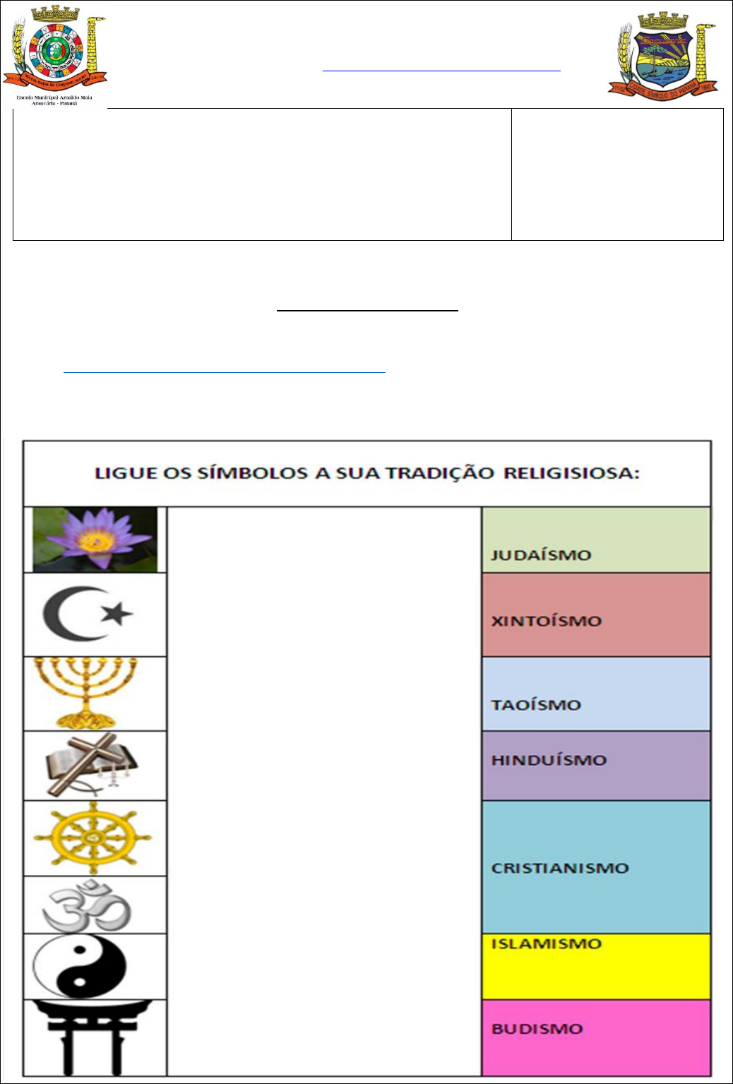 ESCOLA MUNICIPAL ARNALDO MAIA EDUCAÇÃO INFANTIL E ENSINO FUNDAMENTAL Rua Dom Manuel Silveira D’elboux , 1005 - Thomaz Coelho – Araucária – PR Fone: (41) 3901 – 5287 – E-mail: escola.arnaldo@educacao.araucaria.pr.gov.br SECRETARIA MUNICIPAL DE EDUCAÇÃO (SMED) ALUNO(A):_____________________________________________________ PROFESSOR(A): TATIANA NUSDEO COMPONENTE CURRICULAR: ENSINO RELIGIOSO ASSINATURA DO RESPONSÁVEL:______________________________ ATIVIDADE REMOTA – 015 TURMA: 5º ANO B DATA: 1º / 10 /2020 C. H. PREVISTA: 60 min. AULA 15 – ENSINO RELIGIOSO 5º ANO SÍMBOLOS RELIGIOSOS ➢ VAMOS ENTENDER O SIGNIFICADO DE ALGUNS SÍMBOLOS RELIGIOSOS? ASSISTA O VÍDEO: https://www.youtube.com/watch?v=SLy4mWJiAxs ATIVIDADE mailto:escola.arnaldo@educacao.araucaria.pr.gov.br https://www.youtube.com/watch?v=SLy4mWJiAxs