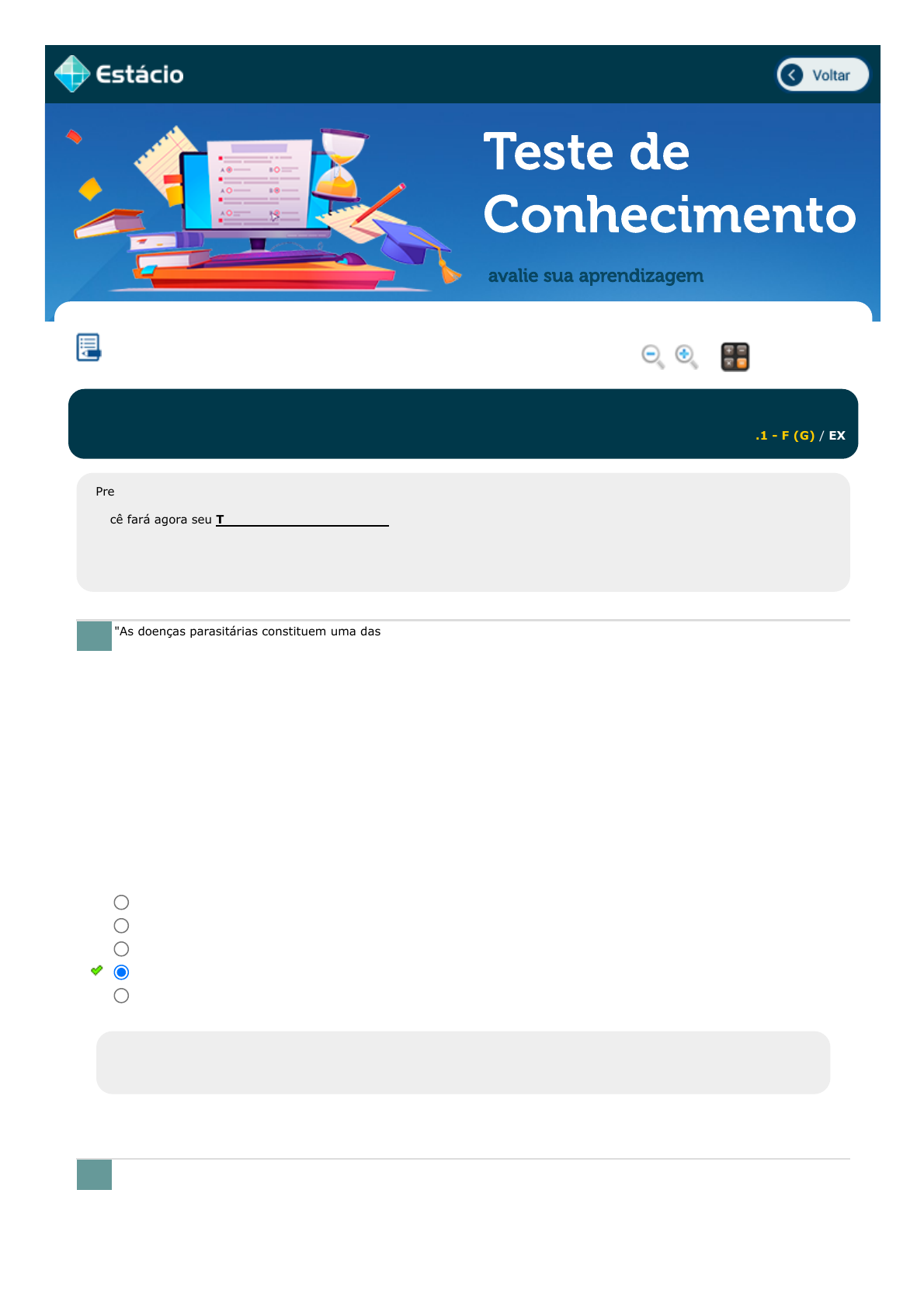 09/04/2022 12:46 Estácio: Alunos https://simulado.estacio.br/alunos/ 1/4 Teste de Conhecimento avalie sua aprendizagem "As doenças parasitárias constituem uma das principais causas de morte mundial e abrangem cerca de dois a três milhões de óbitos por ano. As parasitoses intestinais constituem um grave problema de saúde pública, especialmente nos países em desenvolvimento. No Brasil, apresentam-se bastante disseminadas e com alta prevalência, decorrente das más condições de vida. Essas doenças muitas vezes cursam de forma silenciosa, o que pode dificultar seu diagnóstico, tratamento adequado e profilaxia" (ANTUNES, R.F et al, 2020). Com relação às parasitoses no Brasil, analise as afirmativas a seguir: I - A profilaxia para a maioria das doenças parasitárias se restringe ao uso de vacinas. II - Educação sanitária e o saneamento básico são medidas profiláticas essenciais contra as verminoses. III - Protozoários são parasitas do tubo digestivo que causam doenças como giardíase, ascaridíase e toxoplasmose. IV - Protozoários muitas vezes parasitam o homem, causando doenças como malária, doença de Chagas e amebíase. Selecione a alternativa correta. Os danos gerados pelos parasitas podem ser diretos ou indiretos no hospedeiro, podendo ocorrer uma série de ações. Sobre os mecanismos de patogenicidade, analise as asserções a seguir e as relações entre elas: I - O mecanismo de patogênese da Tania saginata é enzimático. PARASITOLOGIA Lupa Calc. SDE4575_202103111971_TEMAS Aluno: LUDMILA DOS SANTOS COSTA Matr.: 202103111971 Disc.: PARASITOLOGIA 2022.1 - F (G) / EX Prezado (a) Aluno(a), Você fará agora seu TESTE DE CONHECIMENTO! Lembre-se que este exercício é opcional, mas não valerá ponto para sua avaliação. O mesmo será composto de questões de múltipla escolha. Após responde cada questão, você terá acesso ao gabarito comentado e/ou à explicação da mesma. Aproveite para se familiarizar com este modelo de questões que será usado na sua AV e AVS. 1. III e IV são verdadeiras. II, III e IV são verdadeiras I, II e III são verdadeiras. II e III são verdadeiras. I e IV são verdadeiras. Data Resp.: 09/04/2022 12:43:03 Explicação: A resppsta correta é: II e III são verdadeiras. 2. javascript:voltar(); javascript:voltar(); javascript:diminui(); javascript:aumenta(); javascript:calculadora_on(); 09/04/2022 12:46 Estácio: Alunos https://simulado.estacio.br/alunos/ 2/4 Porque II - A Tania saginata obtém seus nutrientes pela liberação de secreções enzimáticas produzidas por parasitas. A respeito dessas asserções, assinale a opção correta: A primeira vez que o agente causador da doença de chagas, Trypanosoma cruzi, foi isolado e descrito foi em 1909 a partir de uma amostra coletada em Minas Gerais. Com o intuito de controlar e prevenir uma doença tão grave, medidas de prevenção devem ser tomadas. Qual opção a seguir se encontra entre algumas das medidas de prevenção da doença de Chagas? A leishmaniose é uma doença transmitida por protozoários do gênero Leishmania. A Leishmaniose visceral, também conhecida como Calazar, geralmente se desenvolve dentro de meses após a picada do flebotomíneo. Diferentemente da Leishmaniose tegumentar, a leishmaniose visceral afeta órgãos, por causa disso se torna uma doença grave que necessita de tratamento o quanto antes. Entre as alternativas abaixo, marque aquela que diz respeito à leishmaniose visceral. A asserção I é uma proposição verdadeira enquanto a II é falsa. A asserção I é uma proposição falsa e a II é uma proposição verdadeira. As asserções I e II são proposições verdadeiras, mas a II não é uma justificativa da I As asserções I e II são proposições falsas. As asserções I e II são proposições verdadeiras e a II é uma justificativa da I. Data Resp.: 09/04/2022 12:43:15 Explicação: A resposta correta é: As asserções I e II são proposições falsas. 3. Ingerir carne bem passada, não entrar em contato com as fezes de gato, não permitir que o gato tenha contato com quintal, higienizar a caixinha de areia todos dos dias. Não deixar água parada, cobrir cisternas e caixas d'água, uso de repelente, uso de tela de mosquito em portas e janelas, uso de mosquiteiro na cama. Incentivo à construção de casas de alvenaria, à aplicação de inseticidas nas habitações infestadas, e ao uso de repelentes, de telas na casa e de triagem em bancos de sangue. Lavagem das mãos antes das refeições, lavar com cloro todos os alimentos, principalmente o que será ingerido cru, ferver a água antes de beber. Usar máscara, evitar aglomeração, lavar as mãos com água e sabão quando não for possível higienizar a mão com álcool em gel. Data Resp.: 09/04/2022 12:43:28 Explicação: A respsota correta é: Incentivo à construção de casas de alvenaria, à aplicação de inseticidas nas habitações infestadas, e ao uso de repelentes, de telas na casa e de triagem em bancos de sangue. 4. É uma doença exclusiva de animais domésticos, como cães e gatos, sendo o homem um hospedeiro acidental. Febre, perda de peso, inchaço do fígado e baço que leva ao crescimento anormal do abdome, anemia e leucopenia assim como trombocitopenia. Dentre os sintomas da doença, podemos destacar o aparecimento de feridas ulcerosas na pele e nas mucosas, que podem causar até mesmo deformidades. É causada principalmente por um protozoário ciliado, intracelular obrigatório que apresenta como formas evolutivas as amastigotas e tripomastigotas. Essa doença é transmitida pela ingestão de água e alimentos contaminados por cistos desse protozoário. Data Resp.: 09/04/2022 12:44:19 Explicação: A respsota correta é: Febre, perda de peso, inchaço do fígado e baço que leva ao crescimento anormal do abdome, anemia e leucopenia assim como trombocitopenia. 09/04/2022 12:46 Estácio: Alunos https://simulado.estacio.br/alunos/ 3/4 Sobre a esquistossomose, assinal