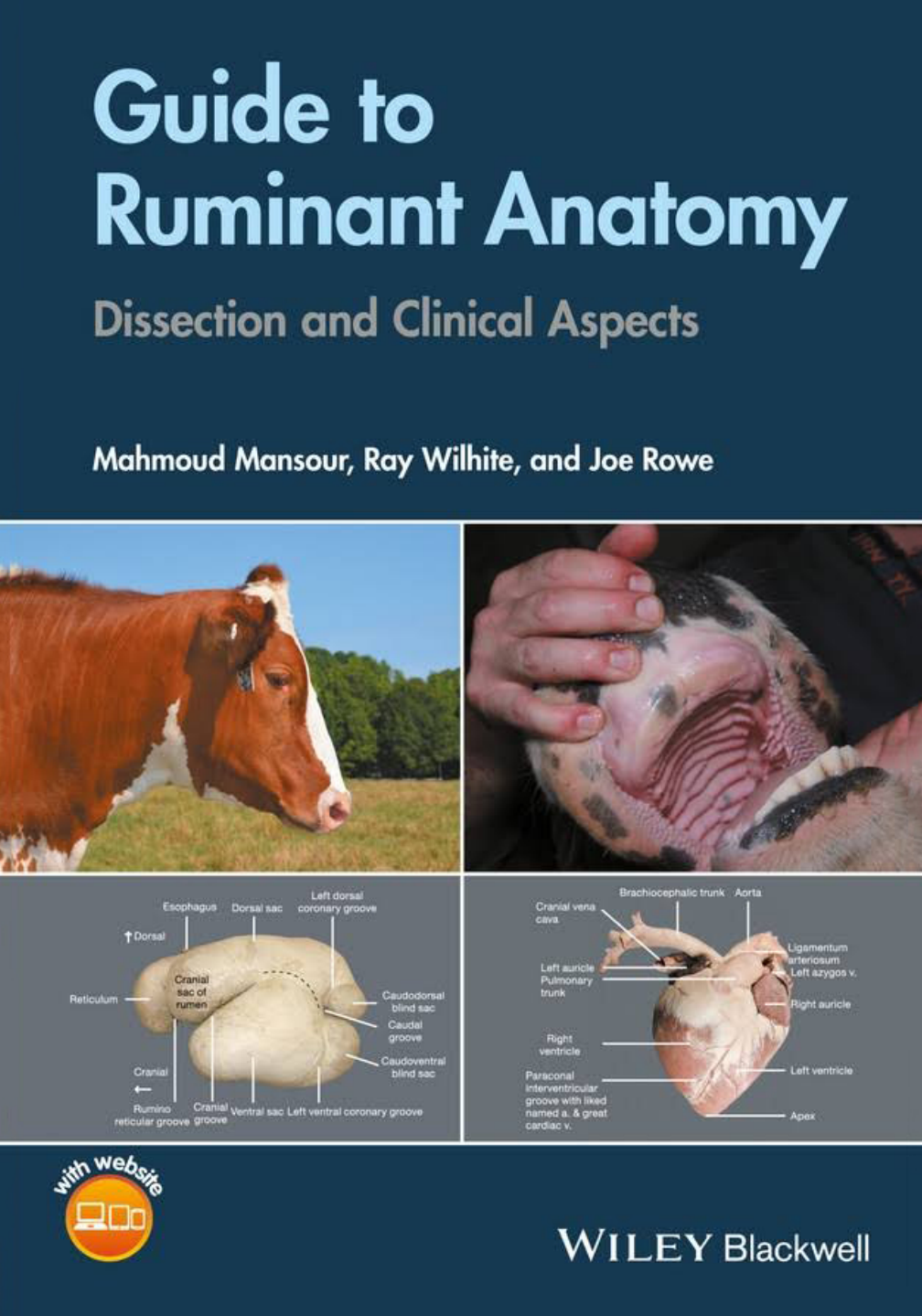 Chapter No.: 1 Title Name: <TITLENAME> ffirs.indd Comp. by: <USER> Date: 04 Apr 2017 Time: 08:17:01 AM Stage: <STAGE> WorkFlow:<WORKFLOW> Page Number: i Guide to Ruminant Anatomy Chapter No.: 1 Title Name: <TITLENAME> ffirs.indd Comp. by: <USER> Date: 04 Apr 2017 Time: 08:17:01 AM Stage: <STAGE> WorkFlow:<WORKFLOW> Page Number: iii Guide to Ruminant Anatomy Dissection and Clinical Aspects Mahmoud Mansour, DVM, PhD Professor, Auburn University, Auburn, AL, USA Ray Wilhite, MS, PhD Anatomy Laboratory Coordinator, Auburn University, Auburn, AL, USA Joe Rowe, DVM Anatomy Instructor, Auburn University, Auburn, AL, USA This edition first published 2018 © 2018 John Wiley & Sons, Inc All rights reserved. No part of this publication may be reproduced, stored in a retrieval system, or transmitted, in any form or by any means, electronic, mechanical, photocopying, recording or otherwise, except as permitted by law. Advice on how to obtain permission to reuse material from this title is available at http://www.wiley.com/go/ permissions. The right of Mahmoud Mansour, Ray Wilhite, and Joe Rowe to be identified as the authors of this work has been asserted in accordance with law. Registered Offices John Wiley & Sons, Inc., 111 River Street, Hoboken, NJ 07030, USA John Wiley & Sons Ltd, The Atrium, Southern Gate, Chichester, West Sussex, PO19 8SQ, UK Editorial Office 111 River Street, Hoboken, NJ 07030, USA For details of our global editorial offices, customer services, and more information about Wiley products visit us at www.wiley.com. Wiley also publishes its books in a variety of electronic formats and by print-on-demand. Some content that appears in standard print versions of this book may not be available in other formats. Limit of Liability/Disclaimer of Warranty: The contents of this work are intended to further general scientific research, understanding, and discussion only and are not intended and should not be relied upon as recommending or promoting scientific method, diagnosis, or treatment by physicians for any particular patient. In view of ongoing research, equipment modifications, changes in governmental regulations, and the constant flow of information relating to the use of medicines, equipment, and devices, the reader is urged to review and evaluate the information provided in the package insert or instructions for each medicine, equipment, or device for, among other things, any changes in the instructions or indication of usage and for added warnings and precautions. While the publisher and authors have used their best efforts in preparing this work, they make no representations or warranties with respect to the accuracy or completeness of the contents of this work and specifically disclaim all warranties, including without limitation any implied warranties of merchantability or fitness for a particular purpose. No warranty may be created or extended by sales representatives, written sales materials or promotional statements for this work. The fact that an organization, website, or product is referred to in this work as a citation and/or potential source of further information does not mean that the publisher and authors endorse the information or services the organization, website, or product may provide or recommendations it may make. This work is sold with the understanding that the publisher is not engaged in rendering professional services. The advice and strategies contained herein may not be suitable for your situation. You should consult with a specialist where appropriate. Further, readers should be aware that websites listed in this work may have changed or disappeared between when this work was written and when it is read. Neither the publisher nor authors shall be liable for any loss of profit or any other commercial damages, including but not limited to special, incidental, consequential, or other damages. Library of Congress Cataloging-in-Publication Data applied for 9781119051022 [Paperback] Cover Design: Wiley Cover Images: Mahmoud Mansour Set in 10/12pt Warnock by SPi Global, Chennai, India 10 9 8 7 6 5 4 3 2 1 Chapter No.: 1 Title Name: <TITLENAME> ftoc.indd Comp. by: <USER> Date: 04 Apr 2017 Time: 08:17:27 AM Stage: <STAGE> WorkFlow:<WORKFLOW> Page Number: v v Contents Preface xiii Acknowledgments xv About the Companion Website xvii 1 The Head, Neck, and Vertebral Column 1 1.1 Skull 2 1.2 Mandible 9 1.3 Paranasal Sinuses 9 1.4 Vertebral Column 14 1.5 Teeth and Age Estimation of Cattle and Small Ruminants (Goats and Sheep) 16 1.5.1 Definitions and Criteria for Estimating the Age of Ruminants 20 1.5.2 Steps for Estimating the Age of Cattle 22 1.6 Joints of the Head 24 1.6.1 Temporomandibular Joint 24 1.6.2 Atlantooccipital Joint 24 1.6.3 Mandibular Symphysis 24 1.6.4 Vertebral Joints 25 1.7 Muscles of the Head 25 1.7.1 Cutaneous Muscles 27 1.7.2 Muscles of Facial Expression 28 1.7.3 Muscles of Mastication 28 1.7.4 Pharyngeal Muscles 28 1.7.4.1 Nomenclature of Pharyngeal Muscles 29 1.7.5 Laryngeal Muscles 29 1.7.6 Hyoid Muscles 29 1.7.7 Lingual Muscles 29 1.7.8 Extraocular Muscles 30 1.8 Blood Vessels, Lymph Nodes, and Nerves of the Head 30 1.8.1 Blood Vessels (Arteries and Veins) 30 1.8.1.1 Arteries of the Head 30 1.8.1.2 Veins of the Head 33 1.8.2 Lymph Nodes of the Head and Neck 33 1.8.3 Nerves of the Head 36 1.8.3.1 Summary of Cranial Nerves and Their Functions 36 1.9 Salivary Glands 40 1.10 The Pharynx 40 Contentsvi 1.10.1 Oropharynx 40 1.10.2 Nasopharynx 40 1.10.3 Laryngopharynx 41 1.11 Tongue 41 1.12 The Larynx and Hyoid Apparatus 43 1.12.1 Larynx 43 1.12.2 Hyoid Apparatus 44 1.13 The Eye 45 1.13.1 Superficial Features of the Eye 45 1.13.2 Layers of the Eye 47 1.13.3 Sectioning of the Eyeball 49 1.13.3.1 Chambers of the Eye 49 1.13.4 Drainage Pathway of the Aqueous Humor 49 1.14 Neck Skeleton 49 1.15 Neck Muscles, Nerves, and Vessels 51 1.15.1 Neck Muscles 51 1.15.1.1 Superficial Neck Muscles 54 1.15.1.1.1 Brachiocephalicus Muscle 54 1.15.1.1.2 Omotransversar