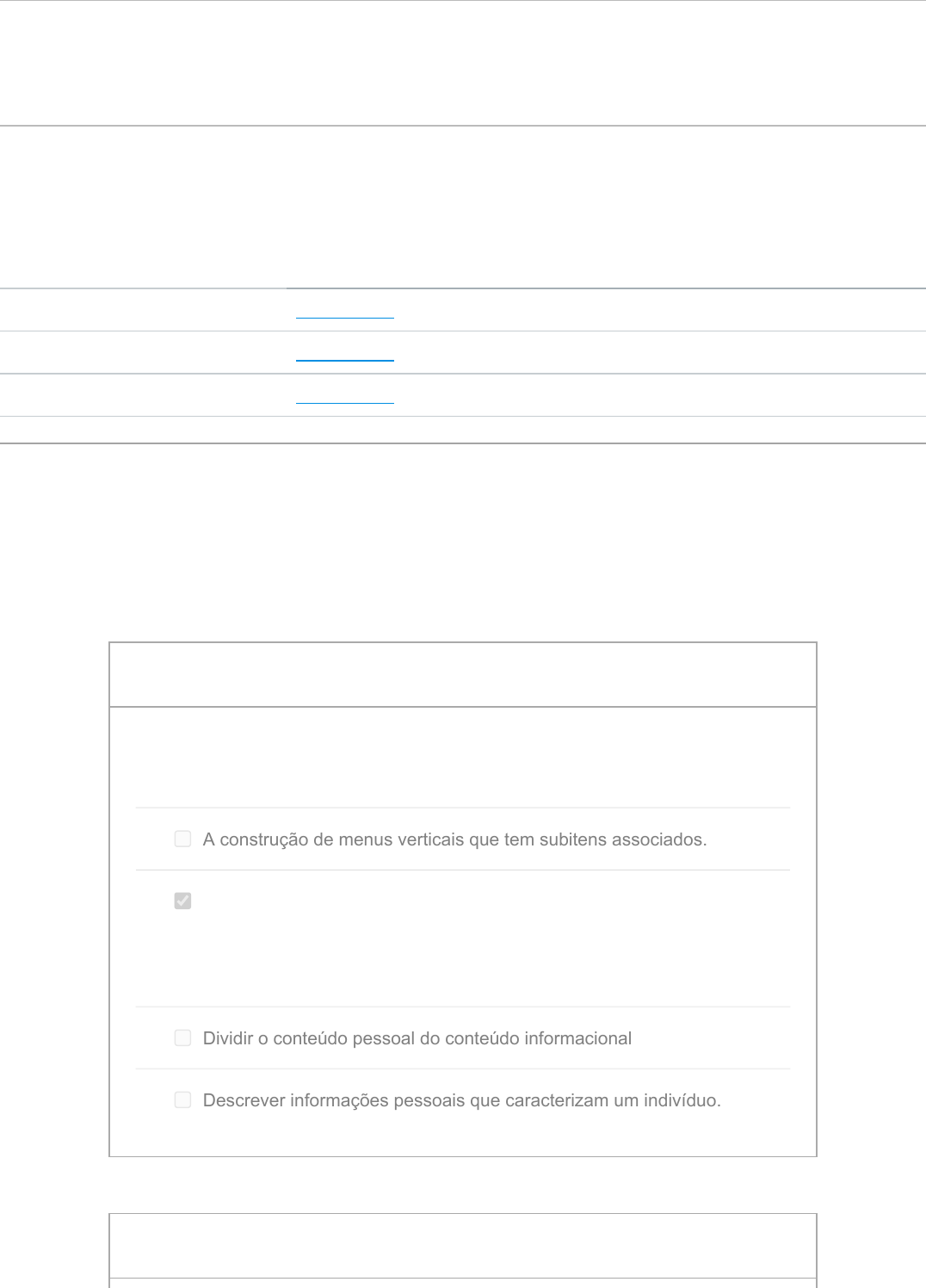 QUIZ 2.2 - Framework Bootstrap Entrega 26 set em 23:59 Pontos 2 Perguntas 5 Disponível até 26 set em 23:59 Limite de tempo Nenhum Tentativas permitidas 2 Histórico de tentativas Tentativa Tempo Pontuação MANTIDO Tentativa 2 1 minuto 2 de 2 MAIS RECENTE Tentativa 2 1 minuto 2 de 2 Tentativa 1 56 minutos 1,87 de 2 As respostas corretas estão ocultas. Pontuação desta tentativa: 2 de 2 Enviado 21 set em 13:54 Esta tentativa levou 1 minuto. 0,4 / 0,4 ptsPergunta 1 O componente CARD da framework Bootstrap é usado para: A construção de menus verticais que tem subitens associados. Servir de estrutura de contensão para informações que estão agrupadas Dividir o conteúdo pessoal do conteúdo informacional Descrever informações pessoais que caracterizam um indivíduo. 0,4 / 0,4 ptsPergunta 2 https://pucminas.instructure.com/courses/82951/quizzes/229646/history?version=2 https://pucminas.instructure.com/courses/82951/quizzes/229646/history?version=2 https://pucminas.instructure.com/courses/82951/quizzes/229646/history?version=1 Sobre a Framework Bootstrap escolha as alternativas corretas: É uma framework proprietária. É um conjunto de bibliotecas CSS e Javascript que otimiza a padroniza o desenvolvimento de interfaces web. Sua instalação deve é composta por um arquivo de estilos CSS e até 3 arquivos Javascript adicionados no final do body do html. Ela suporta layouts resposivos e líquidos mas tem limitações para layouts fixos. 0,4 / 0,4 ptsPergunta 3 Sobre os componentes de UI (User Interface) da framework Bootstrap marque os componentes que são padrões (default) do pacote documentado. Modal Carousel Timeline Navbar 0,4 / 0,4 ptsPergunta 4 Responder 1: Responder 2: Responder 3: Complete código abaixo para que a estrutura gere 2 colunas uma do lado da outra em resoluções maiores que 980px. <div class=" [ Selecionar ] "> <div class=" row "> <div class=" [ Selecionar ] ">Coluna 1</div> <div class="[col-lg-6]">Coluna 1</div> </div> </div> container row col-lg-6 0,4 / 0,4 ptsPergunta 5 Sobre o sistema de GRID da framework Bootstrap marque os itens corretos: É padronizada para o Grid de 12 colunas. As siglas sm, md, lg, xl são exemplos tamanhos que referenciam as resoluções mais comuns da web. Uma coluna pode ter até DOIS padrões de tamanho (um para o desktop outro para smartphones). Tem flexibilidade para que uma coluna se comporte com vários tamanhos. Pontuação do teste: 2 de 2