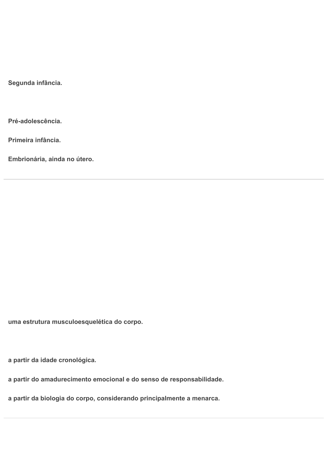 Ocultar opções de resposta Ocultar opções de resposta Pergunta 1 -- /0,1 Segundo Piaget, o desenvolvimento cognitivo que correspondente à fase operatória concreta diz respeito a qual fa da criança? Segunda infância. Resposta corTerceira infância. Pré-adolescência. Primeira infância. Embrionária, ainda no útero. Pergunta 2 -- /0,1 A partir do livro escrito pelo francês Philipe Ariés, surgiram alguns questionamentos que buscavam entender a infâ como: uma estrutura musculoesquelética do corpo. Resposta coruma etapa natural e universal. a partir da idade cronológica. a partir do amadurecimento emocional e do senso de responsabilidade. a partir da biologia do corpo, considerando principalmente a menarca. Pergunta 3 -- /0,1 Ocultar opções de resposta Ocultar opções de resposta Segundo Piaget, o desenvolvimento cognitivo que correspondente à fase pré-operatória diz respeito a qual fase da criança? Resposta corSegunda infância. Terceira infância. Embrionária, ainda no útero. Primeira infância. Pré-adolescência. Pergunta 4 -- /0,1 Porque a representação simbólica pela criança, na primeira e segunda infância, é importante? Porque é uma das funções elementares para a capacidade de conservação. Resposta corPorque ela será capaz de ser inserida em seu ambiente social e se comunicar com ele. Porque indica que ela está pronta para iniciar uma próxima etapa do seu processo de desenvolvimento. Porque é uma das funções elementares para o desenvolvimento das operações lógicas. Porque o não desenvolvimento dessa capacidade implicará uma criança com espectro autista. Pergunta 5 -- /0,1 Ocultar opções de resposta Ocultar opções de resposta O desenvolvimento humano inicia durante a fecundação, Após isso, inicia-se ao desenvolvimento pré-natal, que é dividido em período germinal, período embriônico e período fetal. Assinale alternativa que apresenta corretamente número de semanas correspondente ao período embriônico: momento da fecundação até a nona semana momento da fecundação até a oitava semana primeira até a sétima semana segunda até a sétima semana Resposta corsegunda até a oitava semana Pergunta 6 -- /0,1 Diante da situação descrita abaixo, responda qual é a fase correspondente ao desenvolvimento cognitivo? “Ao pegar Jonas no colo, ele imediatamente tenta agarrar os óculos de sua tia. Ela diz à Jonas que não pode faze isso e coloca os óculos no seu bolso. Jonas viu a tia guardando os óculos, mas olha novamente para o seu rosto e expressão é de que está decepcionado, porém não o procura”. Resposta corSensória-motora. Pré-adolescência. Pré-operatória. Operacional concreta. Pré-operacional. Pergunta 7 -- /0,1 Ocultar opções de resposta Ocultar opções de resposta Em relação ao desenvolvimento da criança e ao ambiente em que está inserida, considerando as teorias de Piage assinale a alternativa correta. A criança não entende e, por isso, não fará diferença a ela. O desenvolvimento depende exclusivamente da condição genética dos pais. Não exercem nenhuma diferença. Resposta corPodem exercer um papel de estímulo à conquista de novas habilidades. Sem ambiente estimulante a criança não se desenvolve. Pergunta 8 -- /0,1 Conforme Piaget, o desenvolvimento cognitivo na infância ocorre em três estágios universais que representam a fo como a criança estrutura seu pensamento. Quais são elas, respectivamente? Organização, adaptação e acomodação. Acomodação, adaptação e operatório concreto. Pré-operatório, operatório concreto e sensório-motor. Assimilação, acomodação e adaptação. Resposta corSensório-motor, pré-operatório e operatório concreto. Pergunta 9 -- /0,1 Ocultar opções de resposta Ocultar opções de resposta Segundo Piaget, o desenvolvimento cognitivo que correspondente à fase sensório-motora diz respeito a qual fase criança? Resposta corPrimeira infância. Pré-adolescência. Embrionária, ainda no útero. Terceira infância. Segunda infância. Pergunta 10 -- /0,1 O coração do bebê é formado em qual fase do desenvolvimento pré-natal? Quando o espermatozoide encontra o óvulo e a fecundação acontece. Resposta corNo período embriônico. Aos 3 meses de gestação. No período germinal. No período fetal