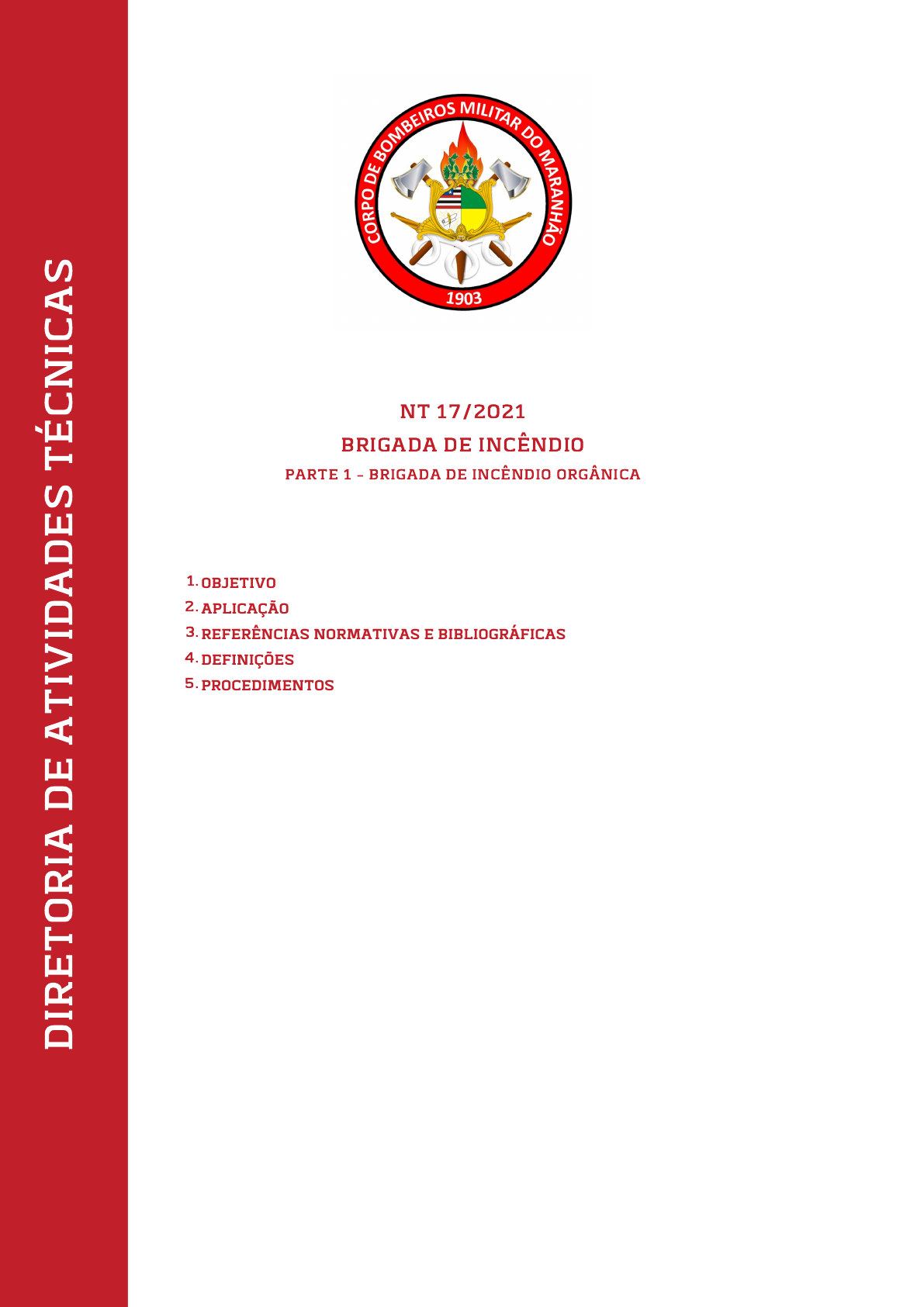 2021 D IR E T O R IA D E A T IV ID A D E S T É C N IC A S NT 17/2021 BRIGADA DE INCÊNDIO PARTE 1 - BRIGADA DE INCÊNDIO ORGÂNICA OBJETIVO APLICAÇÃO REFERÊNCIAS NORMATIVAS E BIBLIOGRÁFICAS DEFINIÇÕES PROCEDIMENTOS 1. 2. 3. 4. 5. NT 17/2021 – Brigada de Incêndio – Parte 1 – Brigada de Incêndio Orgânica 1 OBJETIVO 1.1 Estabelecer as condições mínimas para a composição, formação, implantação, treinamento e atualização da brigada de incêndio, para atuação em edificações e áreas de risco no Estado do Maranhão, na prevenção e no combate ao princípio de incêndio, abandono de área e primeiros socorros, visando, em caso de sinistro, proteger a vida e o patrimônio, reduzir os danos ao meio ambiente, até a chegada do socorro especializado, momento em que poderá atuar no apoio. 2 APLICAÇÃO 2.1 Esta Norma Técnica (NT) aplica-se a todas as edificações ou áreas de risco, conforme o Regulamento de Segurança contra Incêndio das edificações e áreas de risco do Estado do Maranhão. 3 REFERÊNCIAS NORMATIVAS E BIBLIOGRÁFICAS Para compreensão desta Instrução Técnica é necessário consultar as seguintes normas: ASSOCIAÇÃO BRASILEIRA DE NORMAS TÉCNICAS (ABNT). NBR 14023. Registro de atividades de bombeiros. Rio de Janeiro: ABNT; _______.NBR 14096. Viaturas de combate a incêndio. Rio de Janeiro: ABNT, _______.NBR 14277. Instalações e equipamentos para treinamento de combate a incêndio. Rio de Janeiro: ABNT; Manual de Fundamentos do Corpo de Bombeiros da Polícia Militar do Estado de São Paulo. 4 DEFINIÇÕES 4.1 Anotação de Responsabilidade Profissional (ARP): Documento que registra, para efeitos legais, o serviço prestado por empresa especializada e responsável pela formação e treinamento de Brigada de incêndio e Bombeiro Profissional Civil. Para as demais definições consultar a NT 03 - Terminologia de segurança contra incêndio. 5 PROCEDIMENTOS 5.1 Composição da brigada de incêndio 5.1.1 A quantidade de brigadistas por turno é determinada pela Tabela A.1, que leva em conta a população fixa por turno, o grau de risco e os grupos/divisões de ocupação da edificação ou área de risco. 5.1.2 Quando em uma edificação e/ou área de risco houver ocupação mista, o número de brigadistas pode ser calculado para cada tipo de divisão de ocupação, independente do isolamento de risco ou compartimentação. 5.1.3 Após o cálculo da quantidade de brigadistas, deve-se compor a brigada com a participação de pessoas distribuídas por toda a edificação ou área de risco, visando manter brigadistas posicionados estrategicamente para agir de forma rápida e eficaz diante de uma emergência. 5.1.4 Os locais que possuam espaços classificados como ocupação de divisão F-5 que são utilizadas esporadicamente, sem população fixa, quando utilizadas deverão prever quantidade de brigadistas conforme a Tabela A.1. 5.2 Critérios básicos para seleção de candidatos a brigadista 5.2.1 Os candidatos a brigadista devem atender preferencialmente aos seguintes critérios básicos: 5.2.1.1 Permanecer na edificação durante seu turno de trabalho; 5.2.1.4 Possuir boa condição física e boa saúde; 5.2.1.5 Possuir bom conhecimento da edificação e das instalações, devendo ser escolhidos preferencialmente os funcionários da área de utilidades, elétrica, hidráulica e manutenção geral; 5.2.1.6 Ser maior de 18 anos; 5.2.1.7 Ser alfabetizado. 5.3 Organização da brigada 5.3.1 Brigada de incêndio 5.3.1.1 A brigada de incêndio deve ser organizada funcionalmente, como segue: a. Brigadistas: pessoa voluntária ou indicada, treinado e capacitado para atuar na prevenção e no combate ao princípio de incêndio, abandono de área, prevenção de acidentes e primeiros socorros, numa edificação ou área de risco; b. Líder: responsável pela coordenação e execução das ações de emergência de um determinado conjunto de setores ou pavimento ou compartimento. É escolhido dentre os brigadistas aprovados no processo seletivo; c. Chefe da edificação ou do turno: brigadista responsável pela coordenação e execução das ações de emergência de uma determinada edificação da planta. É escolhido dentre os brigadistas aprovados no processo seletivo; d. Coordenador geral: brigadista responsável pela coordenação e execução das ações de emergência de todas as edificações que compõem uma planta, independentemente do número de turnos. É escolhido dentre os brigadistas que tenham sido aprovados no processo seletivo, devendo ser uma pessoa com capacidade de liderança, com respaldo da direção da empresa ou que faça parte dela. Nota1: Na ausência do coordenador geral, deve estar previsto no plano de emergência da edificação um substituto treinado e capacitado, sem que ocorra o acúmulo de funções. 5.3.2 Organograma da brigada de incêndio 5.3.2.1 O organograma da brigada de incêndio da edificação varia de acordo com o número de edificações, o número de pavimentos em cada edificação e o número de empregados em cada pavimento, compartimento, setor ou turno (Anexo E). 5.4 Programa do curso de brigada de incêndio 5.4.1 Os candidatos a brigadista, selecionados conforme o item 5.2, devem frequentar curso com carga horária mínima definida na Tabela B.2, abrangendo as partes teórica e prática, conforme Tabela B.1. 5.4.1.1 O curso deve enfocar principalmente os riscos inerentes ao tipo de divisão de ocupação. NT 17/2021 – Brigada de Incêndio – Parte 1 – Brigada de Incêndio Orgânica 5.4.1.2 O atestado de brigada de incêndio atualizado, renovado há no máximo 12 meses, será exigido quando da solicitação de vistoria. 5.4.1.3 O Atestado de Brigada de Incêndio deve ser mantido na edificação ou área de risco. 5.4.1.3.1 O atestado de brigada de incêndio deve ser renovado quando houver alteração de 50 % dos seus membros, conforme item 5.3.1. 5.4.1.3.2 A cada 12 meses deve ser realizada a atualizaç