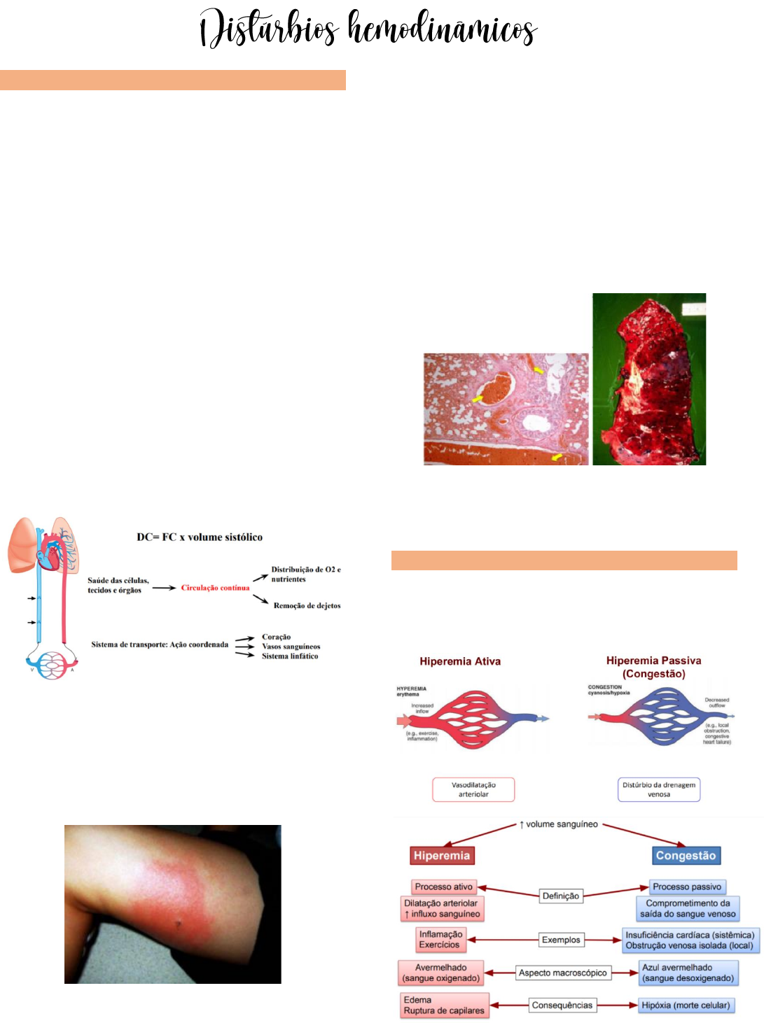 UNIVERSIDADE NOVE DE JULHO – MEDICINA DANIELLE RAICIK SISTEMA CIRCULATÓRIO É um circuito fechado de vasos com uma bomba propulsora central (coração). FUNÇÃO: manter a perfusão adequada dos tecidos (equilíbrio hídrico e distribuição de oxigênio) COMPONENTES: • Sangue • Vasos sanguíneos e linfáticos • Coração DISTÚRBIOS HEMODINÂMICOS: alterações da manutenção da perfusão tecidual, por falência de um dos três componentes, isolado ou em conjunto. Exemplos: hiperemia, congestão, edema, hemorragia, choque, trombose, embolia, infarto. O débito cardíaco é a quantidade de sangue que é ejetado a cada batimento cardíaco. Caso 1. Mulher de 24 anos moradora de Mairiporã, relata que durante uma visita ao Parque Estadual da Serra da Cantareira sofreu uma picada de abelha na perna direita. Procurou a UBS próxima, 1 hora após o ocorrido devido à intensa dor no local, tontura e dispneia. Processo patológico: inflamação É possível visualizar edema e vermelhidão (hiperemia) Caso 2. Homem de 47 anos, procurou atendimento por dispneia desencadeada por pequenos esforços e edema de membros inferiores. Os sintomas começaram 6 meses antes quando foi feito o diagnóstico de insuficiência cardíaca esquerda. A imagem ilustra a macroscopia e a microscopia do pulmão acometido por esse distúrbio circulatório É possível ver um acúmulo de sangue. Isso ocorre porque tem uma insuficiência cardíaca esquerda. Vai ter uma congestão pulmonar por causa disso. HIPERERMIA É um aumento da quantidade de sangue no interior dos vasos em determinado órgão ou tecido. UNIVERSIDADE NOVE DE JULHO – MEDICINA DANIELLE RAICIK • HIPERERMIA ATIVA: vasodilatação arteriolar – coloração avermelhada (eritema) – acúmulo de sangue oxigenado. Inflamação. • HIPERERMIA PASSIVA (CONGESTÃO): os tecidos com excesso de sangue venoso ficam com a coloração vermelho-azulada a arroxeada. A diminuição do retorno venoso ocorre por: ➢ Obstrução localizada, aumento da viscosidade (local). Ex: trombose venosa ➢ Redução do retorno venoso sistêmico ou pulmonar (sistêmica). Ex: hiperemia passiva na ICC, sistêmica (ICC direita) e pulmonar (ICC esquerda) ICD-INSUFICIÊNCIA CARDÍACA DIREITA Causa hiperemia passiva em todo organismo. O fígado fica com aspecto de fígado em nóz moscada. Isso ocorre devido a insuficiência cardíaca direita que leva a congestão de sangue venoso no fígado. • Aguda: veias centrolobulares e sinusóides distendidos. Os hepatócitos centrolobulares podem sofrer necrose isquêmica. • Crônica aspecto macro: vermelho- acastanhado regiões adjacentes não congestas. Amarelo- acastanhado (noz moscada). • Crônica aspecto micro: hemorragia centro lobular, macrófagos com hemossiderina, necrose. ICE-INSUFICIÊNCIA CARDÍACA ESQUERDA: Causa hiperemia passiva no pulmão. • Pulmões pesados, volumosos, vinhosos. • Septos alargados, com dilatação de capilares alveolares e espessamento intersticial. • Macrófagos alveolares com pigmento de hemossiderina – células do vício cardíaco. A seta vermelha corresponde aos pigmentos de hemossiderina. A seta amarela corresponde aos vasos com hiperemia passiva. • Aguda: capilares alveolares distendidos. Edema septal alveolar. Hemorragias intra alveolar focal. • Crônica: septo espessos/fibróticos. Alvéolos com macrófagos carregados de hemossiderina. UNIVERSIDADE NOVE DE JULHO – MEDICINA DANIELLE RAICIK CONCEITO DE EDEMA É o aumento da quantidade de líquido intersticial nos tecidos (edemas) ou nas cavidades orgânicas (efusões). 1. Aumento da pressão hidrostática 2. Diminuição da pressão oncótica 3. Aumento da permeabilidade vascular 4. Redução da drenagem linfática TRANSUDATO: edema não inflamatório. Líquido pobre em proteínas, hipocelular • Seroso, translucido, incolor e amarelo- citrino. • Alterações de forças hemodinâmicas através do endotélio EXSUDATO: edema inflamatório. • Líquido rico em proteínas, com células inflamatórias. • Turvo, amarelo-esbranquiçado, com grumos proteicos (fibrina) • Aumento da permeabilidade vascular. Patogênese dessa foto (possíveis causas) ICD→ prejuízo do retorno do venoso→ sangue fica congesto→ aumento da pressão hidrostática→ expulsa a água do vaso para o interstício (edema) Trombose venosa→ a extremidade fica cianótica (oxigenação do sangue que fica estagnado) Lesão hepática/insuficiência hepática→ hipoalbuminemia → edema Lesão no rim→ lesão glomerular – proteinúria→ diminuição da pressão oncótica. EDEMA LOCALIZADO: • Aumento da pressão venosa • Insuficiência venosa crônica EDEMA PULMONAR: • Aumento da pressão nas veias pulmonares • Aumento da permeabilidade capilar Insuficiência cardíaca esquerda → edema pulmonar crônico Falência cardíaca aguda → transudação de líquidos para os alvéolos DIMINUIÇÃO DA PRESSÃO OSMÓTICA VASCULAR: • Redução da concentração de albumina (produção inadequada ou excesso de perda) • Restrição proteica – ascite • Desnutrição proteica EDEMA GENERALIZADO: • Insuficiência cardíaca direita • MMII – anasarca • Dificuldade de retorno venoso→ saída de líquido para o interstício→ diminui a volemia→ sistema renina-angiotensina- aldosterona SINAL DE CACIFO A pressão digital sobre o tecido subcutâneo muito edemaciado desloca o líquido intersticial e deixa uma depressão, um sinal chamado de edema com cacifo. UNIVERSIDADE NOVE DE JULHO – MEDICINA DANIELLE RAICIK DIMINUIÇÃO DA DRENAGEM LINFÁTICA: • Obstrução por agentes biológicos (elefantíase – filariose; tumores) • Obstrução cirúrgica (esvaziamento linfonodal em câncer) CASO CLÍNICO 1 Mulher de 24 anos moradora de Mairiporã, relata que durante uma visita ao Parque Estadual da Serra da Cantareira sofreu uma picada de abelha na perna direita. Procurou a UBS próxima, 1 hora após o ocorrido devido à intensa dor no local, tontu