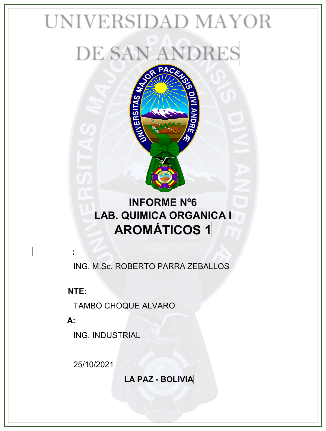 INFORME Nº6 LAB. QUIMICA ORGANICA I AROMÁTICOS 1 DOCENTE: ING. M.Sc. ROBERTO PARRA ZEBALLOS ESTUDIANTE: TAMBO CHOQUE ALVARO CARRERA: ING. INDUSTRIAL FECHA: 25/10/2021 LA PAZ - BOLIVIA UNIVERSIDAD MAYOR DE SAN ANDRES 1.- OBJETIVOS 1.1. Objetivo genera Sintetizar la aspirina mediante la acetanilidación catalizada en medio acido de ácido salicílico con anhidro acético. 1.2. Objetivo especifico ➢ Aprender sobre los hidrocarburos aromáticos y sus diferentes funciones en laboratorio. ➢ Calcular el rendimiento teórico y experimental que obtenemos. ➢ Obtener aspirina. ➢ Aprender más sobre la acetanilidación. 2.- MARCO TEORICO 2.1. Hidrocarburos aromáticos Los hidrocarburos aromáticos son aquellos hidrocarburos que poseen las propiedades especiales asociadas con el núcleo o anillo del benceno, en el cual hay seis grupos de carbono-hidrógeno unidos a cada uno de los vértices de un hexágono. Los enlaces que unen estos seis grupos al anillo presentan características intermedias, respecto a su comportamiento, entre los enlaces simples y los dobles. Así, aunque el benceno puede reaccionar para formar productos de adición, como el ciclo hexano, la reacción característica del benceno no es una reacción de adición, sino de sustitución, en la cual el hidrógeno es reemplazado por otro sustituto, ya sea un elemento univalente o un grupo. También tenían bajas relaciones de hidrogeno a carbono y aromas agradables; se podían convertir en benceno o compuestos relacionados. A este grupo de compuestos se les llamo aromáticos, por sus olores agradables. A otros compuestos que no tienen estas características se les llamo alifáticos, que significa como grasa. Los orbitales moleculares (OM) del sistema Π conjugado de un hexatrieno se construyen combinaciones lineales independientes de los orbitales p (OA) de los carbonos implicados. Los orbitales van teniendo un carácter enlazante menor a medida que poseen más nodos donde la fase de los OA cambia. Los seis electrones se sitúan en los OM de más energía. Los OM del benceno se construyen de una formula molecular muy similar, pero el hecho de que los OA estén encerrados en un anillo cerrado cambia las cosas. Existen dos OM con un nodo y con dos nodos. como los nodos marcan la energía de los orbitales, la distribución resulta diferente que en el hexatrieno y aparecen dos pares de OM degenerados. Los seis electrones implicados se colocan de la forma indicada, que resulta mucho más estable que en el trieno conjugado. Los hidrocarburos aromáticos y sus derivados son compuestos cuyas moléculas están formadas por una o más estructuras de anillo estables del tipo antes descrito y pueden considerarse derivados del benceno de acuerdo con tres procesos básicos: 1. Por sustitución de los átomos de hidrógeno por radicales de hidrocarburos alifáticos 2. Por la unión de dos o más anillos de benceno, ya sea directamente o mediante cadenas alifáticas u otros radicales intermedios. 3. Por condensación de los anillos de benceno. 2.2. La regla de Hückel Relaciona la aromaticidad con el número de electrones deslocalizados en orbitales sp2 de una molécula orgánica plana y cíclica que tiene enlaces simples y enlaces dobles conjugados. En concreto, la regla de Hückel indica que una molécula plana es aromática si tiene 4n+2 electrones π, y anti aromática si tiene 4n electrones π. La importancia de la regla radica en la gran diferencia de estabilidad entre compuestos aromáticos, no aromáticos y anti aromáticos, de forma que se pueden hacer predicciones cualitativas sobre la estabilidad química de los diferentes compuestos de forma sencilla. En concreto se puede aplicar la regla de Hückel del siguiente modo: 4n+2 debe ser igual al número de electrones π (número de dobles enlaces x 2), si el número de electrones π es igual a "4n", será anti aromático. Si no cumple las reglas es no aromático. ➢ Benceno El benceno se conoce generalmente como “Benzol” cuando se encuentra en forma comercial (que es una mezcla de benceno y sus homólogos) y no debe confundirse con la bencina, un disolvente comercial compuesto por una mezcla de hidrocarburos alifáticos. ➢ La estructura del benceno Es una estructura cerrada con forma hexagonal regular, pero sin alternancia entre los enlaces simples y los dobles (carbono-carbono). Sus seis átomos de carbono son equivalentes entre sí, pues son derivados mono sustituidos, lo que les hace ser idénticos. Las longitudes de enlace entre los carbonos vecinos entre sí son iguales en todos los casos. La distancia es de 139 pm, no coincidiendo con la longitud media de un doble enlace, que es de 133 pm, ni siquiera a la de un enlace simple, que es de 154 pm. Los átomos de carbono del benceno, poseen una hibridaciónsp^2, en tres de los orbitales atómicos, y estos son usados para poder unirse a los dos átomos de carbono que se encuentren a su lado, y también a un átomo de hidrógeno. El orbital p (puro) de cada carbono restante, se encuentra orientado perpendicularmente al plano del anillo de hexágono, éste se solapa con los demás orbitales tipo p de los carbonos contiguos. Así, los seis electrones deslocalizados formarán lo que se conoce como, nube electrónica (π), que se colocará por encima, y también por debajo del plano del anillo. La presencia de la nube electrónica de tipo π, hace que sean algo más pequeños los enlaces simples entre los carbonos (C-C), otorgando una peculiar estabilidad a los anillos aromáticos. A través de reacciones de sustitución, los átomos de hidrógeno del benceno se pueden ver remplazados por diferentes sustituyentes de gran variedad, pudiendo ser éstos, halógenos, grupos alquilo, nitro, NO2, y un largo etc. De este modo podemos encontrarnos derivados mono sustituidos, di sustituidos y tri sustituidos. Podemos tener otros compuestos como ser: ➢ Naftaleno El naftaleno es un sólido blanquecino que predomina fundamentalmente en los c