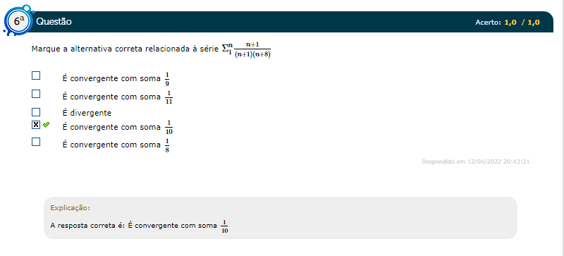 Marque a alternativa correta relacionada à série n+1 (n+1)(n+8). É convergente com soma 1 É convergente com soma 9 É convergente com soma 11 É divergente É convergente com soma 10 É convergente com soma 8