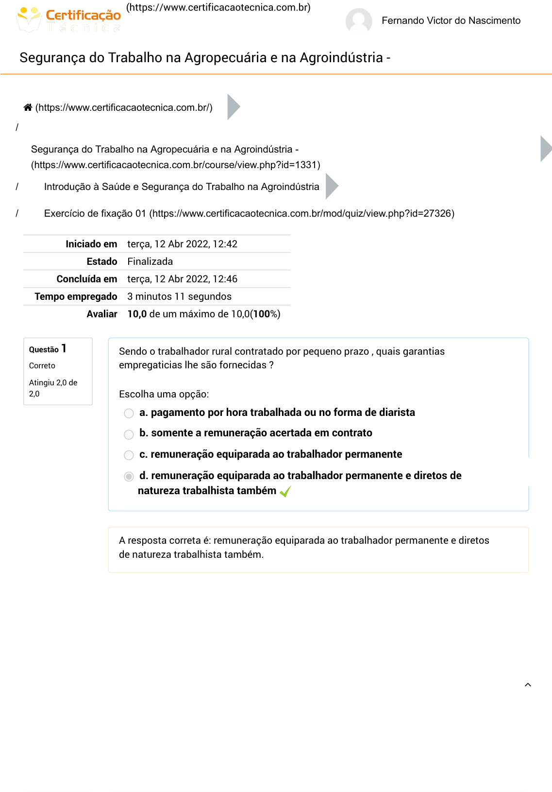 (https://www.certificacaotecnica.com.br) Fernando Victor do Nascimento Segurança do Trabalho na Agropecuária e na Agroindústria - Questão 1 Correto Atingiu 2,0 de 2,0 / / / Iniciado em terça, 12 Abr 2022, 12:42 Estado Finalizada Concluída em terça, 12 Abr 2022, 12:46 Tempo empregado 3 minutos 11 segundos Avaliar 10,0 de um máximo de 10,0(100%) Sendo o trabalhador rural contratado por pequeno prazo , quais garantias empregaticias lhe são fornecidas ? Escolha uma opção: a. pagamento por hora trabalhada ou no forma de diarista b. somente a remuneração acertada em contrato c. remuneração equiparada ao trabalhador permanente d. remuneração equiparada ao trabalhador permanente e diretos de natureza trabalhista também A resposta correta é: remuneração equiparada ao trabalhador permanente e diretos de natureza trabalhista também. (https://www.certificacaotecnica.com.br/) Segurança do Trabalho na Agropecuária e na Agroindústria - (https://www.certificacaotecnica.com.br/course/view.php?id=1331) Introdução à Saúde e Segurança do Trabalho na Agroindústria Exercício de fixação 01 (https://www.certificacaotecnica.com.br/mod/quiz/view.php?id=27326) https://www.certificacaotecnica.com.br/ https://www.certificacaotecnica.com.br/ https://www.certificacaotecnica.com.br/course/view.php?id=1331 https://www.certificacaotecnica.com.br/mod/quiz/view.php?id=27326 Questão 2 Correto Atingiu 1,0 de 1,0 Questão 3 Correto Atingiu 1,0 de 1,0 Questão 4 Correto Atingiu 2,0 de 2,0 Para qual quantidade de familia em atividade em uma propriedade rural dever ser obrigada a possuir e conservar em funcionamento escola primária, inteiramente gratuita, para os filhos destes, com tantas classes quantos sejam os grupos de quarenta crianças em idade escolar. Escolha uma opção: a. mais de 50 familias b. mais de 60 familias c. mais de 30 familias d. mais de 40 familias A resposta correta é: mais de 50 familias. Sobre o que trata a Convenção 182 e a Recomendação 190 da OIT ? Escolha uma opção: a. Fim do trabalho analogo ao escravo b. Direitos a mulher ampliado no campo trabalhista c. Fim da terceirização de serviço na atividade fim empresarial d. Proibição das piores formas de trabalho infantil e a Ação imediata para a sua eliminação A resposta correta é: Proibição das piores formas de trabalho infantil e a Ação imediata para a sua eliminação. Para o veículo de transporte coletivo de passageiros deve observar os seguintes requisitos, EXCETO: Escolha uma opção: a. possuir autorização emitida pela autoridade de trânsito competente b. ser conduzido por motorista habilitado e devidamente identificado c. possuir compartimento para a guarda das ferramentas e materiais d. transportar todos os passageiros sentados A resposta correta é: possuir compartimento para a guarda das ferramentas e materiais. https://www.certificacaotecnica.com.br/ https://www.certificacaotecnica.com.br/ https://www.certificacaotecnica.com.br/course/view.php?id=1331 https://www.certificacaotecnica.com.br/mod/quiz/view.php?id=27326 Questão 5 Correto Atingiu 1,0 de 1,0 Questão 6 Correto Atingiu 2,0 de 2,0 Questão 7 Correto Atingiu 1,0 de 1,0 No Brasil, o trabalho rural é regulado por qual Lei ? Escolha uma opção: a. Lei n. 4754/1934 b. Lei n. 5.889/1973 c. Lei n. 3233/2009 d. Lei n. 7102/1983 A resposta correta é: Lei n. 5.889/1973. O que vem a ser segurança alimentar ? Escolha uma opção: a. Quando o alimento não causará dano aos consumidores e, em razão disso, não poderá oferecer perigos à saúde destes, em particular no que concerne à contaminação em sua preparação, notadamente em decorrência de sua manipulação. b. Quando o trabalhador tem direito a receber o vale alimentação fornecido pelo empregador e o estado da essa garantia de recebimento c. Quando o trabalhador tem direito a receber o vale refeição fornecido pelo empregador e o estado da essa garantia de recebimento d. Quando o alimento sai da fazenda e chega ate o mercado para distribuição ao usuário final A resposta correta é: Quando o alimento não causará dano aos consumidores e, em razão disso, não poderá oferecer perigos à saúde destes, em particular no que concerne à contaminação em sua preparação, notadamente em decorrência de sua manipulação.. Qual o prazo que o produtor rural como pessoa física poderá realizar contratação de trabalhador rural por pequeno prazo para o exercício de atividades de natureza temporária ? Escolha uma opção: a. dentro do periodo de 1 (um) ano, superar 6 (seis) meses b. dentro do período de 1 (um) ano, superar 2 (dois) meses c. dentro do periodo de 2 (dois) anos, superar 2 (dois) meses d. dentro do periodo de 2 (dois) anos, superar 6 (seis) meses A resposta correta é: dentro do período de 1 (um) ano, superar 2 (dois) meses. https://www.certificacaotecnica.com.br/ https://www.certificacaotecnica.com.br/ https://www.certificacaotecnica.com.br/course/view.php?id=1331 https://www.certificacaotecnica.com.br/mod/quiz/view.php?id=27326 https://www.certificacaotecnica.com.br/ https://www.certificacaotecnica.com.br/ https://www.certificacaotecnica.com.br/course/view.php?id=1331 https://www.certificacaotecnica.com.br/mod/quiz/view.php?id=27326