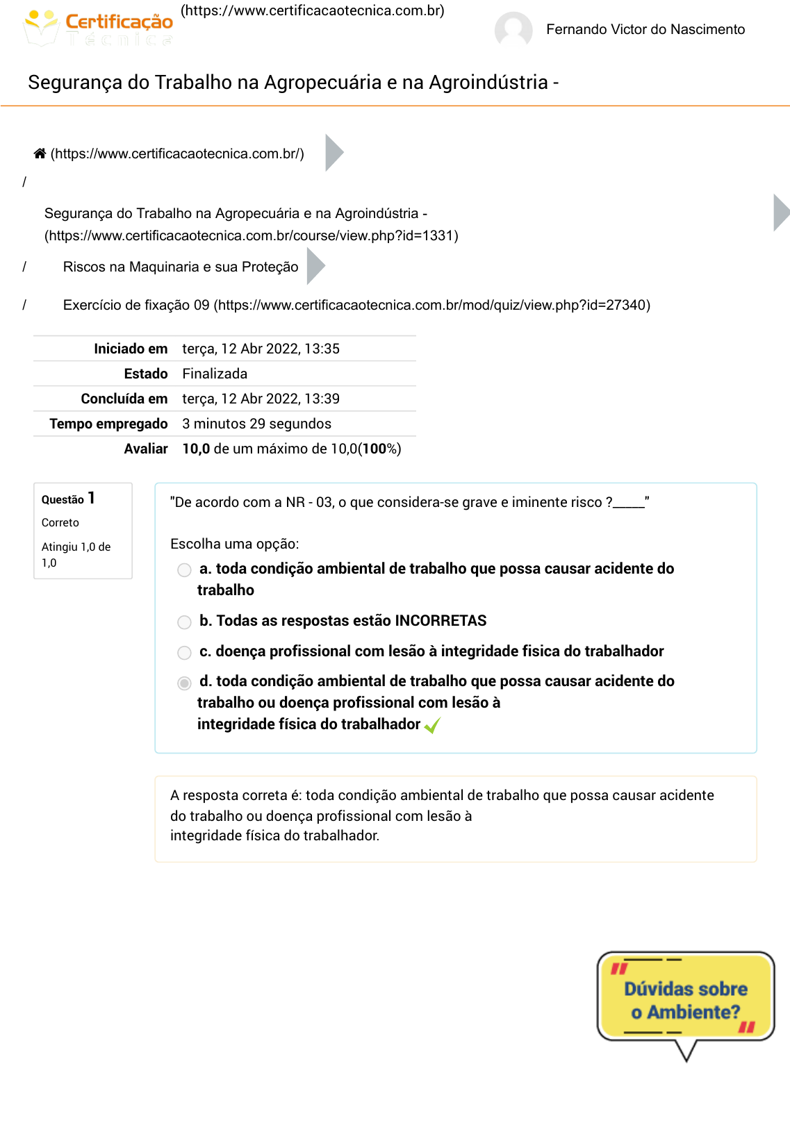 (https://www.certificacaotecnica.com.br) Fernando Victor do Nascimento Segurança do Trabalho na Agropecuária e na Agroindústria - Questão 1 Correto Atingiu 1,0 de 1,0 / / / Iniciado em terça, 12 Abr 2022, 13:35 Estado Finalizada Concluída em terça, 12 Abr 2022, 13:39 Tempo empregado 3 minutos 29 segundos Avaliar 10,0 de um máximo de 10,0(100%) "De acordo com a NR - 03, o que considera-se grave e iminente risco ?_____" Escolha uma opção: a. toda condição ambiental de trabalho que possa causar acidente do trabalho b. Todas as respostas estão INCORRETAS c. doença profissional com lesão à integridade fisica do trabalhador d. toda condição ambiental de trabalho que possa causar acidente do trabalho ou doença profissional com lesão à integridade física do trabalhador A resposta correta é: toda condição ambiental de trabalho que possa causar acidente do trabalho ou doença profissional com lesão à integridade física do trabalhador. (https://www.certificacaotecnica.com.br/) Segurança do Trabalho na Agropecuária e na Agroindústria - (https://www.certificacaotecnica.com.br/course/view.php?id=1331) Riscos na Maquinaria e sua Proteção Exercício de fixação 09 (https://www.certificacaotecnica.com.br/mod/quiz/view.php?id=27340) https://www.certificacaotecnica.com.br/ https://www.certificacaotecnica.com.br/ https://www.certificacaotecnica.com.br/course/view.php?id=1331 https://www.certificacaotecnica.com.br/mod/quiz/view.php?id=27340 Questão 2 Correto Atingiu 2,0 de 2,0 Questão 3 Correto Atingiu 2,0 de 2,0 "O “conjunto de peças ou de órgãos ligados entre eles, em que pelo menos um é móvel, e, se for o caso, acionadores, circuitos de comando e de potência etc., reunidos de maneira solidária em vista de uma aplicação definida, notadamente para a transformação, o tratamento, o deslocamento e o acondicionamento de um material”. É a definição de maquina dada por qual Normativa ?_____" Escolha uma opção: a. LEI 7.102/1983 b. ABNT NBR 15.718/2011 c. NBR NM 213-1 d. NR - 23 A resposta correta é: NBR NM 213-1. "Dessa feita, novas máquinas somente devem ser adquiridas se em perfeita consonância com os requisitos da NR 12. Por sua vez, máquinas projetadas, produzidas e instaladas anteriormente devem ser ? _____" Escolha uma opção: a. Devem voltar a fabrica de origem para serem modernizadas b. Devem continuar seu uso independente da Normativa c. Descartadas imediatamente d. devem ser adequadas às suas exigências ou ser substituídas quando tal adequação não for possível ou economicamente viável. A resposta correta é: devem ser adequadas às suas exigências ou ser substituídas quando tal adequação não for possível ou economicamente viável.. Questão 4 Correto Atingiu 1,0 de 1,0 Questão 5 Correto Atingiu 2,0 de 2,0 Questão 6 Correto Atingiu 1,0 de 1,0 "O empregador deve manter inventário atualizado das máquinas e equipamentos com identificação por tipo, capacidade, sistemas de segurança e localização em planta baixa, elaborado por profissional qualificado ou legalmente habilitado. Essa regra cabe excessão em que circunstancia ?_____" Escolha uma opção: a. empresas de porte médio b. ela se aplica a todos sem excessão c. empresas multinacionais por estarem acobertadas por leis internacionais d. às microempresas e às empresas de pequeno porte A resposta correta é: às microempresas e às empresas de pequeno porte. "Podem ser utilizados, sem ordem de preferência, alguns dos métodos para análise de perigos e estimativa de riscos, EXCETO:_____" Escolha uma opção: a. APP b. PET c. Hazop d. FTA A resposta correta é: PET. "Podemos dizer que a NR 12 estabelece duas ordens de ações visando à proteção no trato com máquinas e equipamentos, quais seriam ?_____" Escolha uma opção: a. Plano fisico e Plano Gerencial b. Plano tecnico e Plano execução c. Plano Organizacional e Plano distribuição d. Plano operacional e Plano inspeção A resposta correta é: Plano fisico e Plano Gerencial. Questão 7 Correto Atingiu 1,0 de 1,0 Qual Norma Regulamentadora trata da Segurança no Trabalho com Máquinas e Equipamentos ? Escolha uma opção: a. NR - 12 b. NR - 13 c. NR - 11 d. NR - 09 A resposta correta é: NR - 12.