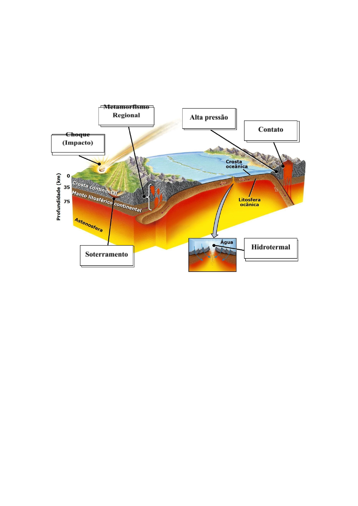 EXERCÍCIO DE GEOLOGIA BÁSICA (Rochas Metamórficas) 1. Observe a figura abaixo e complete cada um dos quadros com o tipo correspondente de metamorfismo. A seguir descreva algumas das características dos respectivos tipos de metamorfismo. Os tipos de metamorfismos apresentados na figura acima são os seguintes: a) Metamorfismo regional: É o tipo de metamorfismo mais comum que ocorre na natureza. Esse metamorfismo está relacionado às colisões entre as placas tectônicas, ocasionadas pelo processo de movimentação das mesmas. Ou seja, ocorre quando enormes porções da crosta são submetidas a elevadas pressões e aumento de temperatura. Este possui forte relação com o processo de formação de cadeias montanhosas; b) Metamorfismo de alta pressão: Este tipo, que pode se relacionar com o tipo anterior, é caracterizado pela subducção da placa oceânica sob as placas continentais. A pressão dos pontos de contato direto entre as placas na subducção tende a ser bastante elevada. Nos pontos de ocorrência desse tipo de metamorfismo, que possuem elevada pressão, é possível perceber a formação de xistos azuis, que é um tipo de rocha metamórfica formada em altíssima pressão e baixa temperatura; c) Metamorfismo de contato: Ocorre pela acomodação e acumulação do material magmático nas câmaras magmáticas que, por apresentarem temperaturas superiores, promovem o metamorfismo das rochas encaixantes pelo calor transmitido. Por possuírem composições distintas, as rochas que circundam esses corpos magmáticos serão modificadas pela transferência de calor do corpo ígneo para as rochas. As maiores alterações ocorrem nas regiões mais próximas do material ígneo; d) Metamorfismo hidrotermal (ou de fundo oceânico): O metamorfismo hidrotermal se faz presente em situações de atividade ígnea nos oceanos, como por exemplo, a situação das dorsais oceânicas. Nesta situação, as dorsais promovem a formação da nova crosta oceânica gerada pela colocação de material magmático nas fendas, oriundas do manto, formulando câmaras de magma. A água fria do fundo oceânico, que é mais densa, se infiltra na crosta e é aquecida pelo calor transmitido pela atividade magmática das câmaras ígneas próximas. Desse aquecimento, as águas reagem e atuam como células de convecção que ascendem e percola nas rochas ocasionando alterações químicas e mineralógicas na crosta; e) Metamorfismo de soterramento: Ocorre no contexto continental, nas regiões de bacias sedimentares. A acumulação de novas camadas de sedimentos, nas camadas superiores da bacia sedimentar, faz com que as pressões aplicadas sobre as rochas de camadas mais profundas sejam ampliadas. O aumento de pressão dos materiais acima pode promover as alterações das rochas das camadas mais profundas por meio do soterramento; f) Metamorfismo de choque (ou impacto): É o tipo de metamorfismo causado pelo impacto dos corpos celestes (meteoritos e/ou asteroides) oriundos do espaço. A mudança gerada nas rochas é causada, essencialmente, pelas enormes pressões e elevadas temperaturas ocasionadas pelo impacto destes corpos, que viajam em enormes velocidades, na superfície terrestre. 2. Em quais contextos de interação entre placas tectônicas ocorre o metamorfismo regional? Quais rochas metamórficas (de baixo, médio, e alto grau metamórfico) poderiam ser encontradas nesse contexto? Apresente exemplos ilustrativos dessas rochas. O metamorfismo regional ocorre no contexto das interações entre as placas tectônicas do tipo convergente, tais interações podem ser classificadas em dois tipos: Continente/Continente ou Oceano/Continente. As rochas de baixo, médio e alto grau de metamorfismo que são produzidas nos processos metamórficos desse tipo de metamorfismo são: ● Baixo grau metamórfico: Ardósia (rochas com clivagem ardosiana); Figura 1 - Ardósia. Fonte: Google Imagens. ● Médio grau metamórfico: Micaxisto (rochas com xistosidade); Figura 2 - Micaxisto. Fonte: Google Imagens. ● Alto grau metamórfico: Gnaisse (rochas com bandado). Figura 3 - Gnaisse. Fonte: Google Imagens. 3. Imagine uma região de encosta cujo substrato seja predominantemente composto por xisto. O que você poderia esperar do comportamento dessa encosta após fortes chuvas. Quais características do xisto influenciam nesse comportamento? Na situação caracterizada acima, temos que, pelo fato da encosta ser composta por um material metamórfico, o xisto, e ser um local de constante exposição às ondas do mar e fortes chuvas, a rocha metamórfica sofrerá um desgaste progressivo com o passar do tempo. Isso acontece, pois o nível de dureza do material, resistência ao risco, não é tão elevado, o que ocasiona um desgaste mais rápido pela danificação da sua superfície. A composição do material é outro fator que influencia a sua dureza, já que o xisto (baixa dureza) é uma rocha mais “macia” quando comparada aos granitos, por exemplo, que são rochas ricas em feldspato e quartzo (dureza elevada). Este fator é o que torna o xisto mais suscetível ao risco e o desgaste da superfície, sendo assim por apresentar uma composição não resistente, depois de fortes chuvas a encosta pode correr o risco de desabar. O fator a se considerar aqui é a presença da xistosidade, que representa uma descontinuidade na rocha. A percolação intensa de água na foliação pode ocasionar o desprendimento do material, resultando possivelmente na queda da encosta. 4. Rochas metamórficas podem ser empregadas na construção civil. Apresente ao menos três rochas metamórficas que podem ser utilizadas, ilustrando com exemplos de aplicação. Os exemplos escolhidos de rochas metamórficas que podem ser aplicadas na construção civil são: ardósia, gnaisse e mármore. ● Ardósia: A ardósia é um dos tipos de rocha de origem metamórfica que é utilizado com bastante frequência na construção civil. A rocha possui composição