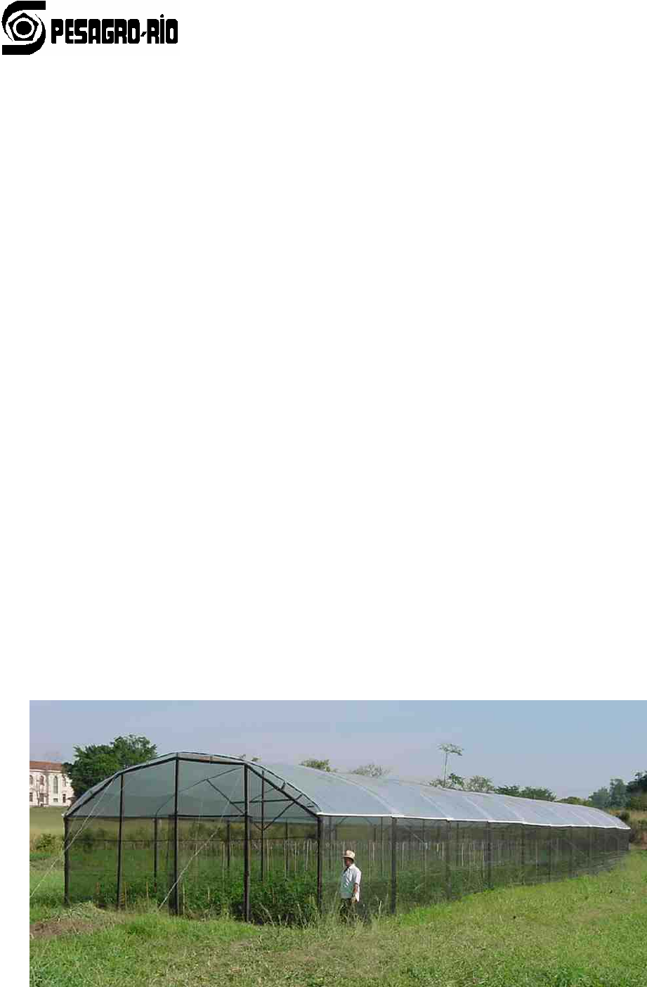 Empresa de Pesquisa Agropecuária do Estado do Rio de Janeiro. 1 ESTUFAS DE BAIXO CUSTO MODELO PESAGRO-RIO (Informe Técnico 29, ISSN 0101-3769) Marco Antonio de Almeida Leal Luiz Carlos Santos Caetano José Márcio Ferreira INTRODUÇÃO Atualmente existem várias atividades agrícolas e comerciais que dependem de estruturas com cobertura de plástico transparente, também conhecidas como “casas de vegetação” ou “estufas”. Entre estas atividades, as mais importantes são: cultivo protegido de hortaliças e plantas ornamentais, produção de mudas, hidroponia, secagem de grãos e comércio de plantas. Muitas vezes o fator que limita o início ou a expansão destas atividades é o alto custo das estufas. Além disto, muitas estufas comerciais não estão adaptadas para as condições climáticas de regiões tropicais. Visando solucionar estes problemas, a PESAGRO-RIO desenvolveu um modelo de estufa com as seguintes qualidades: • Custo reduzido, sendo três a cinco vezes inferior ao custo de uma estufa comercial. • Adaptada ao clima de regiões tropicais. • Dimensões flexíveis para se adaptarem a quaisquer necessidades. Larguras de 5 ou 8 metros. Comprimento e altura variáveis. • Fácil construção, não necessitando de mão de obra especializada. • Utiliza materiais facilmente encontrados na propriedade agrícola ou no comércio local. Empresa de Pesquisa Agropecuária do Estado do Rio de Janeiro. 2 Esta estrutura também pode ser utilizada como galpão para diversas atividades: depósito, criação animal, área de trabalho, etc. Para isto, deve ser coberta com plástico de dupla face (Duplalon®), sendo a face branca voltada para cima e a face preta voltada para baixo. CARACTERÍSTICAS Sua estrutura pode ser de madeira serrada (perna de três de Massaranduba ou Aparajú) ou madeira roliça (Eucalipto), com arcos feitos em vergalhão embutidos em mangueiras de borracha. A madeira serrada é mais fácil de encontrar no comércio local e possui maior durabilidade. Além de utilizar materiais simples, o baixo custo deste modelo é devido à sua estrutura ser travada com arames, como uma barraca de camping. Isto permite maior espaçamento entre os esteios e também o uso de varas de vergalhão no lugar de tubos de ferro galvanizado. Entretanto, sua vida útil é inferior a dos modelos comerciais, sendo variável em função da qualidade da madeira utilizada e dos cuidados com sua manutenção. É composta por módulos. O modelo de 8 metros de largura possui módulos de 3,50 metros e o modelo de 5 metros de largura possui módulos de 3,00 metros. O comprimento da estufa será variável em função do número de módulos construídos. Seu desenho permite uma excelente aeração, sendo que a altura do pé direito pode ser aumentada ou reduzida, de acordo com cada necessidade. Estufas altas permitem maior aeração, mas possuem maior custo e estão mais sujeitas à danos causados por vendavais. Para obter uma estrutura durável e eficiente é necessário seguir corretamente alguns detalhes de construção que serão explicados posteriormente. É importante que o construtor tenha conhecimentos de carpintaria e alinhamento de estruturas. Caso contrário é necessário contratar um carpinteiro ou mestre de obras. A manutenção da estufa é feita mantendo os arames de travamento sempre esticados e substituindo os arames arrebentados e as madeiras quebradas. Inicialmente, será mostrado o projeto de construção do modelo de 8,00m de largura, que exige maiores detalhes. Em seguida, será mostrado o projeto do modelo de 5,00m de largura, que aproveitará a maioria dos detalhes do modelo de largura maior. MODELO DE 8,00m DE LARGURA O projeto apresentado nas Figuras 1, 2, 3 e 4 é de uma estufa de 280m2 (10 módulos de 3,50m), com 2,50m de pé direito. Material e Custos Peças No 1 e 2: 15 pernas de três (6,0 x 7,5 cm) de Massaranduba com 4,50m. R$ 506,25 Peça No 3: 22 pernas de três (6,0 x 7,5 cm) de Massaranduba com 3,00m. R$ 495,00 Empresa de Pesquisa Agropecuária do Estado do Rio de Janeiro. 3 Peça No 4: 10 caibros (3,0 x 7,5 cm) de Massaranduba com 3,50m (ou 36m corridos). R$ 122,50 Peça No 5: 18 peças (5,0 x 2,5cm) de Massaranduba com 2,30m. R$ 58,50 Peça No 6: 9 peças (5,0 x 2,5cm) de Massaranduba com 2,00m. R$ 23,40 Peça No 7: 8 caibros (3,0 x 7,5 cm) de Massaranduba com 2,50m. R$ 70,00 Peça No 8: 20 caibros (3,0 x 7,5 cm) de Massaranduba com 3,50m (ou 71m corridos). R$ 245,00 25 ripas (3,0 x 1,5cm) de Eucalipto ou Cedrinho com 4,00m. R$ 100,00 11 varas de vergalhão 1/2” com no mínimo 10m de comprimento. R$ 440,00 100 metros de mangueira de polietileno ¾”. R$ 40,00 20 kg de arame No 12. R$ 130,00 3 kg de prego 19 x 36. R$ 18,00 2 kg de prego 15 x 15. R$ 16,00 100 metros de plástico agrícola de 100micras e 4,00m de largura. R$ 580,00 TOTAL R$ 2.844,65 Obs: − As pernas de três de Massaranduba podem ser substituídas por Eucalipto roliço com 25cm de diâmetro, e os caibros da cumeeira por Eucalipto roliço com 10cm de diâmetro. − Estes preços foram levantados em dezembro de 2005 no Rio de Janeiro. − A mão de obra necessária para construção desta estufa é de aproximadamente 20 dias/homem. − Neste orçamento não está incluído o custo da tela lateral ou outros acessórios. As peças No 5, 6 e 7 podem ser de qualquer outra madeira (Cedrinho, por exemplo), desde que não rachem facilmente ao serem pregadas. Não é recomendável Pinho por este ser muito atacado por cupins. As ripas, por levarem muitos pregos, devem ser de madeira macia (Cedrinho, Eucalipto) para não racharem. A mangueira de polietileno não necessita ser nova. Podem ser utilizadas mangueiras velhas, já furadas, ou mangueiras baratas de plástico reciclado. Não usar conduítes sanfonados. O plástico utilizado é de 100 micras de espessura e 4,00m de largura. Deve ser tratado contra raios ultravioleta. Sem este tratamento ele rasga rapidamente. Este plástico é facilment