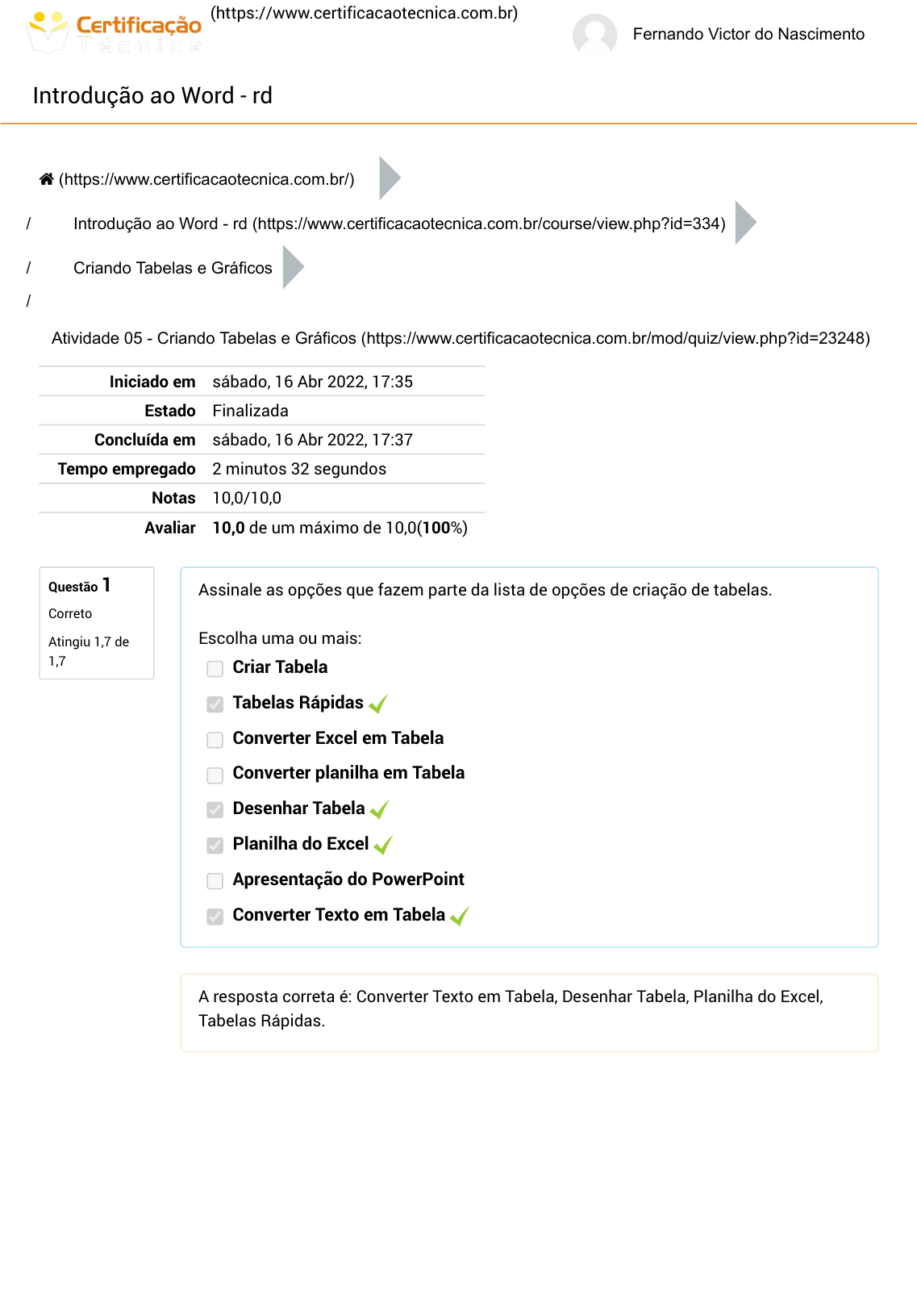 (https://www.certificacaotecnica.com.br) Fernando Victor do Nascimento Introdução ao Word - rd Questão 1 Correto Atingiu 1,7 de 1,7 / / / Iniciado em sábado, 16 Abr 2022, 17:35 Estado Finalizada Concluída em sábado, 16 Abr 2022, 17:37 Tempo empregado 2 minutos 32 segundos Notas 10,0/10,0 Avaliar 10,0 de um máximo de 10,0(100%) Assinale as opções que fazem parte da lista de opções de criação de tabelas. Escolha uma ou mais: Criar Tabela Tabelas Rápidas Converter Excel em Tabela Converter planilha em Tabela Desenhar Tabela Planilha do Excel Apresentação do PowerPoint Converter Texto em Tabela A resposta correta é: Converter Texto em Tabela, Desenhar Tabela, Planilha do Excel, Tabelas Rápidas. (https://www.certificacaotecnica.com.br/) Introdução ao Word - rd (https://www.certificacaotecnica.com.br/course/view.php?id=334) Criando Tabelas e Gráficos Atividade 05 - Criando Tabelas e Gráficos (https://www.certificacaotecnica.com.br/mod/quiz/view.php?id=23248) https://www.certificacaotecnica.com.br/ https://www.certificacaotecnica.com.br/ https://www.certificacaotecnica.com.br/course/view.php?id=334 https://www.certificacaotecnica.com.br/mod/quiz/view.php?id=23248 Questão 2 Correto Atingiu 1,7 de 1,7 Questão 3 Correto Atingiu 1,7 de 1,7 Questão 4 Correto Atingiu 1,7 de 1,7 Assinale as opções que NÃO fazem parte da lista de opções de AutoAjuste: Escolha uma ou mais: Largura Fixa de Linha AutoAjuste de Espaço AutoAjuste de Janela AutoAjuste de Conteúdo AutoAjuste de Célula Largura Fixa de Coluna A resposta correta é: AutoAjuste de Célula, AutoAjuste de Espaço, Largura Fixa de Linha. Qual a opção utilizada para transformar uma célula em duas? Escolha uma opção: a. Duplicar Tabela b. Dividir Tabela c. Dividir Células d. Duplicar Célula A resposta correta é: Dividir Células. Qual o caminho para a opção “Converter em Texto”? Escolha uma opção: a. Guia Layout > Linhas e Colunas > Converter em Texto b. Guia Design > Estilos de Tabela > Converter em Texto c. Guia Layout > Dados > Converter em Texto d. Guia Página Inicial > Estilo de Parágrafo > Converter em Texto A resposta correta é: Guia Layout > Dados > Converter em Texto. Questão 5 Correto Atingiu 1,7 de 1,7 Questão 6 Correto Atingiu 1,7 de 1,7 Em qual guia encontramos a opção “Estilos de Tabela”? Escolha uma opção: a. Guia Layout b. Guia Design c. Guia Formatar d. Guia Inserir A resposta correta é: Guia Design. Para que serve a opção “Mesclar Células”? Escolha uma opção: a. Para transformar duas ou mais células em apenas uma. b. Para agrupar células de um mesmo tipo. c. Para transformar uma célula em várias. d. Para definir uma margem entre as células. A resposta correta é: Para transformar duas ou mais células em apenas uma..