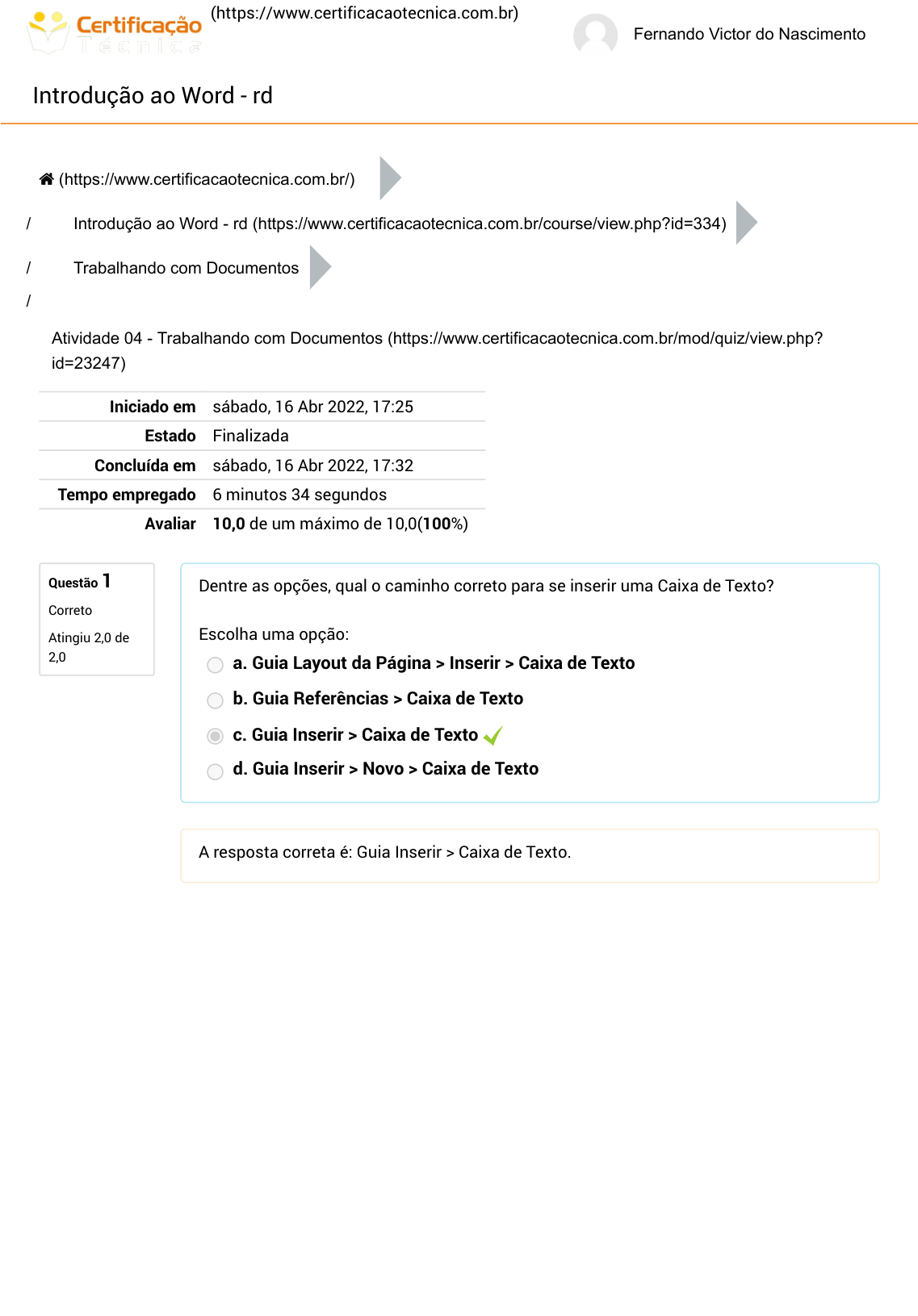 (https://www.certificacaotecnica.com.br) Fernando Victor do Nascimento Introdução ao Word - rd Questão 1 Correto Atingiu 2,0 de 2,0 / / / Iniciado em sábado, 16 Abr 2022, 17:25 Estado Finalizada Concluída em sábado, 16 Abr 2022, 17:32 Tempo empregado 6 minutos 34 segundos Avaliar 10,0 de um máximo de 10,0(100%) Dentre as opções, qual o caminho correto para se inserir uma Caixa de Texto? Escolha uma opção: a. Guia Layout da Página > Inserir > Caixa de Texto b. Guia Referências > Caixa de Texto c. Guia Inserir > Caixa de Texto d. Guia Inserir > Novo > Caixa de Texto A resposta correta é: Guia Inserir > Caixa de Texto. (https://www.certificacaotecnica.com.br/) Introdução ao Word - rd (https://www.certificacaotecnica.com.br/course/view.php?id=334) Trabalhando com Documentos Atividade 04 - Trabalhando com Documentos (https://www.certificacaotecnica.com.br/mod/quiz/view.php? id=23247) https://www.certificacaotecnica.com.br/ https://www.certificacaotecnica.com.br/ https://www.certificacaotecnica.com.br/course/view.php?id=334 https://www.certificacaotecnica.com.br/mod/quiz/view.php?id=23247 Questão 2 Correto Atingiu 2,0 de 2,0 Questão 3 Correto Atingiu 2,0 de 2,0 Questão 4 Correto Atingiu 2,0 de 2,0 De quais formas podemos revisar a ortografia e gramática das palavras? Escolha uma ou mais: a. Através da guia Correspondência basta selecionar a opção Corrigir. b. Ao clicar com o botão direito do mouse sobre a palavra escrita de forma errada. c. Na guia Inserir, basta clicar sobre a opção de Ortografia. d. Basta clicar na guia Revisão e escolher a opção Ortografia e Gramatica. A resposta correta é: Ao clicar com o botão direito do mouse sobre a palavra escrita de forma errada., Basta clicar na guia Revisão e escolher a opção Ortografia e Gramatica.. Após inserir uma nova Caixa de Texto, é aberta uma nova guia. Qual o nome desta guia? Escolha uma opção: a. Novidades b. Formatar c. Editar d. Adicionar A resposta correta é: Formatar. Quando uma palavra está sublinhada em verde, o que isto significa? Escolha uma opção: a. Significa que há um erro gramatical nesta palavra. b. Significa que há uma nova forma a ser inserida na caixa de texto. c. Significa que o texto foi revisado corretamente. d. Significa que há um erro de concordância gramatical nesta palavra ou frase. A resposta correta é: Significa que há um erro de concordância gramatical nesta palavra ou frase.. Questão 5 Correto Atingiu 2,0 de 2,0 Dentre as opções, quais delas estão localizadas na guia Formatar? Escolha uma ou mais: a. Estilos de Forma b. Formas c. Revisão d. Correspondência A resposta correta é: Estilos de Forma, Formas.