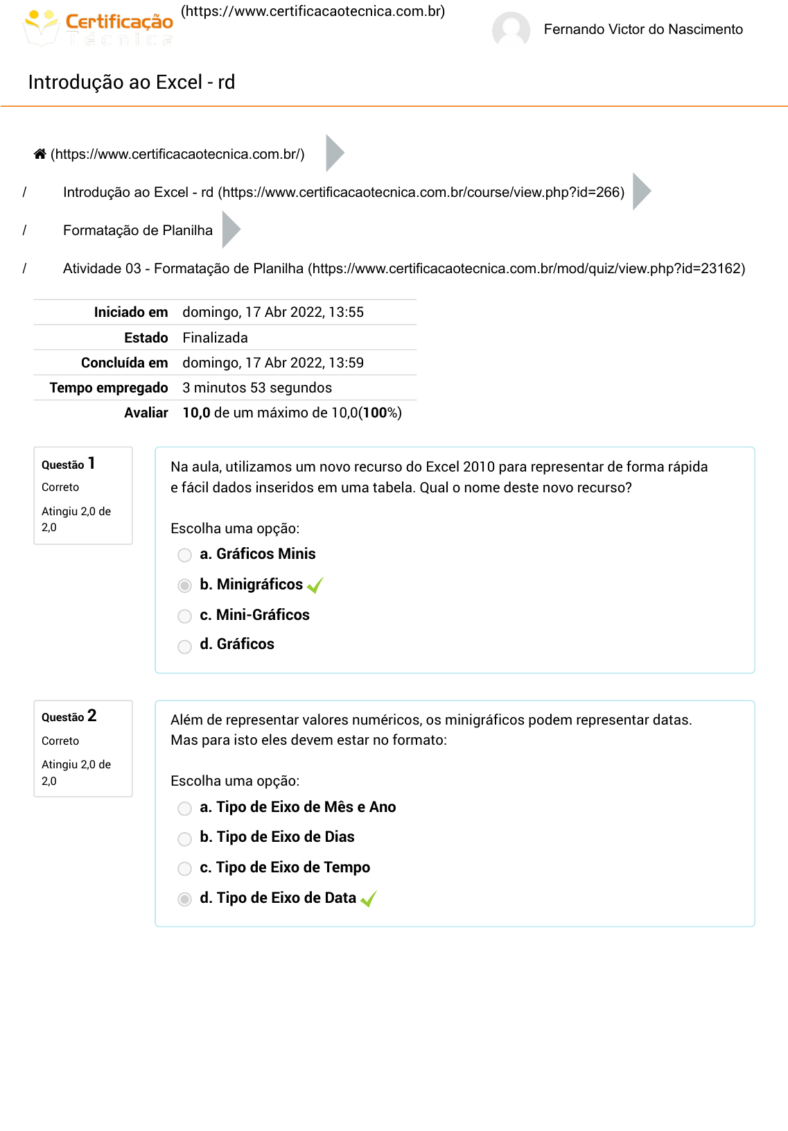 (https://www.certificacaotecnica.com.br) Fernando Victor do Nascimento Introdução ao Excel - rd Questão 1 Correto Atingiu 2,0 de 2,0 Questão 2 Correto Atingiu 2,0 de 2,0 / / / Iniciado em domingo, 17 Abr 2022, 13:55 Estado Finalizada Concluída em domingo, 17 Abr 2022, 13:59 Tempo empregado 3 minutos 53 segundos Avaliar 10,0 de um máximo de 10,0(100%) Na aula, utilizamos um novo recurso do Excel 2010 para representar de forma rápida e fácil dados inseridos em uma tabela. Qual o nome deste novo recurso? Escolha uma opção: a. Gráficos Minis b. Minigráficos c. Mini-Gráficos d. Gráficos Além de representar valores numéricos, os minigráficos podem representar datas. Mas para isto eles devem estar no formato: Escolha uma opção: a. Tipo de Eixo de Mês e Ano b. Tipo de Eixo de Dias c. Tipo de Eixo de Tempo d. Tipo de Eixo de Data (https://www.certificacaotecnica.com.br/) Introdução ao Excel - rd (https://www.certificacaotecnica.com.br/course/view.php?id=266) Formatação de Planilha Atividade 03 - Formatação de Planilha (https://www.certificacaotecnica.com.br/mod/quiz/view.php?id=23162) https://www.certificacaotecnica.com.br/ https://www.certificacaotecnica.com.br/ https://www.certificacaotecnica.com.br/course/view.php?id=266 https://www.certificacaotecnica.com.br/mod/quiz/view.php?id=23162 Questão 3 Correto Atingiu 2,0 de 2,0 Questão 4 Correto Atingiu 2,0 de 2,0 Questão 5 Correto Atingiu 2,0 de 2,0 Além do formato de linhas, os minigráficos podem ser exibidos nos formatos de: Escolha uma opção: a. Barras e Colunas b. Cilindros e Colunas c. Colunas e Ganha/Perde d. Barras Em forma de Linha, um minigráfico pode apresentar em seu corpo pontos para facilitar a representação dos dados. Como se chamam estes pontos? Escolha uma opção: a. Eixos b. Marcas de pontos c. Marcas d. Marcadores Ao contrário dos gráficos o Minigráfico, novo recurso do Excel, é tratado como: Escolha uma opção: a. Uma forma configurável b. Um plano de fundo de célula c. Uma célula ilustrativa d. Um objeto editável