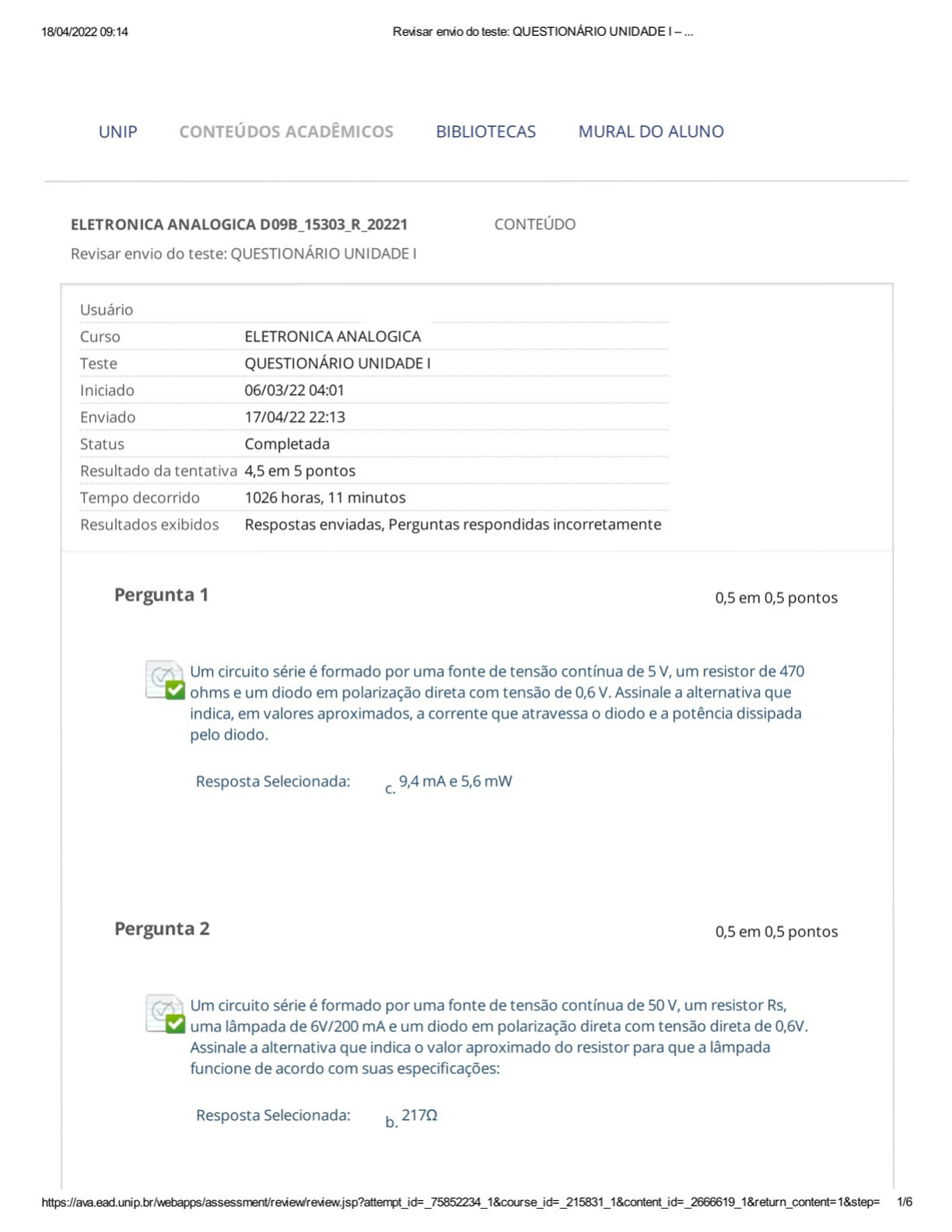 18/04/2022 09:14 Revisar envio do teste: QUESTIONÁRIO UNIDADE |... UNIP CONTEÚDOS ACADÊMICOS BIBLIOTECAS MURAL DO ALUNO ELETRONICA ANALOGICA DO9B 15303 R 20221 CONTEÚDO Revisar envio do teste: QUESTIONÁRIO UNIDADE | Usuário Curso ELETRONICA ANALOGICA Teste QUESTIONÁRIO UNIDADE | Iniciado 06/03/22 04:01 Enviado 17/04/22 22:13 Status Completada Resultado da tentativa 4,5 em 5 pontos Tempo decorrido 1026 horas, 11 minutos Resultados exibidos | Respostas enviadas, Perguntas respondidas incorretamente Pergunta 1 0,5 em 0,5 pontos “7, Um circuito série é formado por uma fonte de tensão contínua de 5 V, um resistor de 470 - ohms e um diodo em polarização direta com tensão de 0,6 V. Assinale a alternativa que indica, em valores aproximados, a corrente que atravessa o diodo e a potência dissipada pelo diodo. Resposta Selecionada: c. 94 MÃe 5,6 mW Pergunta 2 0,5 em 0,5 pontos “7 Um circuito série é formado por uma fonte de tensão contínua de 50 V, um resistor Rs, uma lâmpada de 6V/200 mA e um diodo em polarização direta com tensão direta de 0,6V. Assinale a alternativa que indica o valor aproximado do resistor para que a lâmpada funcione de acordo com suas especificações: Resposta Selecionada: pb. 2170 https://ava.ead.unip.briwebapps/assessment/revew'review.jsp?attempt id= 75852234 1&course id= 215831 1&content id= 2666619 1&return content=1&step= 1/6 http://company.blackboard.com/ https://ava.ead.unip.br/webapps/blackboard/execute/courseMain?course_id=_215831_1 https://ava.ead.unip.br/webapps/blackboard/content/listContent.jsp?course_id=_215831_1&content_id=_2663831_1&mode=reset https://ava.ead.unip.br/webapps/portal/execute/tabs/tabAction?tab_tab_group_id=_49_1 https://ava.ead.unip.br/webapps/portal/execute/tabs/tabAction?tab_tab_group_id=_27_1 https://ava.ead.unip.br/webapps/portal/execute/tabs/tabAction?tab_tab_group_id=_47_1 https://ava.ead.unip.br/webapps/portal/execute/tabs/tabAction?tab_tab_group_id=_25_1 https://ava.ead.unip.br/webapps/login/?action=logout 18/04/2022 09:14 Revisar envio do teste: QUESTIONÁRIO UNIDADE I – ... https://ava.ead.unip.br/webapps/assessment/review/review.jsp?attempt_id=_75852234_1&course_id=_215831_1&content_id=_2666619_1&return_content=1&step= 2/6 Pergunta 3 Resposta Selecionada: d. Um técnico recebeu um circuito série formado por uma fonte de tensão contínua de 9 V, um diodo com tensão direta de 0,2 V (Germânio)/corrente máxima de 50 mA e um resistor de 47 ohms, porém, antes de ligá-lo descon�ou que ele estaria mal dimensionado. Analise o circuito e assinale a alternativa correta: O técnico tem razão, pois nesta con�guração a corrente que circula no diodo é de 187 mA. Pergunta 4 Resposta Selecionada: e. Um reti�cador de onda completa em ponte com tensão de pico no secundário de 20,2V utiliza diodos com tensão direta de 0,6V e uma carga de 15 ohms. Assinale a alternativa que indica a tensão média e a corrente média na carga. 12,1V e 0,81A Pergunta 5 0,5 em 0,5 pontos 0,5 em 0,5 pontos 0,5 em 0,5 pontos 18/04/2022 09:14 Revisar envio do teste: QUESTIONÁRIO UNIDADE |-... Pergunta 3 0,5 em 0,5 pontos Um técnico recebeu um circuito série formado por uma fonte de tensão contínua de 9V, um diodo com tensão direta de 0,2 V (Germânio)/corrente máxima de 50 mA e um resistor de 47 ohms, porém, antes de ligá-lo desconfiou que ele estaria mal dimensionado. Analise o circuito e assinale a alternativa correta: Resposta d. Selecionada: O técnico tem razão, pois nesta configuração a corrente que circula no diodo é de 187 ma. Pergunta 4 0,5 em 0,5 pontos Um retificador de onda completa em ponte com tensão de pico no secundário de 20,2V | utiliza diodos com tensão direta de 0,6V e uma carga de 15 ohms. Assinale a alternativa que indica a tensão média e a corrente média na carga. Resposta Selecionada: e 12.1V e 0,814 Pergunta 5 0,5 em 0,5 pontos RR https://ava.ead.unip.brAwebapps/assessment/review'review.jsp?attempt id= 75852234 1&course id= 215831 1&content id= 2666619 1&return content=1&step= 2/6 18/04/2022 09:14 Revisar envio do teste: QUESTIONÁRIO UNIDADE I – ... https://ava.ead.unip.br/webapps/assessment/review/review.jsp?attempt_id=_75852234_1&course_id=_215831_1&content_id=_2666619_1&return_content=1&step= 3/6 Resposta Selecionada: c. I = 5,000 [mA] Pergunta 6 0,5 em 0,5 pontos 18/04/2022 09:14 Revisar envio do teste: QUESTIONÁRIO UNIDADE |-... Uma das representações que podem ser utilizadas para descrever o comportamento de diodos reais está apresentada na figura. I | Va I Diodo ideal Essa representação é empregada para a solução do circuito ilustrado. E MANY 1975 [9] Fls 10,65 [V] — MY Diodo ideal Fonte: Concurso Público. Dado que Voo = 0,65 [V] e ro = 25 [0], assinale a alternativa que apresenta corretamente o valor da corrente indicada na figura. Resposta Selecionada: c | = 5,000 [mA] Pergunta 6 0,5 em 0,5 pontos 4 https://ava.ead.unip.brAwebapps/assessment/revew'review.jsp?attempt id= 75852234 1&course id= 215831 1&content id= 2666619 1&return content=1&step= 3/6 18/04/2022 09:14 Revisar envio do teste: QUESTIONÁRIO UNIDADE I – ... https://ava.ead.unip.br/webapps/assessment/review/review.jsp?attempt_id=_75852234_1&course_id=_215831_1&content_id=_2666619_1&return_content=1&step= 4/6 Resposta Selecionada: a. 2,8 [V] e 1,00 [mA] Pergunta 7 Resposta Selecionada: e. 1,9V 0,5 em 0,5 pontos 18/04/2022 09:14 Revisar envio do teste: QUESTIONÁRIO UNIDADE |-... Uma forma de executar a regulação de tensão é conectar diodos em série, conforme ilustrado. 7,2 [KO] + 10 [MI =>D— 28 [kQ] |V A N Y Fonte: Concurso Público. Dado que o modelo de fonte de tensão constante pode ser utilizado para representar os diodos, assinale a alternativa que apresenta, aproximada e respectivamente, os valores da tensão e da corrente indicadas na figura. (Considere que a fonte de tensão constante, utilizada para representar o diodo, possui tensão igual a 0,7 [V]) Resposta Selecionada: a 2,8 [V]