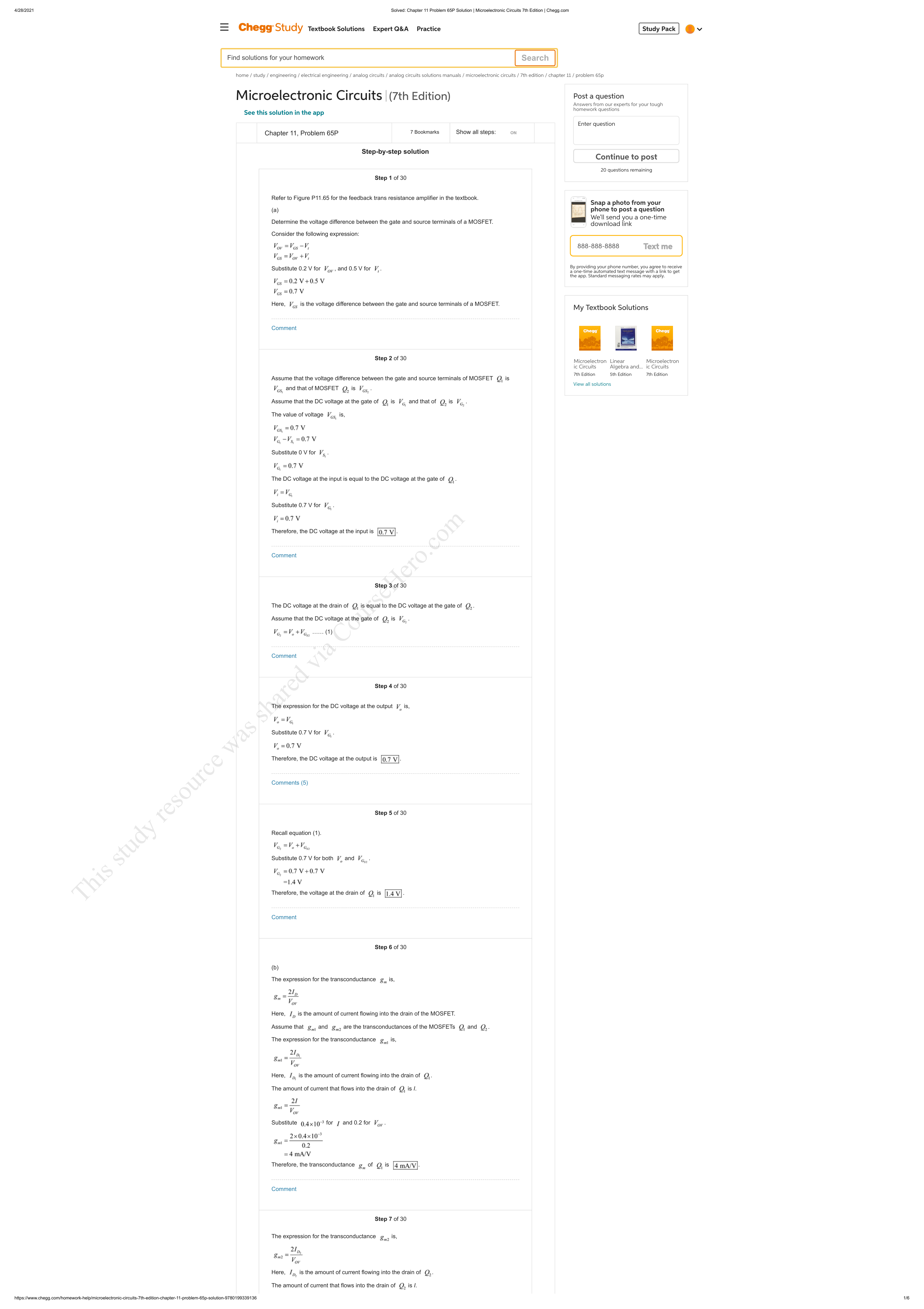 4/28/2021 Solved: Chapter 11 Problem 65P Solution | Microelectronic Circuits 7th Edition | Chegg.com https://www.chegg.com/homework-help/microelectronic-circuits-7th-edition-chapter-11-problem-65p-solution-9780199339136 1/6 home / study / engineering / electrical engineering / analog circuits / analog circuits solutions manuals / microelectronic circuits / 7th edition / chapter 11 / problem 65p Microelectronic Circuits (7th Edition) See this solution in the app 7 Bookmarks Show all steps:Chapter 11, Problem 65P ON Step-by-step solution Refer to Figure P11.65 for the feedback trans resistance amplifier in the textbook. (a) Determine the voltage difference between the gate and source terminals of a MOSFET. Consider the following expression: Substitute 0.2 V for , and 0.5 V for . Here, is the voltage difference between the gate and source terminals of a MOSFET. Comment Assume that the voltage difference between the gate and source terminals of MOSFET is and that of MOSFET is . Assume that the DC voltage at the gate of is and that of is . The value of voltage is, Substitute 0 V for . The DC voltage at the input is equal to the DC voltage at the gate of . Substitute 0.7 V for . Therefore, the DC voltage at the input is . Comment The DC voltage at the drain of is equal to the DC voltage at the gate of . Assume that the DC voltage at the gate of is . …… (1) Comment The expression for the DC voltage at the output is, Substitute 0.7 V for . Therefore, the DC voltage at the output is . Comments (5) Recall equation (1). Substitute 0.7 V for both and . Therefore, the voltage at the drain of is . Comment (b) The expression for the transconductance is, Here, is the amount of current flowing into the drain of the MOSFET. Assume that and are the transconductances of the MOSFETs and . The expression for the transconductance is, Here, is the amount of current flowing into the drain of . The amount of current that flows into the drain of is I. Substitute for and 0.2 for . Therefore, the transconductance of is . Comment The expression for the transconductance is, Here, is the amount of current flowing into the drain of . The amount of current that flows into the drain of is I. Step 1 of 30 Step 2 of 30 Step 3 of 30 Step 4 of 30 Step 5 of 30 Step 6 of 30 Step 7 of 30 My Textbook Solutions Microelectron ic Circuits 7th Edition Linear Algebra and... 5th Edition Microelectron ic Circuits 7th Edition View all solutions Post a question Answers from our experts for your tough homework questions Enter question Continue to post 20 questions remaining Snap a photo from your phone to post a question We'll send you a one-time download link 888-888-8888 Text me By providing your phone number, you agree to receive a one-time automated text message with a link to get the app. Standard messaging rates may apply. Find solutions for your homework Search Textbook Solutions Expert Q&A Practice Study Pack This study source was downloaded by 100000827170594 from CourseHero.com on 09-23-2021 13:49:50 GMT -05:00 https://www.coursehero.com/file/90885384/Solved-Chapter-11-Problem-65P-Solution-Microelectronic-Circuits-7th-Edition-Cheggcompdf/ Th is stu dy re so ur ce w as sh are d v ia Co ur se He ro .co m https://www.coursehero.com/file/90885384/Solved-Chapter-11-Problem-65P-Solution-Microelectronic-Circuits-7th-Edition-Cheggcompdf/ 4/28/2021 Solved: Chapter 11 Problem 65P Solution | Microelectronic Circuits 7th Edition | Chegg.com https://www.chegg.com/homework-help/microelectronic-circuits-7th-edition-chapter-11-problem-65p-solution-9780199339136 2/6 Substitute for and 0.2 for . Therefore, the transconductance of is . Comment The expression for of is, Substitute 16 V for , and 0.4 mA for . The value of of is . Comment The expression for of is, Substitute 16 V for , and 0.4 mA for . The value of of is . Comment (c) Draw the circuit as shown in figure 1. Comment Determine the gain A. Consider the following expression: …… (2) Apply Nodal analysis at node-X. Apply Source transformation technique at node-Y and determine . Substitute for . …… (3) Comment Determine . Apply Voltage-division principle at the output node and obtain . …… (4) Recall equation (3). Substitute the above expression for in equation (4). …… (5) Therefore, the expression for A is, . Comment (d) Draw the feedback circuit for as shown in figure 2. Step 8 of 30 Step 9 of 30 Step 10 of 30 Step 11 of 30 Step 12 of 30 Step 13 of 30 Textbook Solutions Expert Q&A Practice Study Pack This study source was downloaded by 100000827170594 from CourseHero.com on 09-23-2021 13:49:50 GMT -05:00 https://www.coursehero.com/file/90885384/Solved-Chapter-11-Problem-65P-Solution-Microelectronic-Circuits-7th-Edition-Cheggcompdf/ Th is stu dy re so ur ce w as sh are d v ia Co ur se He ro .co m https://www.coursehero.com/file/90885384/Solved-Chapter-11-Problem-65P-Solution-Microelectronic-Circuits-7th-Edition-Cheggcompdf/ 4/28/2021 Solved: Chapter 11 Problem 65P Solution | Microelectronic Circuits 7th Edition | Chegg.com https://www.chegg.com/homework-help/microelectronic-circuits-7th-edition-chapter-11-problem-65p-solution-9780199339136 3/6 Comment Determine the relation between and . Apply Kirchhoff’s voltage law to the circuit shown in figure 2. …… (6) The expression for is, Consider equation (6). Substitute the expression for . Therefore, the feedback factor is . Comment The expression for loop gain is, …… (7) Therefore, the expression for loop gain is . Comment The expression for the amount of feedback is, …… (8) Therefore, the expression for the amount of feedback is, . Comment (e) Consider the following expression: …… (9) Recall equations (5) and (8). Substitute the above expressions in equation (9). Therefore, the expression for is . Comment Step 14 of 30 Step 15 of 30 Step 16 of 30 Step 17 of 30 Step 18 of 30 Textbook Solutions Expert Q&A Practice Study Pack This study source was downloaded by 100000827170594 from CourseHero.com on 09-23-2021 1