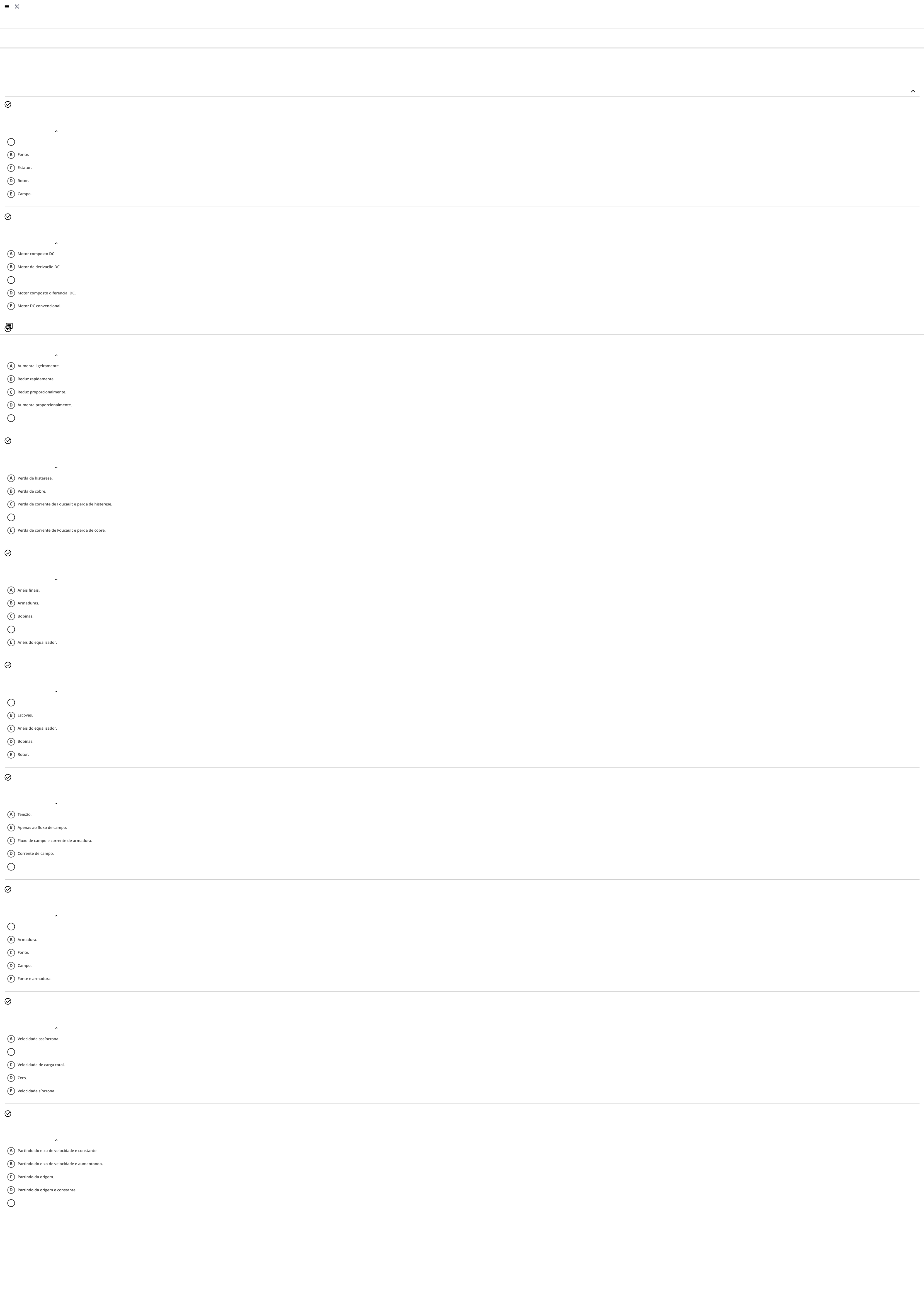 Avaliação On-Line 4 (AOL 4) – Questionário Conteúdo do exercício Ocultar opções de resposta Ocultar opções de resposta Ocultar opções de resposta Ocultar opções de resposta Ocultar opções de resposta Ocultar opções de resposta Ocultar opções de resposta Ocultar opções de resposta Ocultar opções de resposta Ocultar opções de resposta Comentários Avaliação On-Line 4 (AOL 4) – Questionário Fabio Lima Pergunta 1 1 /1 A parte rotativa da máquina DC é conhecida como: A Resposta corretaArmadura. B Fonte. C Estator. D Rotor. E Campo. Pergunta 2 1 /1 Qual dos seguintes motores CC é empregado em aplicações de alta tração? A Motor composto DC. B Motor de derivação DC. C Resposta corretaMotor em série DC. D Motor composto diferencial DC. E Motor DC convencional. Pergunta 3 1 /1 À medida que a carga aumenta, a velocidade do motor de derivação CC: A Aumenta ligeiramente. B Reduz rapidamente. C Reduz proporcionalmente. D Aumenta proporcionalmente. E Resposta corretaReduz ligeiramente. Pergunta 4 1 /1 A armadura da máquina DC é laminada para reduzir qual das seguintes opções? A Perda de histerese. B Perda de cobre. C Perda de corrente de Foucault e perda de histerese. D Resposta corretaPerda de corrente de Foucault. E Perda de corrente de Foucault e perda de cobre. Pergunta 5 1 /1 A função das(os) _______ no gerador DC é coletar corrente do comutador e entregá-la ao circuito externo. A Anéis finais. B Armaduras. C Bobinas. D Resposta corretaEscovas. E Anéis do equalizador. Pergunta 6 1 /1 No gerador DC, qual dos seguintes dispositivos desempenha um papel importante no fornecimento de corrente contínua: A Resposta corretaComutador. B Escovas. C Anéis do equalizador. D Bobinas. E Rotor. Pergunta 7 1 /1 O torque da armadura do motor de derivação CC é proporcional ao(à): A Tensão. B Apenas ao fluxo de campo. C Fluxo de campo e corrente de armadura. D Corrente de campo. E Resposta corretaSomente a corrente de armadura. Pergunta 8 1 /1 O sentido de rotação do motor DC em série pode ser revertido trocando os terminais: A Resposta corretaArmadura e campo. B Armadura. C Fonte. D Campo. E Fonte e armadura. Pergunta 9 1 /1 Se o fluxo do motor DC atingir zero, sua velocidade se tornará: A Velocidade assíncrona. B Resposta corretaInfinita. C Velocidade de carga total. D Zero. E Velocidade síncrona. Pergunta 10 1 /1 A característica do torque de velocidade do motor de derivação CC é: A Partindo do eixo de velocidade e constante. B Partindo do eixo de velocidade e aumentando. C Partindo da origem. D Partindo da origem e constante. E Resposta corretaPartindo do eixo de velocidade e diminuindo. Comentários para o aluno Seu instrutor não fez comentários 10/10 Nota final Enviado em: 19/04/22 20:48 (BRT) ××