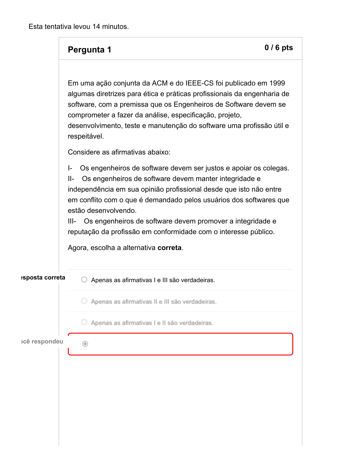 Esta tentativa levou 14 minutos. 0 / 6 ptsPergunta 1 Em uma ação conjunta da ACM e do IEEE-CS foi publicado em 1999 algumas diretrizes para ética e práticas profissionais da engenharia de software, com a premissa que os Engenheiros de Software devem se comprometer a fazer da análise, especificação, projeto, desenvolvimento, teste e manutenção do software uma profissão útil e respeitável. Considere as afirmativas abaixo: I- Os engenheiros de software devem ser justos e apoiar os colegas. II- Os engenheiros de software devem manter integridade e independência em sua opinião profissional desde que isto não entre em conflito com o que é demandado pelos usuários dos softwares que estão desenvolvendo. III- Os engenheiros de software devem promover a integridade e reputação da profissão em conformidade com o interesse público. Agora, escolha a alternativa correta. Apenas as afirmativas I e III são verdadeiras.Resposta corretaResposta correta Todas as afirmativas são verdadeiras.Você respondeuVocê respondeu As afirmativas I e III são corretas por serem 2 dos 8 princípios do referido código de ética apresentado no livro do Ian Sommerville. Por outro lado, a afirmativa II está incorreta. Apesar da primeira parte da afirmativa estar alinhada um desses princípios, os engenheiros de software não necessariamente devem ser subservientes às demandas dos seus usuários. Enfim, a resposta é a opção: Apenas as afirmativas I e III são verdadeiras. 6 / 6 ptsPergunta 2 A Engenharia de Software promove o desenvolvimento de software de qualidade com produtividade. Marque a alternativa que apresenta uma afirmativa incorreta sobre a Engenharia de Software. A engenharia de software se pauta exclusivamente na documentação das tarefas de atividades metodológicas para promover o desenvolvimento de software de qualidade. Correto!Correto! Sobre a alternativa que fala sobre documentação de tarefas, é absolutamente equivocado relacionar, de forma exclusiva, isto (a documentação) ao conceito básico de Engenharia de Software. As outras 3 (três) alternativas estão bem relacionadas às definições clássicas de Engenharia de Software, que se pautam no desenvolvimento de software de qualidade com produtividade. 6 / 6 ptsPergunta 3 As atividades metodológicas de um processo genérico de software podem ser organizadas em diferentes tipos de fluxo, dos quais se destacam: linear, iterativo, evolucionário e paralelo. Analise as alternativas abaixo e escolha a único que é correta. No fluxo de processos evolucionário, ao final de cada “giro” por todas as atividades metodológicas há uma nova versão do software mais completa que a anterior. Correto!Correto! No fluxo de processos em paralelo as atividades metodológicas podem ser executadas em paralelo pelo time de software e não cada uma ser executada por mais de um engenheiro de software. Processos de software caracterizados pelo tipo de fluxo linear não flexibilizam a ordem cronológica de realização das suas atividades metodológicas. Por isto, a alternativa sobre este tipo de fluxo é incorreta. Como o fluxo de processos iterativo (e não interativo) promove a repetição de qualquer atividade metodológica, ou seja, sem ênfase na atividade de comunicação, a alternativa sobre os fluxos de processos iterativos também está incorreta. A premissa básica do fluxo de processos evolucionário é exatamente executar cada uma das atividades metodológicas (comunicação, planejamento, modelagem, construção e entrega) de forma circular (“giro”) para se construir um software de forma incremental. Desta forma, a alternativa correta é aquela sobre os fluxos de processos evolucionários. 0 / 6 ptsPergunta 4 Padrões de processo contribuem com a solução de problemas ou dúvidas relacionadas ao uso de processos de software uma vez que registram situações que podem se repetir em projetos distintos, assim como as possíveis soluções e/ou orientações associadas. A literatura da área de engenharia de software apresenta modelos para escrita de diferentes tipos de padrões de processo, tais como, padrões de estágio, padrões de tarefa, padrões de fase, entre outros. Escolha a alternativa que apresenta uma afirmativa incorreta sobre padrões de processo de software. É possível definir padrões de processo tanto para uma atividade metodológica quanto para uma de suas tarefas. Você respondeuVocê respondeu A criação de padrões de processo deve acontecer de forma continuada e sistemática para não comprometer a qualidade do software. Resposta corretaResposta correta Como o uso de padrões de processo registra situações que podem se repetir, o que contribui com a solução de problemas no futuro, o time de software evidencia a sua evolução uma vez que menos problemas ficarão sem solução, aumentando assim a sua produtividade e consequente qualidade do software. Como a contextualização desta questão apresentou, há vários modelos para padrões de processo, seja ele para uma atividade metodológica como um todo ou para uma tarefa específica. Destaca-se também que o uso de padrões de processo também contribui com a maturidade da equipe de software, pois, se registrou e aprendeu, evoluiu ao longo do tempo. Por outro lado, não há orientação de que a construção de padrões de processo deva acontecer de forma continuada e sistemática para garantia da qualidade do software. Assim, a afirmativa sobre criação continuada e sistemática de padrões de processos está incorreta. 6 / 6 ptsPergunta 5 De acordo com Roger Pressman, “Um processo de software define a abordagem adotada conforme um software é elaborado pela engenharia. Mas, a engenharia de software também engloba tecnologias que fazem parte do processo – métodos, técnicas e ferramentas automatizadas”. Escolha a alternativa correta. A engenharia de software pode ser praticada com diferentes processos de software. Correto!Correto! Ex