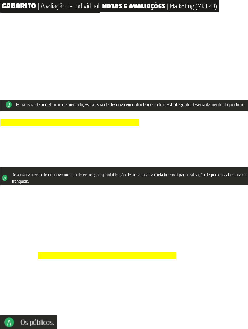 1 - A organização sempre deverá estar preparada para quando surgirem novas oportunidades, pois é importante identificar as mutações que ocorrem no mercado. Para tanto, Kotler (2011) sugere algumas estratégias para ampliação das vendas e para a busca de novos mercados e novos segmentos com outros produtos; uma diferenciação perante seus concorrentes. Acerca das estratégias para o crescimento da organização, assinale a alternativa CORRETA: FONTE: KOTLER, P. Administração de marketing: análise, planejamento, implementação e controle. 5. ed. 9. reimpr. São Paulo: Atlas, 2011. CURTE AÍ VAI!! me ajuda na gameficação... 2- Ao iniciarmos um empreendimento, existem sempre oportunidades e ameaças com relação ao seu estabelecimento. Sobre essas oportunidades que podem ocorrer, assinale a alternativa CORRETA: B) Desenvolvimento de um novo modelo de entrega; não disponibilização de um aplicativo pela internet para realização de pedidos; não realização de divulgação nas mídias sociais. C) Imitação da operação da concorrência; disponibilização de um aplicativo pela internet para realização de pedidos; não abertura de franquias. D) Imitação da operação da concorrência; disponibilização de um aplicativo pela internet para realização de pedidos; abertura de franquias. CURTE AÍ VAI!! me ajuda na gameficação... 3 -Dentro do Microambiente das empresas, determinado grupo tem vantagem tangível ou potencial que causa impacto na capacidade da organização em alcançar seus objetivos. Quanto ao grupo o qual o enunciado se refere, assinale a alternativa CORRETA: B)Fornecedores. C) Clientes. D) Concorrentes. 2 - Dentro do composto de marketing há 4 CS, os quais são direcionados para o cliente. Acerca dos 4CS, associe os itens, utilizando o código a seguir: I- Cliente./ II- Conveniência. / III- Comunicação. / IV- Custo. ( ) É fundamental o cliente saber da existência do produto de sua organização. Utilizar ferramentas de comunicação, como revista, jornal, internet, e-mail, telemarketing, dentre outros. ( ) É o consumidor na busca de produtos e serviços para suprir suas necessidades e/ou desejos. ( ) A organização deverá estar ciente de que o consumidor, em hipótese alguma, irá pagar um valor muito alto, visto que para a empresa é o preço, já para o cliente é o custo. ( ) O profissional de marketing deve ter o cuidado de identificar o melhor local para distribuir seus produtos, ou efetuar seus serviços em caso de um modelo de negócio físico, em que o cliente vá até ele.Assinale a alternativa que apresenta a sequência CORRETA: B) I - II - III - IV. C) IV - III - II - I. D) III - IV - I - II. 4 - Dentro do composto de marketing há 4 CS, os quais são direcionados para o cliente. Acerca dos 4CS, associe os itens, utilizando o código a seguir: I- Cliente./ II- Conveniência. / III- Comunicação. / IV- Custo. ( ) É fundamental o cliente saber da existência do produto de sua organização. Utilizar ferramentas de comunicação, como revista, jornal, internet, e-mail, telemarketing, dentre outros. ( ) É o consumidor na busca de produtos e serviços para suprir suas necessidades e/ou desejos. ( ) A organização deverá estar ciente de que o consumidor, em hipótese alguma, irá pagar um valor muito alto, visto que para a empresa é o preço, já para o cliente é o custo. ( ) O profissional de marketing deve ter o cuidado de identificar o melhor local para distribuir seus produtos, ou efetuar seus serviços em caso de um modelo de negócio físico, em que o cliente vá até ele.Assinale a alternativa que apresenta a sequência CORRETA: B) I - II - III - IV. C) IV - III - II - I. D) III - IV - I - II. 5 - Dentro do composto de marketing há 4 CS, os quais são direcionados para o cliente. Acerca dos 4CS, associe os itens, utilizando o código a seguir: I- Cliente./ II- Conveniência. / III- Comunicação. / IV- Custo. ( ) É fundamental o cliente saber da existência do produto de sua organização. Utilizar ferramentas de comunicação, como revista, jornal, internet, e-mail, telemarketing, dentre outros. ( ) É o consumidor na busca de produtos e serviços para suprir suas necessidades e/ou desejos. ( ) A organização deverá estar ciente de que o consumidor, em hipótese alguma, irá pagar um valor muito alto, visto que para a empresa é o preço, já para o cliente é o custo. ( ) O profissional de marketing deve ter o cuidado de identificar o melhor local para distribuir seus produtos, ou efetuar seus serviços em caso de um modelo de negócio físico, em que o cliente vá até ele.Assinale a alternativa que apresenta a sequência CORRETA: B) I - II - III - IV. C) IV - III - II - I. D) III - IV - I - II. 15 - Dentro do composto de marketing há 4 CS, os quais são direcionados para o cliente. Acerca dos 4CS, associe os itens, utilizando o código a seguir: I- Cliente./ II- Conveniência. / III- Comunicação. / IV- Custo. ( ) É fundamental o cliente saber da existência do produto de sua organização. Utilizar ferramentas de comunicação, como revista, jornal, internet, e-mail, telemarketing, dentre outros. ( ) É o consumidor na busca de produtos e serviços para suprir suas necessidades e/ou desejos. ( ) A organização deverá estar ciente de que o consumidor, em hipótese alguma, irá pagar um valor muito alto, visto que para a empresa é o preço, já para o cliente é o custo. ( ) O profissional de marketing deve ter o cuidado de identificar o melhor local para distribuir seus produtos, ou efetuar seus serviços em caso de um modelo de negócio físico, em que o cliente vá até ele.Assinale a alternativa que apresenta a sequência CORRETA: B) I - II - III - IV. C) IV - III - II - I. D) III - IV - I - II.