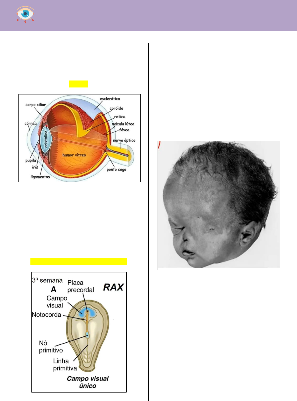 O Sistema Sensorial consiste em dois órgãos principais, sendo: os olhos e as orelhas internas. Lembrando que ambos os órgãos são derivados de vesículas encefálicas. OLHOS O aparelho visual tem origem de diversos tecidos embrionários: -Ectoderma -Neuroectoderma: diencéfalo (ectoderme agora com características de células neurais) -Células da crista neural -Mesoderma ESTABELECENDO O CAMPO VISUAL Qual a região do embrião de 3° semana que será importante para o desenvolvimento dos olhos? O campo visual está presente na região cranial do disco trilaminar, próximo à placa precordal. Assim, as células epiblásticas do campo visual são determinadas a constituírem parte dos olhos por um fator de transcrição denominado RAX. - A não-expressão correta desse gene leva a não-formação dos olhos, denominada anoftalmia. O campo visual no início do desenvolvimento é único. Durante o desenvolvimento, especificamente na 4° semana (quando o tubo neural completa seu fechamento), tem-se uma linha mediana, que converge com o fechamento do tubo neural. Sabe-se que essa linha mediana tem uma alta expressão de sonic hedhog (Shh). Logo, o sonic hedhog será responsável por separar/dividir o campo visual e determinar a formação dos dois olhos. Quando há erros na expressão de Shh e mais fatores envolvidos tem-se o fenômeno de ciclopia. Desenvolvimento do Sistema Sensorial Desenvolvimento dos Olhos A primeira evidência do olho humano surge no 22° dia de gestação pós-fecundação através do aparecimento do sulco(invaginação) óptico na região do diencéfalo “presuntivo”. *presuntivo”: onde será a região do diencéfalo, uma vez que no 22° não houve ainda a formação das vesículas secundárias. A invaginação é uma perspectiva da região interna. A perspectiva de uma região externa ao observador é uma evaginação do sulco óptico. A evaginação do sulco óptico irá formar a vesícula óptica, dos dois lados. A vesícula óptica será importante para a determinação de dois componentes do sistema visual: a lente do cristalino e o cálice óptico. É importante notarmos a interação entre os tecidos. Nota-se a presença do tecido neural/nervoso e a formação do prosencéfalo e sua consequente divisão em diencéfalo e telencéfalo. Há um revestimento de ectoderma de superfície, que circunda toda a região externa do embrião. O ectoderma de superfície será muito importante para a determinação da lente do olho ( do cristalino). Esse contato da vesícula óptica com o ectoderma torna propícia uma sinalização gênica importante: onde serão formados o placode do cristalino. Esse placode/ placódio é uma área ectodérmica espessa, com capacidade para formar neurônios. Não será o caso do cristalino, tendo em vista que o cristalino não emite neurônios e é composto por proteínas da lente que vão auxiliar na passagem da luz através da lente. A segunda indução (contato) da vesícula óptica com o ectoderma de superfície é para a formação do cálice óptico (advindo de um dobramento específico da vesícula óptica). FORMAÇÃO DAS LENTES (CRISTALINO) Em lâminas de cabeça de fetos de ratos ou camundongos (corte frontal) é comum que consigamos ver o desenvolvimento do cristalino e do cálice óptico. Veja esta lâmina. Um gene muito importante para a determinação do cristalino será a indução de Pax-6 pelas células da ectoderme de revestimento. Mutações no gene Pax-6 https://embryology.med.unsw.edu.au/emb ryology/index.php/File:Pax6_eye_phenotyp es.jpg Esse Pax-6 é induzido nas células da ectodeme de revestimento e vai em contato a vesícula óptica para formar o cristalino. O cristalino é formado através de células da ectoderme que tem uma capacidade (induzida através de Pax-6) de formar inicialmente a vesícula do cristalino. Depois, essa vesícula do cristalino se desprende da região do ectoderma, dando origem à lente formada. FORMAÇÃO DAS FIBRAS DAS LENTES Uma vez que a vesícula do cristalino é desprendida da região do ectoderma, ela começa a sofrer extensas diferenciações celulares, onde proteínas cristalinas (compreendem três tipos: alfa, beta e gama) permitem o clareamento das lentes e a transmissão eficiente da luz através da lente. Alguns problemas podem surgir desta diferenciação das proteínas cristalinas, tópico que compreende a catarata congênita, por exemplo. https://embryology.med.unsw.edu.au/embryology/Slides/Embryo_Stages/Stage22/08/Stage22-08.html https://embryology.med.unsw.edu.au/embryology/index.php/File:Pax6_eye_phenotypes.jpg https://embryology.med.unsw.edu.au/embryology/index.php/File:Pax6_eye_phenotypes.jpg https://embryology.med.unsw.edu.au/embryology/index.php/File:Pax6_eye_phenotypes.jpg Catarata Congênita: cristalino opaco, branco- acinzentado, causando cegueira. Em alguns casos, infecção pelo vírus da rubéola. Na catarata congênita, o cristalino não produz corretamente as proteínas cristalinas. O ectoderma de superfície é induzido para se tornar o placode óptico por sinais do(a): vesícula óptica FORMAÇÃO DA CÓRNEA Indução do cristalino sobre o ectoderma de superfície. Na região anterior do olho, sabe-se que a córnea é compreendida por uma região mais externa em relação ao cristalino. Nota-se então a importância da comunicação entre os tecidos, que gera uma comunicação gênica que contribui para a formação da córnea. A indução do cristalino sobre as células ectodérmicas irá disparar a formação da córnea. Além disso, células da crista neural, assim como as células de ectoderma de superfície também ajudam no desenvolvimento da córnea. Dessa forma, há a formação de uma via transparente livre de distorção óptica; luz pode penetrar o olho e ter sua incidência sobre uma região específica da retina, que será necessária para a formação das imagens. - É importante compreender a interação do cristalino e da córnea no proce
