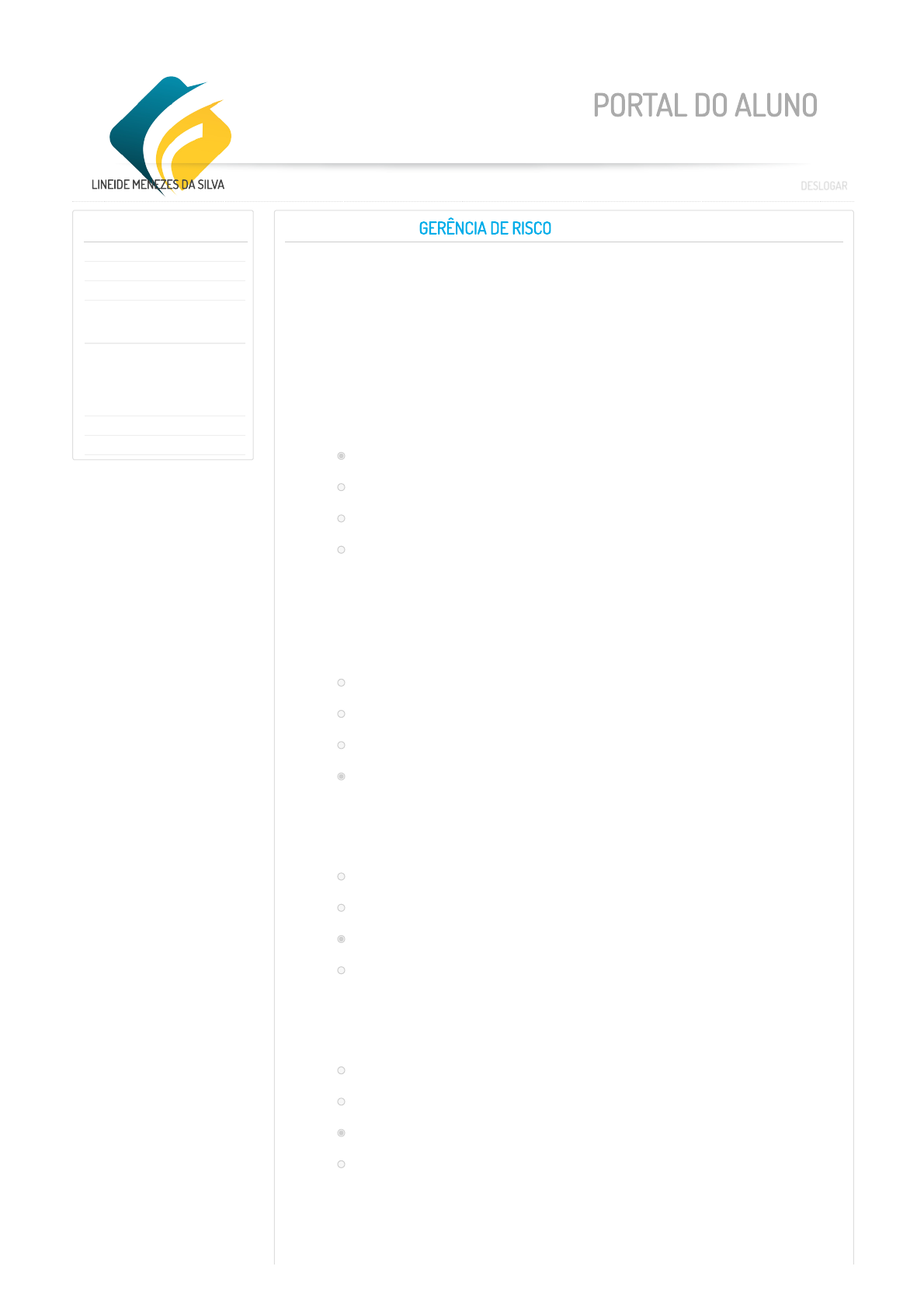 07/09/2021 Facuminas EAD - Portal do Aluno https://www.facuminasead.com.br/portaldoaluno/painel.php?execute=provas/resultado-prova&prova=517&aluno=2792 1/2 PORTAL DO ALUNO Telefone para contato: 31 98683-1779 Olá, LINEIDE MENEZES DA SILVA - Seja Bem vindo (a) ao portal do aluno da Facuminas EAD. DESLOGARDESLOGAR Resultado da Prova: GERÊNCIA DE RISCO Sua pontuação na prova: 40/100 1 - A maioria dos acidentes é devida à falta ou deficiência de algo fundamental na execução das tarefas diárias a segura dos empregados nas áreas de risco é função direta do método de trabalho e quando a segurança falha, os resultado catastróficos, entre eles podemos destacar: As mutilações físicas e/ou mentais; Todas as alternativas estão corretas As perdas materiais; As interrupções brutais do trabalho com toda sorte de prejuízo 2 - É o que ocorre pelo exercício do trabalho a serviço da empresa, com o segurado empregado (inclusive o doméstico), trabalhador avulso, médico residente, bem como com o segurado especial (trabalhador rural), no exercício de suas atividades, provocando lesão corporal ou perturbação funcional que cause a morte, a perda ou redução, temporária permanente da capacidade para o trabalho. Do que se trata a afirmação? Interrupções brutais do trabalho Agravo do trabalho Todas as alternativas estão corretas Acidente do trabalho 3 - Ocorrência com a empresa. Essa característica é de qual tipo de acidente? Acidente material Acidente pessoal Acidente do trabalho Acidente administrativo 4 - A gerência de riscos consiste em: Análise de riscos Avaliação de riscos Identificação de riscos Validação de riscos 5 - Dano máximo provável (dmp); probabilidade de ocorrências do evento gerador do dano (po); nível de exposição ao (classes de prioridades); eficiência das medidas de controle do risco; custo das medidas e controle do risco. Essas características são de: » Inicio » Entre em Contato » Documentos Usuários: » Meus Dados ENGENHARIA DE SEGURANÇA DO TRABALHO: » Aulas » Provas » Financeiro » Menu Principal: https://www.facuminasead.com.br/portaldoaluno/logoff.php https://www.facuminasead.com.br/portaldoaluno/painel.php https://www.facuminasead.com.br/portaldoaluno/painel.php?execute=contato/contato https://www.facuminasead.com.br/portaldoaluno/painel.php?execute=documentos/documentos https://www.facuminasead.com.br/portaldoaluno/painel.php?execute=aluno/editar&editaaluno=2792 https://www.facuminasead.com.br/portaldoaluno/painel.php?execute=aulas/aulas&curso=6 https://www.facuminasead.com.br/portaldoaluno/painel.php?execute=provas/provas&curso=6 https://www.facuminasead.com.br/portaldoaluno/painel.php?execute=financeiro/boletos&curso=6&anoletivo=2020&matricula=11485 07/09/2021 Facuminas EAD - Portal do Aluno https://www.facuminasead.com.br/portaldoaluno/painel.php?execute=provas/resultado-prova&prova=517&aluno=2792 2/2 Avaliação de riscos Identificação de riscos Classificação de riscos Responsabilidades da gerência de riscos 6 - Esforço físico intenso, levantamento manual de peso, exigência de postura inadequada, monotonia e repetitividade, imposição de ritmos excessivos, trabalho em turno diurno e noturno, jornada de trabalho prolongada, situações causadoras de estresse físico e/ou psíquico e controle rígido de produtividade. De qual risco se trata? Riscos ergonômicos Riscos químicos Riscos biológicos Riscos de acidentes 7 - O governo do Paraná elaborou na década de _____ um levantamento das perdas provocadas por normas burocrátic inúteis. 1990 1977 1978 1980 8 - As perdas evitáveis podem ser: De segurança e tecnológicas Visíveis Invisíveis Orçamentária 9 - A decorrente da mobilização de recursos superiores aos necessários para alcançar um resultado. Um exemplo de pe de segurança ocorre nos estoques de segurança. De qual perda se trata? Perdas visíveis Perdas de segurança Perdas invisíveis Todas as alternativas estão incorretas 10 - Fatores de perdas envolvidos em um sistema: Materiais Orçamentário Financeiros Recursos humanos © 2021 - Portal do Aluno - Facuminas EAD - Todos os direitos reservados - Êxodo Digital Marketing© 2021 - Portal do Aluno - Facuminas EAD - Todos os direitos reservados - Êxodo Digital Marketing