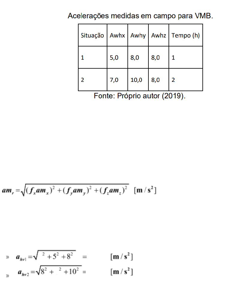 Disciplina: PRR - Higiene do Trabalho - Riscos Físicos no Ambiente de Trabalho Identificação da tarefa: Tarefa 2. Envio de arquivo Pontuação: 10 pontos Tarefa 2 1. Em uma avaliação, foram obtidos os seguintes valores para duas situações de vibração de mão-braço: a. Nessa disposição, deve-se pagar AIns e ACET/FACET? Separam-se em duas situações: a la para as tres direções e a 2a considerando direção predominante. Escolhemos a mais crítica. A avaliação da exposição VMB é baseada na quantidade combinada dos tres eixos. Isto é, o valor total da vibração é definido pela raiz média quadrática dos tres valores componentes, conforme fórmula: Teste da Situação 1 - Avaliação de exposição considerando a resultante ou vetor soma nos três eixos. 8 7 12,37 14,60 Na sequencia, calcula-se a aceleração equivalente (are) para o tempo composto de exposição: Faz-se agora a normalização da aceleração para 8 horas, jornada normal — aceleração equivalente normalizada — A(8) —, uma vez que a exposição foi de 3 horas, segundo a fórmula: Teste Situação 2 G o eixo z possui componentes de aceleração são maiores e, portanto, é o predominante. Assim, a aceleração equivalente é dada: 12,37 14,60 11,04 11,04 6,76 8 , 0 8 , 0 8 , 0 6,53 Faz-se agora a normalização da aceleração para 8 horas, jornada normal — aceleração equivalente normalizada — A(8) —, uma vez que a exposição foi de 3 horas, segundo a fórmula: Interpretação do resultado obtido. Interpretação: Considerando as duas situações, verifica-se que a mais crítica é aquela cuja aren é maior, no caso a do primeiro teste, are = 6,53 m/s² Consultando a NHO lo, quadro abaixo, verificam-se as considerações técnicas e a atuação recomendada em função da aceleração resultante de exposição normalizada (aren) encontrada na condição de exposição avaliada. Constata-se que os valores resultantes (aren = 6,76d m/s') indicam, sem margem de erro ou incerteza, que o meio ambiente do trabalho é altamente insalubre, pois deu acima de 5m/s² motivo pelo qual se deve adotar imediatas medidas corretivas, bem como pagar AIns e recolher FACET. Conclusão quanto ao AIns e ACTE/FACET. Tal avaliação, conforme enunciam o Anexo IV do RPS e a IN 971/2009/RFB, combinado com IN 77/2015 do INSS, ativa fato gerador do FACET na alíquota de 6% devido ao Financiamento da Aposentadoria Especial — FACET, bem como determina pagamento de adicional de insalubridade (2o% sobre o salário mínimo), conforme Anexo 8 da NR15. 6,53 3,99 b. Qual a quantidade de anos de exposição cuja probabilidade de aparecimento da síndrome dos dedos brancos se situe em 10% da população exposta, nos termos da NHO 10 e ANSI 5349? Subsidiariamente se verifica a quantidade de anos de exposição cuja probabilidade de aparecimento da síndrome dos dedos brancos se situe em 10% da população exposta, nos termos da NHO io e ANSI 5349. Para isso deve ser consultar a figura a seguir: Curva, em anos, de aparecimento de dedos brancos para 10% Fonte: ANSI 5349 Na figura acima, a linha cheia se refere à probabilidade para lo° percentil com eixo das ordenadas indicando aparecimento dedos brancos em anos e a aceleração normalizada — aren — na abscissa. Os estudos sugerem que os sintomas das vibrações de mãos e braços são raros em indivíduos expostos a 1m/s' < aren < 2m/s2 e sem registro para aren < 1m/s°. Os valores obtidos da avaliação devem ser plotados no gráfico acima, pelo eixo das abscissas até alcançar a reta dO lo° percentil e rebatidos para o eixo das ordenadas, obtendo-se a estimativa em anos para o aparecimento dos dedos brancos. É possível estimar o tempo - Eme.m anos, para lo da população exposta apresentar aparecimento da síndrome do dedo branco, segundo a fórmula: 6,76 4,70 2. Dado o Quadro sobre critério de julgamento e tomada de decisão: Apresente a explicação e interpretação desse quadro para quando: • FC > 9 Se o fator de crista é maior que 9, fica comprovada a existência destes picos no sinal de vibração e o fator VDVR adquire uma significância ainda maior (ISO, 1997a). Em relação ao VDV, se o fator de crista possuir valor superior a 9, ele nunca deverá superar em qualquer direção o valor de 17 ms-175, a fim de se evitar riscos à saúde. A ACGIH recomenda também que ações de mitigação do agente devem ser empregadas para que o valor fique abaixo de 8,5 ms-17a. A superação de qualquer um destes limites para VCI representa insalubridade, porém o Valor da Dose de Vibração Resultante (VDVR) adquire maior importância quando for constatada a ocorrência de choque ou solavancos significativos durante a exposição do trabalhador avaliado (FUNDACENTRO, 2013a). • FC < 9 Condição aceitável de trabalho , e se aplica somente a manutenção das condições existentes