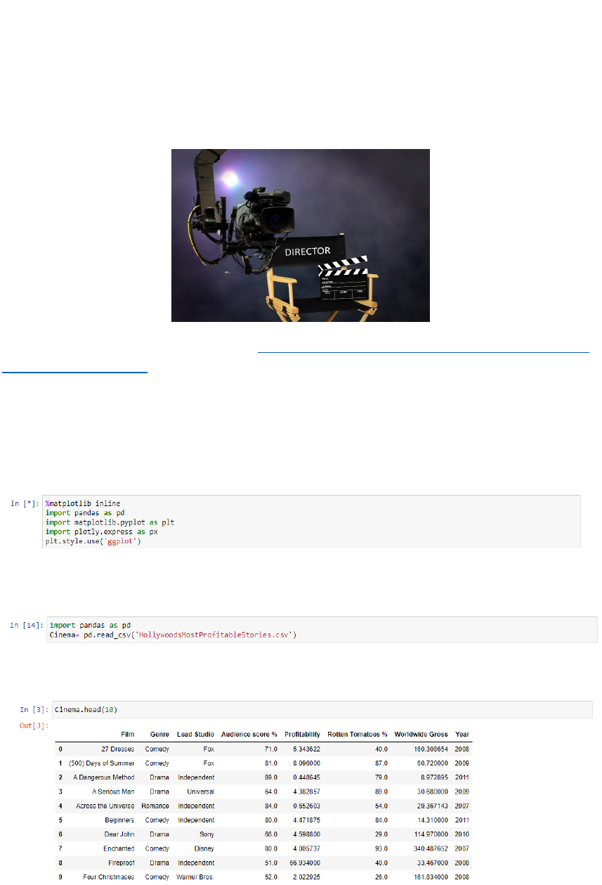 Projeto de visualização da informação Esse é um projeto de Giovanna Polydoro Ferreira de Souza RGM: 23071206 Curso: Ciência da computação EAD Instituição: Universidade Cruzeiro do sul Filmes de Hollywood Os dados foram importados a partir do : https://www.kaggle.com/brendan45774/hollywood- most-profitable-stories e a ideia inicial é trabalhar observando os 10 filmes mais lucrativos no mundo, os anos de lançamento que marcaram a história do cinema e o Top 7 filmes com a pontuação mais alta. 1°Importação Foram necessários o uso destas bibliotecas para a criação desse projeto: A seguir eu fiz a importação do dataset para o meu ambiente de compilação de códigos(jupyter): depois de importar todos os dados do dataset para o ambiente de compilação de códigos (jupyter), abaixo você irá estar visualizando o dataset: https://www.kaggle.com/brendan45774/hollywood-most-profitable-stories https://www.kaggle.com/brendan45774/hollywood-most-profitable-stories Abaixo modifiquei os nomes apresentados na tabela de inglês para português para melhor entedimento: A seguir irei apresentar o tema do dataset que eu escolhi, os temas de cada gráficos e o modelo escolhido: O dataset que eu escolhi foi sobre os filmes de hollywood e os dados que serão apresentados em meus gráficos são dos anos de 2007 a 2012. Tema de cada gráficos e seus modelos: • O primeiro gráfico apresentado será os 10 filmes mais lucrativos no mundo apresentados em um gráfico de barras horizontais. • O segundo gráfico apresentado será os anos de lançamento que marcaram a história do cinema apresentado em um gráfico de linhas. • O terceiro gráfico apresentado são o Top 7 filmes com a pontuação mais alta apresentado em um gráfico treemaps retângulares. Cinema consiste na arte de produzir obras estéticas, narrativas ou não, utilizando a técnica de projetar fotogramas de forma rápida e sucessiva, criando a impressão de movimento. 1° Gráfico de barras horizontais Esses filmes conseguirão ficar marcados na história do cinema por terem uma boa direção e produção. Abaixo irei representar os filmes que marcaram o cinema com um gráfico de barras horizontais estudado na Unidade I- Conceitos iniciais. PLOT 1- Gráfico de barras horizontais. 2° Gráfico de linhas Abaixo irei representar os anos de lançamento dos filmes com um gráfico de linhas estudado na Unidade 2 - Visualização de Informação Temporal. PLOT 2- Gráfico de linhas 3° Gráfico treemaps retângulares Abaixo irei representar os top 7 filmes com maiores pontuação com um gráfico treemaps retângulares estudado na Unidade 4 - Visualização de informação hierárquica. PLOT 3- Gráfico treemaps