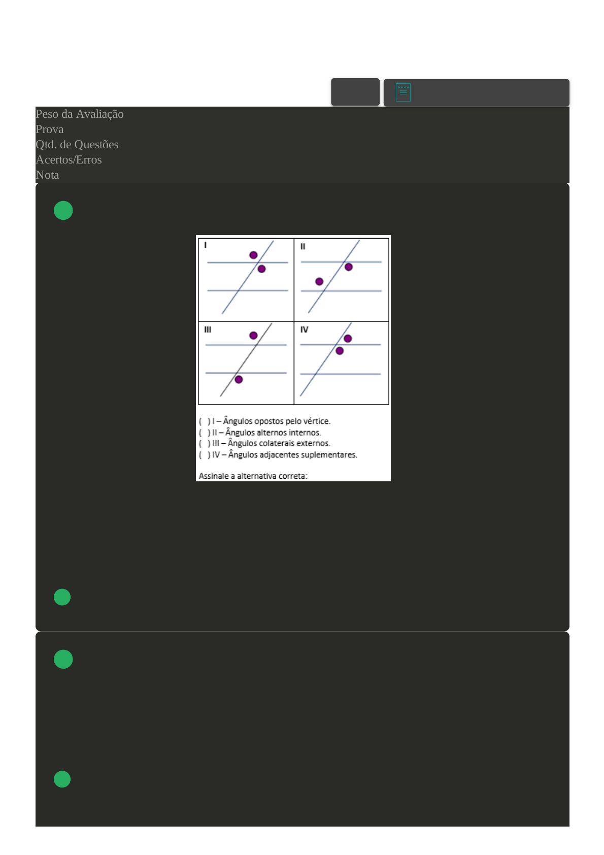 14/05/2022 17:47 Avaliação I - Individual 1/4 Prova Impressa GABARITO | Avaliação I - Individual (Cod.:743113) Peso da Avaliação 1,50 Prova 46609307 Qtd. de Questões 10 Acertos/Erros 10/0 Nota 10,00 Duas retas paralelas, cortadas por uma reta transversal, formam oito ângulos que, dois a dois, recebem nomes especiais. Com base nas representações a seguir, classifique V para as sentenças verdadeiras e F para as falsas: A V - F - V - V. B F - V - V - V. C V - V - V - F. D V - V - F - V. São vários os conceitos sobre ângulos. Um destes diz respeito a ângulos chamados de complementares e suplementares. Com base neste conceito e sua definição, o valor do suplemento menos o complemento de um ângulo é sempre: A 60 graus. B 120 graus. C 90 graus. D 30 graus. VOLTAR A+ Alterar modo de visualização 1 2 14/05/2022 17:47 Avaliação I - Individual 2/4 FORMULÁRIO: GEOMETRIA - 2019 Clique para baixar Com o desenvolvimento dos axiomas, surgem os postulados que, se provados verdadeiros, são considerados teoremas. "Por dois pontos distintos passa apenas uma reta". Este é o primeiro postulado do livro de Euclides, "Os Elementos". Considere os vértices do cubo a seguir. Qual a posição relativa entre a reta que passa pelos vértices E e F, e a reta que passa pelos vértices C e B? A Paralelas. B Reversas. C Concorrentes. D Coincidentes. O grau surge com os babilônios cerca de 4000 a.C. por influência do movimento solar. Naquela época, acreditava-se que, num período de 360 dias, o Sol realizava um movimento completo. Assim, tomaram a circunferência e a dividiram em 360 trechos, ou melhor, 360 graus. Hoje em dia, damos nomes a alguns ângulos que possuem medidas especiais e pares de ângulos que, somados, resultam em uma destas medidas especiais como complementares. A medida de um ângulo é igual ao quádruplo da medida do seu complemento. Qual é a medida desse ângulo? A Esse ângulo mede 72º. B Esse ângulo mede 36º. C Esse ângulo mede 120º. D Esse ângulo mede 60º. Na matemática existem os axiomas, que são verdades que não necessitam ser provadas. Com relação aos axiomas, temos os que dizem respeito às retas e idealizam a classificação de segmentos de retas. A ilustração a seguir apresenta um prisma trapezoidal com vários segmentos de retas. Assinale a 3 4 5 14/05/2022 17:47 Avaliação I - Individual 3/4 alternativa CORRETA que apresenta somente segmentos que são reversos ou consecutivos ao segmento AB: A CD, EH, AD e DE. B DE, AD, BG e CD. C BG, EF, AD e CH. D AF, CH, BC e FG. Graus, Radiano e Grados são unidades angulares que possivelmente você já ouviu falar. No caso dos dois primeiros, estes aparecem com mais frequência em problemas matemáticos. No caso isolado do grau, este apresenta como submúltiplos os minutos e os segundos. Especificamente sobre este conceito, assinale a alternativa CORRETA que apresenta um valor correspondente a 180°, em graus, minutos e segundos: A 178 graus, 59 minutos e 60 segundos. B 178 graus, 60 minutos e 60 segundos. C 179 graus, 60 minutos e 59 segundos. D 179 graus, 59 minutos e 60 segundos. Quando falamos de ângulos, podemos utilizar como exemplo a sala em que estamos, uma caixa, uma régua, como diversos outros sólidos não regulares, e classificar cada canto como um ângulo, desde que seja formado por dois segmentos de reta (a linha do rodapé com a linha da parede). Assim, com relação à classificação dos ângulos, podemos afirmar que: I- Dois ângulos opostos pelo vértice são adjacentes. II- Dois ângulos adjacentes são consecutivos. III- Dois ângulos consecutivos são adjacentes. Agora, assinale a alternativa CORRETA: A Somente a sentença III está correta. B As sentenças I e II estão corretas. C Somente a sentença II está correta. D Somente a sentença I está correta. 6 7 14/05/2022 17:47 Avaliação I - Individual 4/4 O livro "Os Elementos", de Euclides de Alexandria, apresenta-se em 13 volumes, definições, postulados, noções comuns de axiomas e demonstram-se 465 proposições. Algumas definições do livro: - Ponto é o que não tem partes, ou o que não tem grandeza alguma. - Linha é o que tem comprimento sem largura. - As extremidades da linha são pontos. Classifique V para as sentenças verdadeiras e F para as falsas: ( ) Três pontos não colineares determinam um plano. ( ) Duas retas paralelas possuem apenas um ponto em comum. ( ) Dois pontos distintos determinam uma reta. ( ) Em três pontos distintos temos pelo menos duas retas. Agora, assinale a alternativa que apresenta a sequência CORRETA: A F - V - F - V. B V - F - V - F. C V - F - F - F. D F - V - V - V. O conhecimento de que uma volta completa corresponde a 360° está relacionada à astronomia. Os babilônios utilizaram os dias de rotação da Terra ao redor do Sol (um ano - 365 dias) para inventar um sistema de medida para ângulos: o grau. Se a medida de um ângulo é igual à terça parte da medida do seu complemento, qual é a medida desse ângulo? A Esse ângulo mede 22,5º. B Esse ângulo mede 45º. C Esse ângulo mede 36,5º. D Esse ângulo mede 30º. Supondo um espaço tridimensional, considere que há duas retas r e s distintas e um plano beta, que não contém as duas retas. Sobre o exposto, assinale a alternativa CORRETA: A Se r e s são paralelas ao plano beta, então r e s são paralelas. B Se r intercepta o plano beta e s é paralelo a r, então s também intercepta o plano beta. C Se r e s não se interceptam, então r e s devem ser paralelas. D Se r e s são concorrentes ao plano beta, então r e s devem ser paralelas. 8 9 10 Imprimir