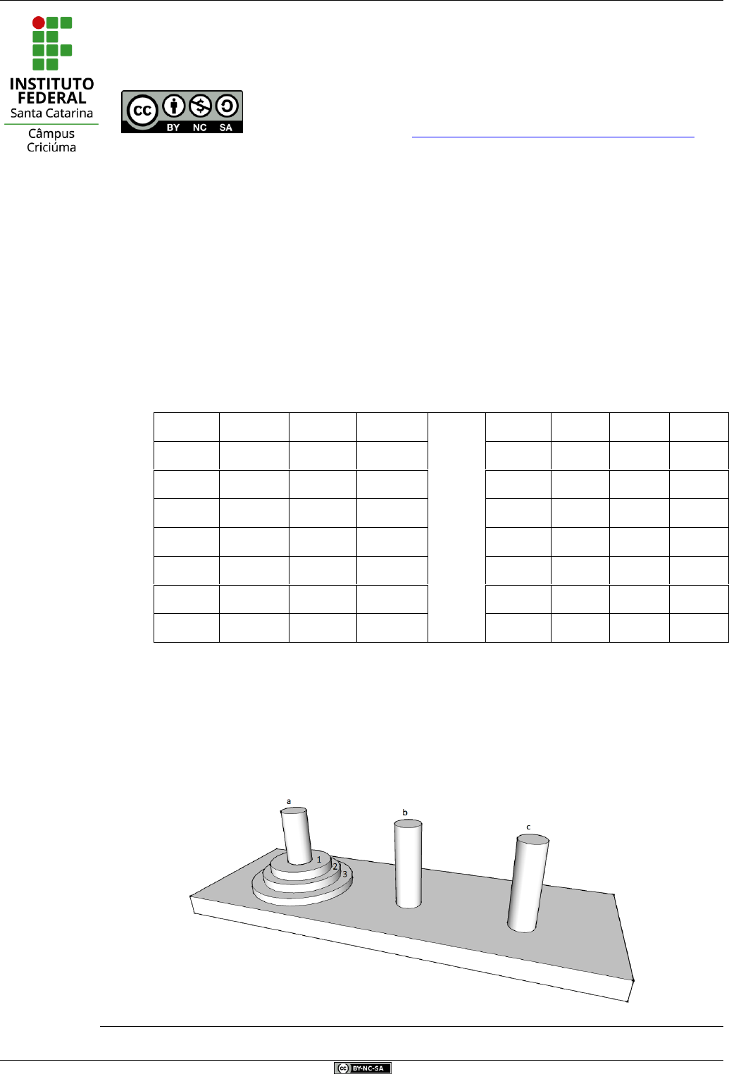 Instituto Federal de Santa Catarina – Campus Criciúma Programação / Lógica de Programação Iuri Sônego Cardoso 1 INSTITUTO FEDERAL DE SANTA CATARINA – CAMPUS CRICIÚMA PROGRAMAÇÃO / LÓGICA DE PROGRAMAÇÃO Professor: Iuri Sônego Cardoso – iuri.cardoso@ifsc.edu.br Este trabalho está licenciado sob a Licença Atribuição-NãoComercial- CompartilhaIgual 4.0 Internacional Creative Commons. Para visualizar uma cópia desta licença, visite http://creativecommons.org/licenses/by-nc-sa/4.0/ ou mande uma carta para Creative Commons, PO Box 1866, Mountain View, CA 94042, USA. EXERCÍCIOS: INTRODUÇÃO À LÓGICA E A ALGORITMOS Exemplo A. Um homem precisa atravessar um rio com um barco que possui capacidade apenas para carregar ele mesmo e mais uma de suas três cargas, que são: um lobo, uma ovelha e uma couve. Por medida de segurança, o homem, ao atravessar o rio, não pode deixar para trás o lobo juntamente com a ovelha, ou a ovelha juntamente com a couve, pois isto colocaria sempre em risco a segunda carga de cada par mencionado. O que o homem deve fazer para conseguir atravessar o rio sem perder suas cargas? Solução: 0 Lobo Ovelha Couve Homem Rio 1 Lobo Couve Homem Ovelha 2 Lobo Couve Homem Ovelha 3 Lobo Homem Ovelha Couve 4 Lobo Ovelha Homem Couve 5 Ovelha Homem Lobo Couve 6 Ovelha Homem Lobo Couve 7 Homem Lobo Ovelha Couve Exercício 1. Resolva o problema de uma Torre de Hanói, que consiste em três hastes (a - b - c), uma das quais serve de suporte para três discos de tamanhos diferentes (l - 2 - 3), os menores sobre os maiores. Pode-se mover um disco de cada vez para qualquer haste, contanto que nunca seja colocado um disco maior sobre um menor. O objetivo é transferir os três discos para outra haste. Adaptação de exercício proposto por Forbellone e Eberspächer (2005). http://creativecommons.org/licenses/by-nc-sa/4.0/ Instituto Federal de Santa Catarina – Campus Criciúma Programação / Lógica de Programação Iuri Sônego Cardoso 2 Exemplo B. Elabore um algoritmo que descreva a solução do problema apresentado no Exemplo A. Solução: Algoritmo “O bode, a ovelha e a couve” 1. Transpor a ovelha; 2. Retornar sozinho; 3. Transpor a couve; 4. Retornar com a ovelha; 5. Transpor o lobo; 6. Retornar sozinho; 7. Transpor a ovelha. Exercício 2. Elabore um algoritmo que descreva a solução do problema apresentado no Exercício 1. Observe que é necessário ter encontrado a solução para que você possa descrevê-la. Exercício 3. João tem três barris. No barril A, que está vazio, cabem 8 litros. No barril B, que está cheio, 5 litros. No barril C, que também está cheio, 3 litros. Escreva um algoritmo que manipule o conteúdo destes barris, fazendo com que os barris A e B fiquem com 4 litros cada e o C fique vazio. Os próprios barris deverão ser utilizados para medir o volume de água que está sendo manipulado. OBS: não esqueça que antes de escrever o algoritmo, é necessário resolver o problema. Adaptação de exercício proposto por Forbellone e Eberspächer (2005). Exercício 4. Três jesuítas e três canibais precisam atravessar um rio; para tal, dispõem de um barco com capacidade para duas pessoas. Por medida de segurança, não se deve permitir que em alguma margem a quantidade de jesuítas seja inferior à de canibais. Qual a solução para efetuar a travessia com segurança? Elabore um algoritmo mostrando a resposta, indicando as ações que concretizam a solução deste problema. Adaptação de exercício proposto por Forbellone e Eberspächer (2005). Exercício 5. Com base no Exercício 1, amplie a solução apresentada de maneira a completar a operação descrita, de troca dos discos da torre A para a torre B, considerando a existência de 4 discos. Adaptação de exercício proposto por Forbellone e Eberspächer (2005). Referências Bibliográficas FORBELLONE, A. L. V.; Eberspacher, H. F. Lógica de Programação – A Construção de Algoritmos e Estruturas de Dados. São Paulo: Makron Books, 2005.