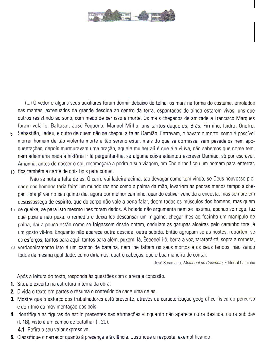 ESCOLA SECUNDÁRIA C/ 3º CICLO DO ENSINO BÁSICO DE LOUSADA Prova Escrita de Português 12º Ano GRUPO I GRUPO II “Com a morte de Sete-Sóis fecham-se as páginas desta outra face da História povoada de gente oprimida (…) fecha- se também, um ciclo de sonhos quiméricos* (…), mas logo um outro é deixado em aberto.” Ana Paula Arnaut, Memorial do Convento, história, ficção e ideologia, Fora do Texto Escreva uma dissertação desenvolvendo o texto transcrito, de 100 a 150 palavras, onde fundamente as afirmações com exemplos concretos à obra Memorial do Convento. *quiméricos – que não existem na realidade concreta. ESCOLA SECUNDÁRIA C/ 3º CICLO DO ENSINO BÁSICO DE LOUSADA Sugestão de resolução da Prova Escrita de Português 12º Ano GRUPO I GRUPO II