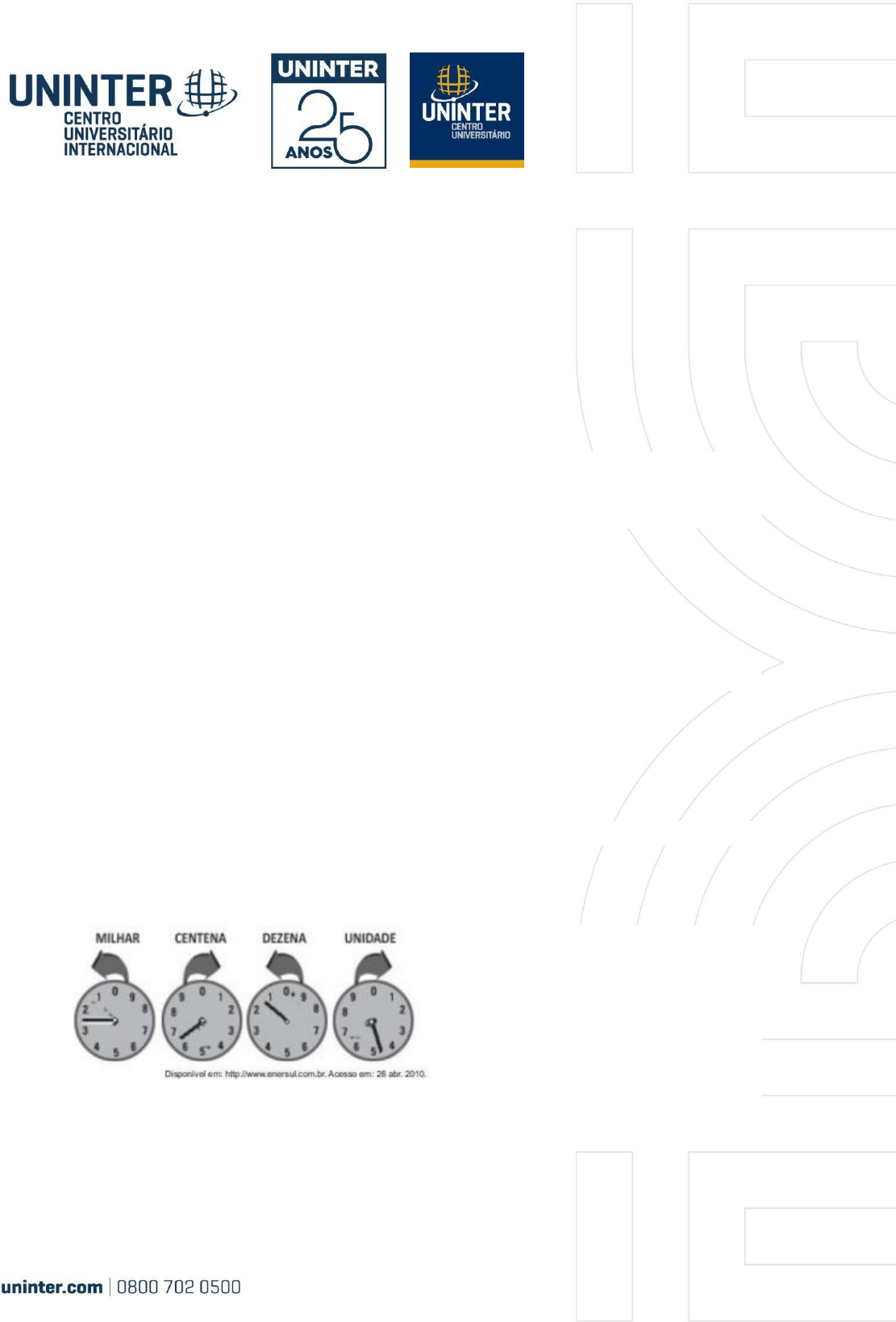 e) 5 A) x + y + 2 Matemática básica Exercícios complementares sobre Sistemas de Numeração 1. (Ipad) Dentre os números 2.501, 4.235, 1.536, 4.057, 30.597 e 41.500, quantos têm o algarismo 5 ocupando a ordem das centenas? a) 1 b) 2 c) 3 d) 4 2. (FCC – SP) Um número tem dois algarismos, sendo y o algarismo das unidades e x o algarismo das dezenas. Se colocarmos o algarismo 2 à direita desse número, o novo número será: Número: xy Novo número: xy2 B) 200 + 10·y + x C) 100·x + 10·y + 2 D) 100·y + 10·x + 2 3. (ENEM) O medidor de energia elétrica de uma residência, conhecido por “relógio de luz”, é constituído de quatro pequenos relógios, cujos sentidos de rotação estão indicados conforme a figura: A medida é expressa em kWh. O número obtido na leitura é composto por 4 algarismos. Cada posição do número é formada pelo último algarismo ultrapassado pelo ponteiro. O número obtido pela leitura em kWh, na imagem, é a) 2 614. b) 3 624. c) 2 715. d) 3 725. e) 4 162. 4. (ENEM) Os hidrômetros são marcadores de consumo de água em residências e estabelecimentos comerciais. Existem vários modelos de mostradores de hidrômetros, sendo que alguns deles possuem uma combinação de um mostrador e dois relógios de ponteiro. O número formado pelos quatro primeiros algarismos do mostrador fornece o consumo em m3, e os dois últimos algarismos representam, respectivamente, as centenas e dezenas de litros de água consumidos. Um dos relógios de ponteiros indica a quantidade em litros, e o outro em décimos de litros, conforme na figura a seguir. Considerando as informações indicadas na figura, o consumo total de água registrado nesse hidrômetro, em litros, é igual a a) 3 534,85. b) 3 544,20. c) 3 534 850,00. d) 3 534 859,35. e) 3 534 850,39. 5. (UFPE) Considere um número com três dígitos, abc, representado no sistema de numeração decimal e com a > c e c ≠ 0. Faça a diferença entre abc e o número obtido de abc permutando os dígitos a e c. Em seguida, permute o dígito das unidades com o das e) 101 2013 novos radares que permitem o cálculo da velocidade média desenvolvida por um veículo em um trecho da via. centenas da diferença e adicione o valor encontrado à diferença. Qual o valor da soma? a) 1089 b) 1098 c) 1890 d) 1809 e) 1980 6. (UFPE) Qualquer número de 4 dígitos, em que os dígitos das unidades é igual ao das centenas, e o dígito das dezenas é igual ao dos milhares, é divisível por: a) 83 b) 87 c) 89 d) 97 7. (Enem 2014) A Companhia de Engenharia de Tráfego (CET) de São Paulo testou em As medições de velocidade deixariam de ocorrer de maneira instantânea, ao se passar pelo radar, e seriam feitas a partir da velocidade média no trecho, considerando o tempo gasto no percurso entre um radar e outro. Sabe-se que a velocidade média é calculada como sendo a razão entre a distância percorrida e o tempo gasto para percorrê-la. O teste realizado mostrou que o tempo que permite uma condução segura de deslocamento no percurso entre os dois radares deveria ser de, no mínimo, 1 minuto e 24 segundos. Com isso, a CET precisa instalar uma placa antes do primeiro radar informando a velocidade média máxima permitida nesse trecho da via. O valor a ser exibido na placa deve ser o maior possível, entre os que atendem às condições de condução segura observadas. Disponível em: www1.folha.uol.com.br. Acesso em: 11 jan. 2014 (adaptado). A placa de sinalização que informa a velocidade que atende a essas condições é 8. (CP2 2016) Uma das histórias contadas sobre o Xadrez é que o jogo foi criado por um camponês, a pedido do rei de sua região, que gostaria de ter um passatempo. O rei, muito contente com a criação do jogo, perguntou ao camponês o que ele gostaria de receber como prêmio, quando ouviu a seguinte resposta: – Majestade, o tabuleiro do xadrez é composto por 64 casas. Eu gostaria de receber 1 grão de milho pela 1ª casa do tabuleiro, e cada casa seguinte, o dobro do número de grãos recebido pela casa anterior, até o final. Resumindo, o pedido do camponês foi onde o número em cada casa do tabuleiro representa a quantidade de grãos recebidos por esta casa. Ao final, o rei constatou que milho. seria impossível atendê-lo, pois seriam necessários aproximadamente 18 x 1018 grãos de Sabendo que grão de milho pesa aproximadamente 4 x 10-4 kg, o peso total do pedido do camponês, em toneladas, seria a) 72 x 105 b) 72 x 1010 c) 72 x 1011 d) 72 x 1017 Respostas: 1) c; 2) c; 3) a; 4) d; 5) a; 6) e; 7) c; 8) c;