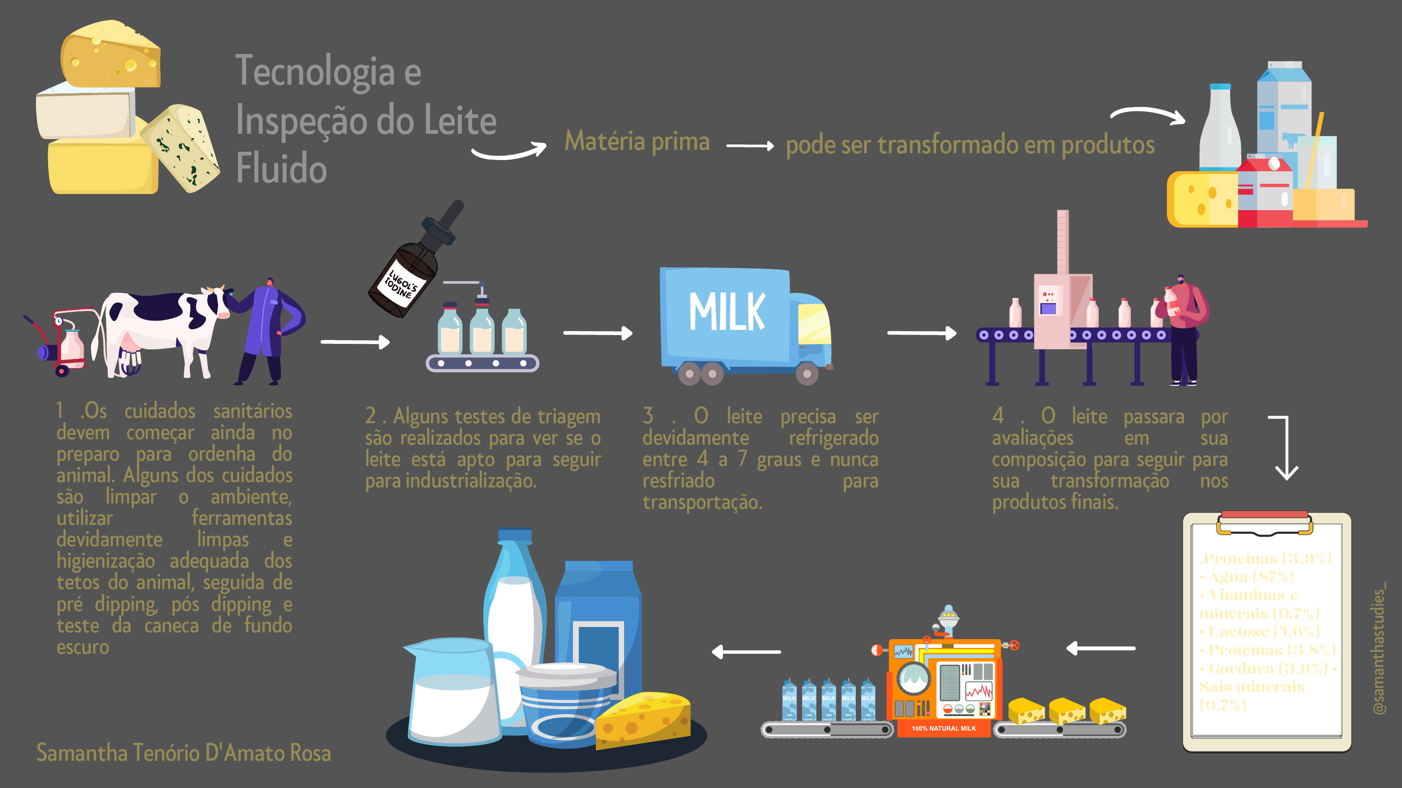 Tecnologia eTecnologia e Inspeção do Inspeção do LeiteLeite FluidoFluido Matéria primaMatéria prima pode ser transformado em pode ser transformado em produtosprodutos 1 .Os cuidados sanitários1 .Os cuidados sanitários devem começar ainda nodevem começar ainda no preparo para ordenha dopreparo para ordenha do animal. Alguns dos cuidadosanimal. Alguns dos cuidados são limpar o ambiente,são limpar o ambiente, utilizar ferramentasutilizar ferramentas devidamente limpas edevidamente limpas e higienização adequada doshigienização adequada dos tetos do animal, seguida detetos do animal, seguida de pré dipping, pós dipping epré dipping, pós dipping e teste da caneca de fundoteste da caneca de fundo escuroescuro 2 . Alguns testes de triagem2 . Alguns testes de triagem são realizados para ver se osão realizados para ver se o leite está apto para seguirleite está apto para seguir para industrialização.para industrialização. 3 . O leite precisa ser3 . O leite precisa ser devidamente refrigeradodevidamente refrigerado entre 4 a 7 graus e nuncaentre 4 a 7 graus e nunca resfriado pararesfriado para transportação.transportação. 4 . O leite passara por4 . O leite passara por avaliações em suaavaliações em sua composição para seguir paracomposição para seguir para sua transformação nossua transformação nos produtos finais.produtos finais. Samantha Tenório D'Amato RosaSamantha Tenório D'Amato Rosa .Proteínas (3,9%).Proteínas (3,9%) • Água (87%)• Água (87%) • Vitaminas e• Vitaminas e minerais (0,7%)minerais (0,7%) • Lactose (4,6%)• Lactose (4,6%) • Proteínas (3,8%)• Proteínas (3,8%) • Gordura (3,6%) •• Gordura (3,6%) • Sais mineraisSais minerais (0,7%)(0,7%) @s am an th as tu die s_ @s am an th as tu die s_