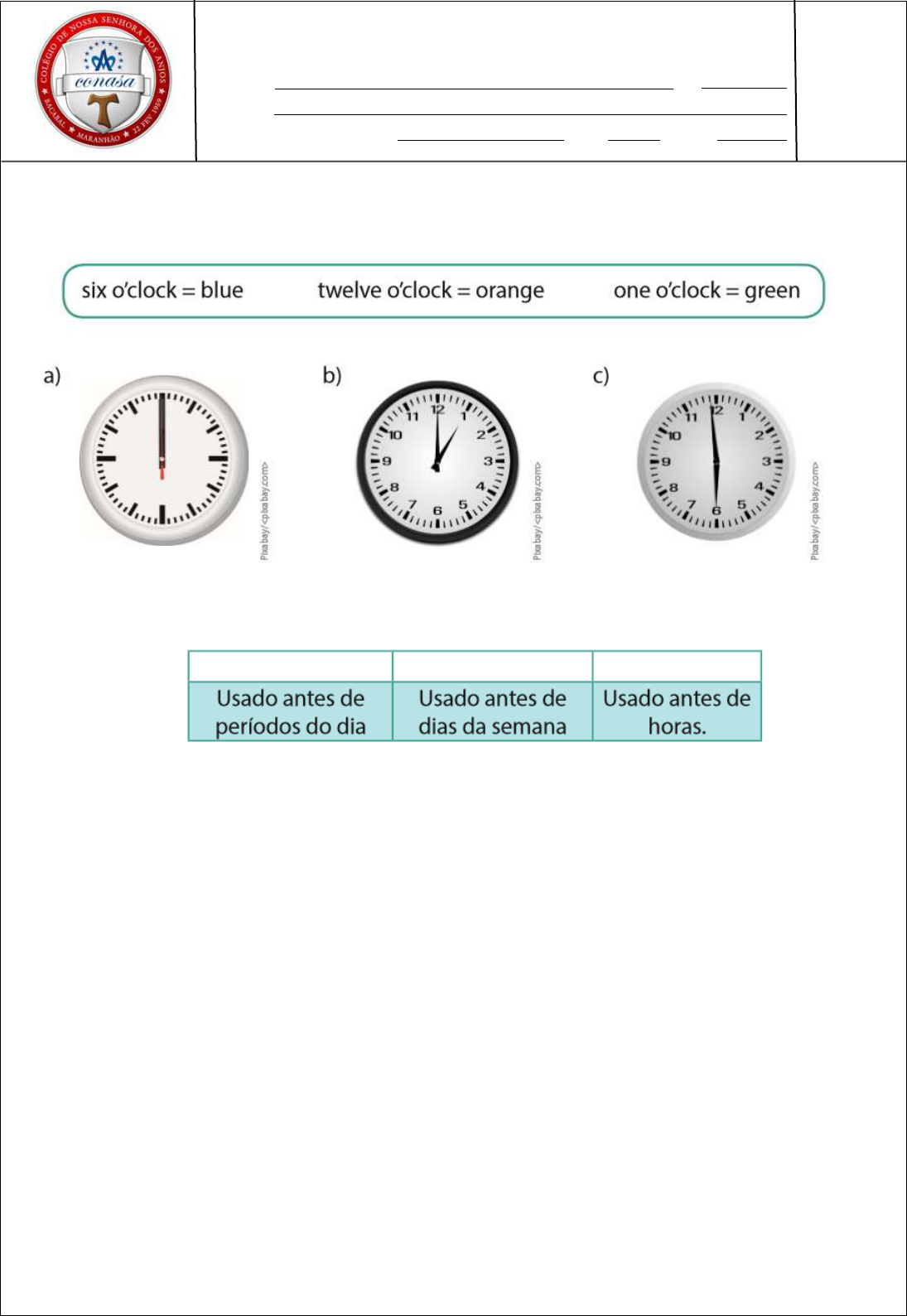 COLÉGIO DE NOSSA SENHORA DOS ANJOS Bacabal-MA, ____ de ____________________ de 2022 Nome: Nº Prof.: Área de Conhecimento: Sala: 6ª ano Turma: ATIVIDADE AVALIATIVA DE LÍNGUA INGLESA 1 - Pinte a hora indicada com a cor correspondente: 2 - Complete o quadro usando on, in ou at. 3 - Utilize o quadro do exercício 2 para completar as frases: a) They have English classes ___ Tuesdays. b) We always go to school ____ the morning. c) The movie is ___ 8 o’clock. d) He plays basketball ___ Fridays ___ 7 pm. 4 –Escreva o masculino das palavras: a) Mom: __________________ b) Sister: ____________________ c) Grandmother: ______________ LÍNGUA INGLESA PATRÍCIA SOUZA NOTA: d) Wife: ______________________ 5 – Complete a cruzadinha com os meses do ano. 6 - A partir do relógio, complete a lacuna abaixo, escrevendo o horário por extenso, e usando corretamente as preposições correspondentes: Pedro is a student. He has Science classes ______________________________________. 7 - Assinale a alternativa que contenha a frase com a preposição correta. A) I go to school on the afternoon. B) Our classes finish at 5:30. C) We have English classes in Fridays. D) He has soccer practice at Tuesdays. E) They study on the morning. 8 - Na imagem, temos um casal. Qual adjetivo não pode ser usado para descrever os dois? A) old B) thin C) clean D) happy E) young COLÉGIO DE NOSSA SENHORA DOS ANJOS Bacabal-MA, ____ de ____________________ de 2022 Nome: Nº Prof.: Área de Conhecimento: Sala: 7ª ano Turma: ATIVIDADE AVALIATIVA DE LÍNGUA INGLESA 1 - Antes de sair de viagem, Anderson resolveu deixar anotações para sua mãe sobre como está sua casa. Ela irá cuidar da casa de seu filho, enquanto ele está fora. Como os dois estão estudando inglês, ele resolveu escrever assim o recado: Hello mom! I left the dog food in the kitchen and cleaned the whole house, so you don’t have to worry about that. I writed down several phone numbers for you to order food. I told the neighbors about you too. They saw you and recognized you. Qual dos verbos está escrito de forma incorreta em sua forma verbal do simple past? A) leave B) clean C) write D) tell E) see 2 - Escreva frases no passado utilizando as dicas: a) (You / play / soccer / last night) ____________________________________ b) (She / clean / her bedroom / last week) _____________________________ c) (They / visit / their friends / last vacation) ____________________________ d) (I / travel to Peru / a year ago) _____________________________________ 3- Use a forma correta do Simple Past dos verbos entre parênteses. I) We ____________ (be) very lucky with the weather. II) It _____________ (not/rain) a lot. III) But we _____________ (see) some beautiful rainbows last holiday. IV) Where _____________ (spend/you) your last holiday? A) I) was / II) not rained / III) seen / IV) you spended B) I) were / II) didn’t rained / III) saw / IV) did you spended C) I) were / II) wasn’t rain / III) sawed / IV) were you spend D) I) were / II) didn’t rain / III) saw / IV) did you spend E) I) was / II) didn’t rain / III) seed / IV) did you spent INGLÊS PATRÍCIA SOUZA NOTA: 4 - Complete com o passado dos verbos. a) break ___________ b) come ___________ c) drink ____________ d) eat ______________ e) go ______________ f) have ____________ 5 - Coloque as frases abaixo no passado: a) I know this girl. ___________________________________ b) I write letters to my grandma. _______________________ 6 - Read the following article. Roberto Gómez Bolaños, a Mexican comic actor, writer and director familiar around the world for his characters El Chavo and El Chapulín Colorado, died on Friday in Cancún. He was 85. His death was announced by the Mexican television network Televisa, which did not specify the cause. Mr. Bolaños, known by his nickname, Chespirito (chess-pee-REE-toh), was on Mexican television for more than 40 years, and millions of children across the Spanish-speaking world and beyond came of age watching his shows in syndication. […] According to the article, we can say that Roberto Gómez Bolaños made history because: a) he lived for 85 years. b) he played a famous character on TV. c) he was a famous American actor. d) his nickname, Chespirito, was funny. 7 - Read the following comic strip When you write about when you were a child you report what a) never happened. b) happens nowadays. c) happened last night. d) happened years ago. 8 - John se divertiu bastante no final de semana passado; nesse, ele está realmente cansado. O que John estava fazendo no final de semana passado? a) He was dancing. b) He was sleeping. c) He was working hard. d) He was driving. e) He was playing golf. COLÉGIO DE NOSSA SENHORA DOS ANJOS Bacabal-MA, ____ de ____________________ de 2022 Nome: Nº Prof.: Área de Conhecimento: Sala: 8ª ano Turma: ATIVIDADE AVALIATIVA DE LÍNGUA INGLESA 1 - Complete o quadro com os pronomes indefinidos some, any e no: 2 - Utilize a tabela do exercício 1 para completar as frases abaixo: a) There are _______ tomatoes in the kitchen. b) There aren’t ________ potatoes in the fridge. c) There is _____ chocolate! We need to buy more! d) Do you want ______ cake? 3 - Complete o quadro com much, many e a lot of: 4 - Circule a alternativa correta de acordo com a tabela do exercício 3: a) There aren’t much/many grapes at home. b) There is much/a lot of sugar in this coffee. c) They don’t have many/much friends. d) We don’t need much/many flour for the cake, 100 grams is enough. 5 - Complete o quadro com how much e how many: INGLÊS PATRÍCIA SOUZA NOTA: 6 - Complete o diálogo com os quantificadores corretos: Danny: Can you bring soda to the picnic? I don’t have _____________. Harry: Yeah, I think I’ve got _____________ leftovers from the party. A) any / any B) any / some C) some / any D) much / any E) some / some 7 - 8 - Para se referir aos animais que cercam a garota na imagem acima, qual expressão de quantidade seria adequada em uma afirmaçã