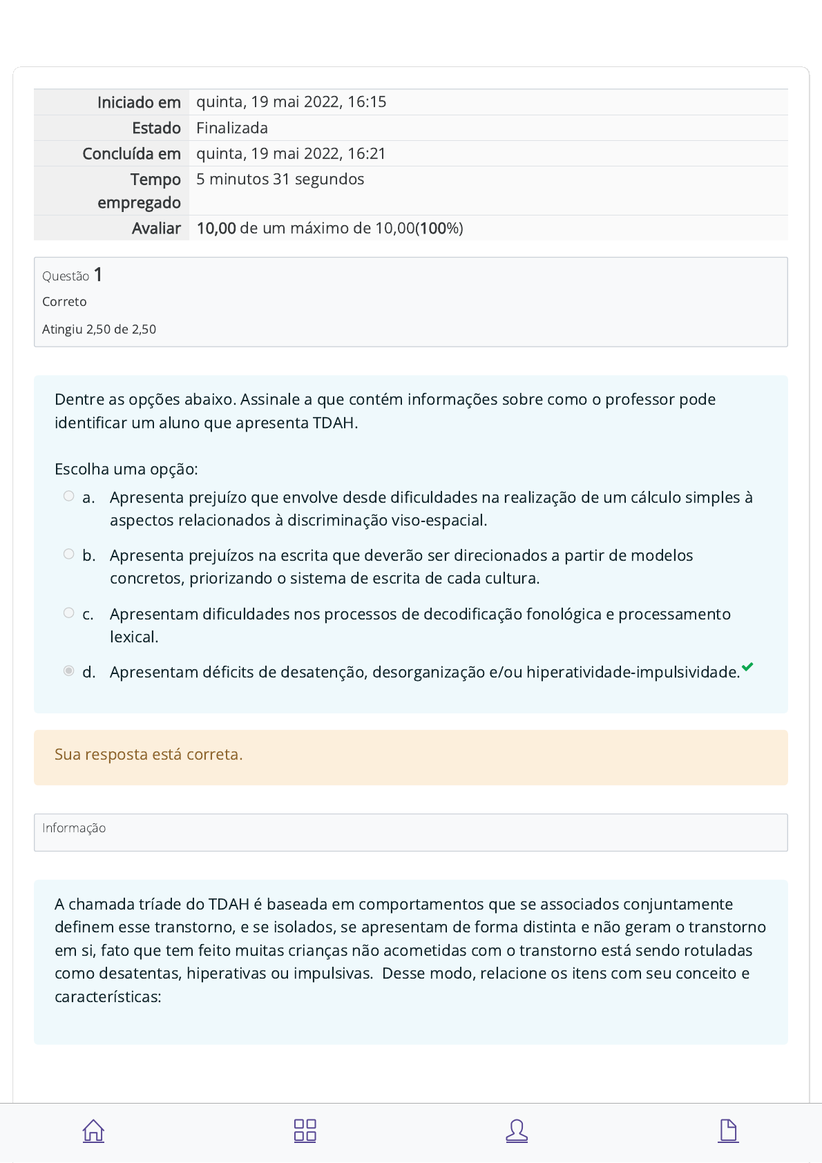 Iniciado em quinta, 19 mai 2022, 16:15 Estado Finalizada Concluída em quinta, 19 mai 2022, 16:21 Tempo empregado 5 minutos 31 segundos Avaliar 10,00 de um máximo de 10,00(100%) Questão 1 Correto Atingiu 2,50 de 2,50 Informação Dentre as opções abaixo. Assinale a que contém informações sobre como o professor pode identi�car um aluno que apresenta TDAH. Escolha uma opção: a. Apresenta prejuízo que envolve desde di�culdades na realização de um cálculo simples à aspectos relacionados à discriminação viso-espacial. b. Apresenta prejuízos na escrita que deverão ser direcionados a partir de modelos concretos, priorizando o sistema de escrita de cada cultura. c. Apresentam di�culdades nos processos de decodi�cação fonológica e processamento lexical. d. Apresentam dé�cits de desatenção, desorganização e/ou hiperatividade-impulsividade. Sua resposta está correta. A chamada tríade do TDAH é baseada em comportamentos que se associados conjuntamente de�nem esse transtorno, e se isolados, se apresentam de forma distinta e não geram o transtorno em si, fato que tem feito muitas crianças não acometidas com o transtorno está sendo rotuladas como desatentas, hiperativas ou impulsivas. Desse modo, relacione os itens com seu conceito e características: https://eskadauema.com/my https://eskadauema.com/index.php?redirect=0 https://eskadauema.com/user/edit.php?id= https://eskadauema.com/theme/olm/certificates.php Questão 2 Correto Atingiu 2,50 de 2,50 Questão 3 Correto Atingiu 2,50 de 2,50 Segundo o DSM-5 (2014, p.61), caracteriza-se como um comportamento de "divagação em tarefas, falta de persistência, di�culdade de manter o foco e desorganização - e não constitui consequência de desa�o ou falta de compreensão”. Escolha uma opção: a. Desatenção b. Hiperatividade c. Impulsividade Sua resposta está correta. São "ações precipitadas que ocorrem no momento sem premeditação e com elevado potencial para dano à pessoa”, que podem "ser re�exos de um desejo de recompensas imediatas ou de incapacidade de postergar a grati�cação” (DSM-5, 2014, p.61). Escolha uma opção: a. Desatenção b. Hiperatividade c. Impulsividade Sua resposta está correta. https://eskadauema.com/my https://eskadauema.com/index.php?redirect=0 https://eskadauema.com/user/edit.php?id= https://eskadauema.com/theme/olm/certificates.php Questão 4 Correto Atingiu 2,50 de 2,50 Termos de uso Política de privacidade "Se há atividade motora excessiva (como uma criança que corre por tudo) quando não apropriado ou remexer, batucar ou conversar em excesso” (DSM-5, 2014, p.61). Escolha uma opção: a. Desatenção b. Hiperatividade c. Impulsividade Sua resposta está correta. https://eskadauema.com/admin/tool/policy/view.php?policyid=1&versionid=3 https://eskadauema.com/admin/tool/policy/view.php?policyid=2&versionid=2 https://eskadauema.com/my https://eskadauema.com/index.php?redirect=0 https://eskadauema.com/user/edit.php?id= https://eskadauema.com/theme/olm/certificates.php