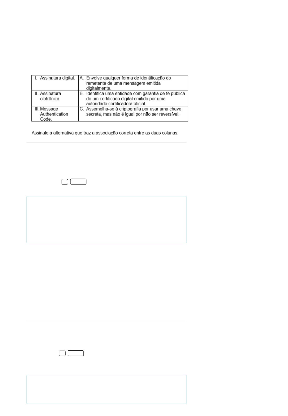 Função de criptografia HASH Professor(a): Marcelo Ferreira Zochio (Mestrado acadêmico) 1) 2) Prepare-se! Chegou a hora de você testar o conhecimento adquirido nesta disciplina. A Avaliação Virtual (AV) é composta por questões objetivas e corresponde a 100% da média final. Você tem até cinco tentativas para “Enviar” as questões, que são automaticamente corrigidas. Você pode responder as questões consultando o material de estudos, mas lembre-se de cumprir o prazo estabelecido. Boa prova! Leia e associe as duas colunas: Alternativas: I – C; II – B; III – A. I – C; II – A; III – B. I – A; II – C; III – B. I – B; II – A; III – C. CORRETO I – A; II – B; III – C. Código da questão: 57785 Sobre a assinatura digital, considere as seguintes afirmações e classifique-as em verdadeiras (V) ou falsas (F): ( ) Garante confidencialidade do documento assinado. ( ) Garante integridade do documento assinado. ( ) Garante a impossibilidade de repúdio do documento assinado. ( ) É realizada cifrando o documento com a chave pública. ( ) É conhecida também como assinatura eletrônica. Assinale a alternativa que contenha a sequência correta: Alternativas: V – F – F – V – F. F – V – F – V – F. F – V – V – F – F. CORRETO V – V – F – V – F. V – F – F – V – V. Código da questão: 57782 Resolução comentada: assinatura digital tem fé pública, pois é feita com um certificado digital emitido por uma autoridade certificadora oficial. Assinatura eletrônica apenas identifica de alguma forma o remetente de alguma mensagem, sem envolver assinatura digital. O Message Authentication Code usa uma chave secreta para gerar blocos de tamanho fixo usados para verificação de integridade. Resolução comentada: assinatura digital garante integridade do documento e a impossibilidade de repúdio dele. 3) 4) 5) Certificados digitais são classificados também quanto ao seu tempo de uso e hardware usado para ser instalado. Entre os modelos existentes, há o A1. Esse modelo de certificado caracteriza-se por: Alternativas: Possuir a validade de um ano. CORRETO Possuir validade infinita. Possuir a validade de um mês. Ser instalado em um token ou cartão. Possuir apenas uma chave, a pública. Código da questão: 57791 Se você quiser manter uma comunicação sigilosa com alguém, seguindo o princípio da confidencialidade, você deve usar criptografia. Sobre ela, classifique as afirmativas em verdadeiras (V) ou falsas (F): ( ) Criptografia assimétrica é mais segura que criptografia simétrica porque usa duas chaves, uma pública e outra privada. ( ) Para garantir sigilo nas comunicações usando criptografia assimétrica, você deve cifrar suas mensagens usando sua chave privada, pois ela garante privacidade. ( ) Para garantir sigilo nas comunicações usando criptografia assimétrica, você deve cifrar suas mensagens usando a chave pública do destinatário. ( ) Criptografia simétrica tem sua segurança garantida no tamanho da chave usada na cifra. ( ) RSA e AES são algoritmos de criptografia simétrica. Assinale a alternativa que contenha a sequência correta: Alternativas: V – F – V – F – F. F – V – F – V – F. F – F – V – V – F. CORRETO V – V – F – V – F. F – V – F – F – F. Código da questão: 57737 O sistema de criptografia ElGamal se baseia em______ para manter sua ________. Alternativas: Mangaritmos indiscretos; estabilidade. Logaritmos indiscretos; segurança. Logaritmos infinitos; segurança. Logaritmos discretos; segurança. CORRETO Mangaritmos discretos; estabilidade. Resolução comentada: certificados digitais do tipo A1 possuem um ano de validade e são instalados nos computadores, geralmente no navegador de internet. Resolução comentada: criptografia simétrica não é mais segura que criptografia assimétrica e vice-versa. Para garantir sigilo nas comunicações usando criptografia assimétrica, você deve cifrar suas mensagens usando a chave pública do destinatário, pois ele poderá decifrar a mensagem enviada com a chave privada dele. RSA é um algoritmo de criptografia assimétrica, e AES, um algoritmo de criptografia simétrica. 6) 7) Código da questão: 57750 Você interceptou duas mensagens cifradas exclusivamente com a operação XOR no modo de operação cifra de fluxo. Considere as afirmações a seguir: I. Se elas tiverem sido geradas usando o conceito do one-time pad, será impossível decifrá- las. II. Se elas tiverem senhas diferentes, há grandes chances de quebra da criptografia dessas mensagens. III. Mesmo com o one-time pad, elas não estarão seguras porque foi usada apenas uma operação XOR. IV. Se a chave tiver o mesmo tamanho da mensagem e for uma chave descartável, não sendo mais usada, a mensagem estará segura contra ataques de criptoanálise. V. O fato de você interceptar duas mensagens codificadas quer dizer que a criptografia está comprometida. São verdadeiras: Alternativas: I – II – V. INCORRETO I – II – III. III – IV – V. II – IV – V. I – II – IV. CORRETO Código da questão: 57711 A certificação digital no Brasil é gerenciada pela ICP-Brasil. Considerando a estrutura organizacional dessa entidade governamental, podemos afirmar que: I. Uma autoridade certificadora pode ser também uma autoridade de registro. II. Uma autoridade certificadora não pode ser uma autoridade de registro. III. Certificados tipo A1 têm seu prazo de validade por um ano e são obrigatoriamente instalados em hardware externo. IV. Certificados tipo A3 têm seu prazo de validade por três anos e são instalados no navegador de internet. V. A lei que regula a certificação digital no Brasil é uma Medida Provisória. São verdadeiras: Alternativas: II – III – IV. II – V. I – II – IV. I – V. CORRETO I – III. Resolução comentada: o sistema ElGamal se baseia no princípio do uso de logaritmos discretos para manter sua segurança