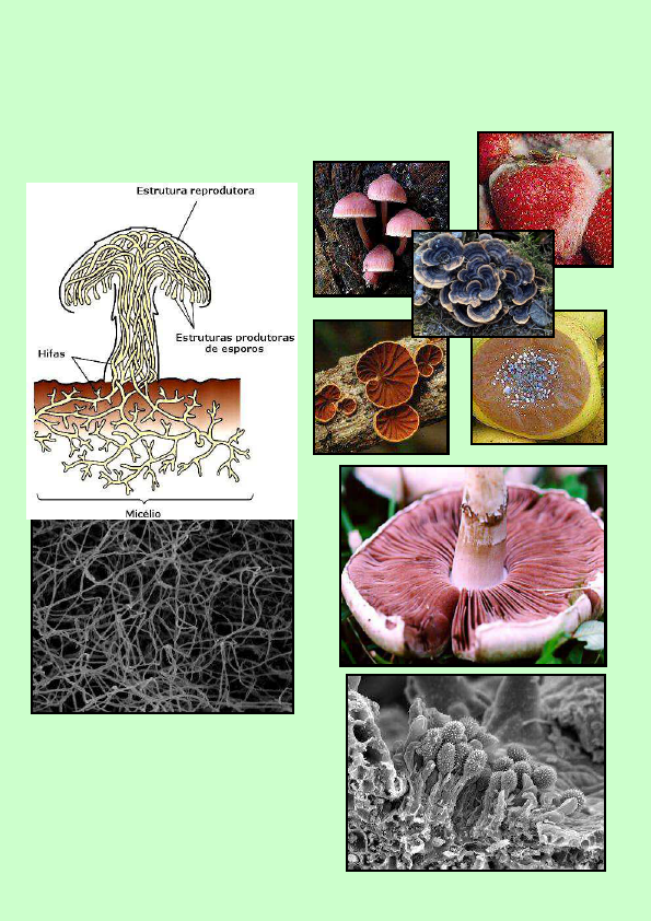 Fungos - 1 REINO FUNGI Prof. Dr. Pablo G. Carrasco. São eucariotos, multicelulares (maioria), filamentosos, heterótrofos, absorvedores, sem plastos e pigmentos fotossintetizantes. Distribuem-se por todos os lugares da Terra. Obtém seu alimento secretando enzimas digestivas no substrato onde se desenvolvem. Fungos - 2 Modo de vida: ► parasitas ► de vida livre (saprofiticos) ► simbiontes (micorrizas e liquenizados) Fungos - 3 São uma linha evolutiva independente das plantas seu RNAr indica serem mais relacionados com animais tem pouco em comum com protistas como as algas suas paredes celulares incluem uma matriz de quitina São ecologicamente importantes decompositores: promovem a reciclagem da matéria simbiontes exossimbiontes: micorrizas endossimbiontes: endomicorrizas e endófitos liquenizados com formigas São economicamente importantes causam danos a materiais e alimentos armazenados promovem doenças (a animais e a plantas) liberam toxinas (micotoxinas e antibióticos) produzem metabólitos de alto valor comercial (álcool, aditivos alimentares, medicamentos) Fungos - 4 Principais características dos filos Filo Representantes Hifas Reprodução assexuada Esporo sexuado Doenças em plantas C h yt ri d io m yc ot a (7 9 0 s pp .) Allomyces, Coelomyces Asseptadas, cenocíticas Zoósporos móveis uniflagelados, fragmentação S e m n om e p ró pr io mancha marron do milho, verrugoses da alfafa e batata Z yg om yc ot a (1 .0 6 0 s pp .) Rhizopus (bolor do pão), Glomus (endomicorriza) Asseptadas, cenocíticas Esporos imóveis, fragmentação Z ig ós po ro ( d e nt ro d o zi go sp or ân gi o) podridão mole A sc om yc ot a (3 2 .3 0 0 s pp .) Neurospora, Morchella (comestível), Tuber (trufa), míldios pulvurulentos Septadas Brotamento, conídios (esporos imóveis), fragmentação A sc ós po ro apodrecimento de frutos, crestamento do amendoim B as id io m yc ot a (2 2 .2 5 0 s pp .) cogumelos, orelhas-de- pau, ferrugens, carvões septadas com doliporo Brotamento, conídios, fragmentação B as id ió sp or o ferrugem preta dos cereais, podridão de raiz, ferrugem branca, carvões do milho e aveia Fungos - 5 Tipos de hifas Com freqüência as hifas fundem-se umas às outras, formando uma intrincada rede. Rizóides: hifas que fixam o fungo ao substrato. Haustórios: hifas especializadas de fungos parasitas. Fungos - 6 Ciclos reprodutivos processos sexuados e assexuados formam esporos esporos → são haplóides, originados por mitose. móveis em quitrídias; imóveis nos demais. produzidos em esporângios (produzem esporangiósporos) ou em células conidiogênicas (produzem os conídios). Zoósporo de Allomyces sp. Reprodução sexuada: 3 fases plasmogamia cariogamia meiose Fase diplóide é representada apenas pelo zigoto. Gametas: quando produzidos, são isogametas, produzidos no gametângio. Na maioria dos fungos: o núcleo é o gameta. C h yt ri d iu n co nf er va e Fungos - 7 Reprodução assexuada: brotamento, fragmentação ou germinação do esporo. todos podem reproduzir-se por fragmentação. Filo Chytridiomycota com alternância de gerações Filo Zygomycota com grande freqüência se reproduzem assexuadamente, por esporos haplóides. formas leveduróides, unicelulares são comuns. Fungos - 8 Zygomycota = esporo de resistência sexualmente produzido, chamado zigósporo. progametângio gametângio zigoto zigosporângio Fungos - 9 Filo Ascomycota reprodução assexuada: por conídios dos conidióforos reprodução sexuada: asco (dentro do ascoma) com ascósporos, anterídios (gametângios masc.) penetram pelo tricogine do ascogôgio (gametângios fem.); formam-se as hifas ascógenas dicarióticas (croziers); ocorre cariogamia, seguida de meiose, na região do himênio( camada de ascos). ascoma: se aberto = apotécio fechado = cleistotécio em pêra = peritécio ------- Fungos - 10 himênio himênio com ascos apotécios cleistotécio asco com ascosporos Fungos - 11 Filo Basidiomycota O carpóforo ou corpo de frutificação é constituído por hifas dicarióticas que formam o basídio com basisiósporos basídio Hifas se originam a partir dos basidiósporos que germinaram. Plasmogamia entre hifas forma o basidiocarpo ou corpo de frutificação Basidiocarpo = píleo (chapéu) + pedúnculo (estipe) píleo com lamelas, após ruptura da volva Fungos - 12 Leveduras fungos unicelulares, sem fase dicariótica. fase filamentar efêmera. Deuteromicetos ou Fungos Mitospóricos São fungos conidiais; conjunto artificial de 15.000 spp. só a reprodução assexuada é conhecida ou a sexuada não é utilizada para classificação. heterocariose e haploidização muitos são ascomicetos, poucos basidiomicetos ou zigomicetos Ex.: Penicillium, Aspergillus e Pleurotus. Fungos - 13 CURIOSIDADE: Fungos Predadores ou Caçadores hifas de alguns deuteromicetos liberam anestésicos, paralisam a presa e suas hifas penetram no corpo da vítima. hifas liberam substâncias pegajosas que predam protozoários e rotíferos. Arthrobotrys anchonia e Hyphoderma mutatum: deuteromicetos caçadores. RELAÇÕES SIMBIÓTICAS: Parasitismo ou Mutualismo? Líquen = micobionte (fungo) + fotobionte (alga ou cianobactéria) alguns micobiontes matam o fotobionte para se nutrir. A maioria não! Líquen = vive em ambientes com muita luz, baixa umidade durante o dia e muito úmidos à noite ou até no mar. o micobionte limita o crescimento do fotobionte, fornecendo-lhe água e nutrientes. → umidade elevada e constante: o fotobionte cresce e pode matar o micobionte. → grande maioria dos casos: o fotobionte não necessita do micobiontepara sobreviver. O inverso não é válido! 98% dos fungos liquenizados são Ascomycota; 2% Basidiomycota. Fungos - 14 Tipos de Liquens ► Crostosos ► Foliosos Fungos - 15 ► Fruticosos ou arborescentes Reproduzem-se por fragmentação, por propágulos pulvurulentos (sorédios) e por projeções do talo (isídios). Sorédio de Ramalina Isídios de Pertusaria corallina Fungos - 16 