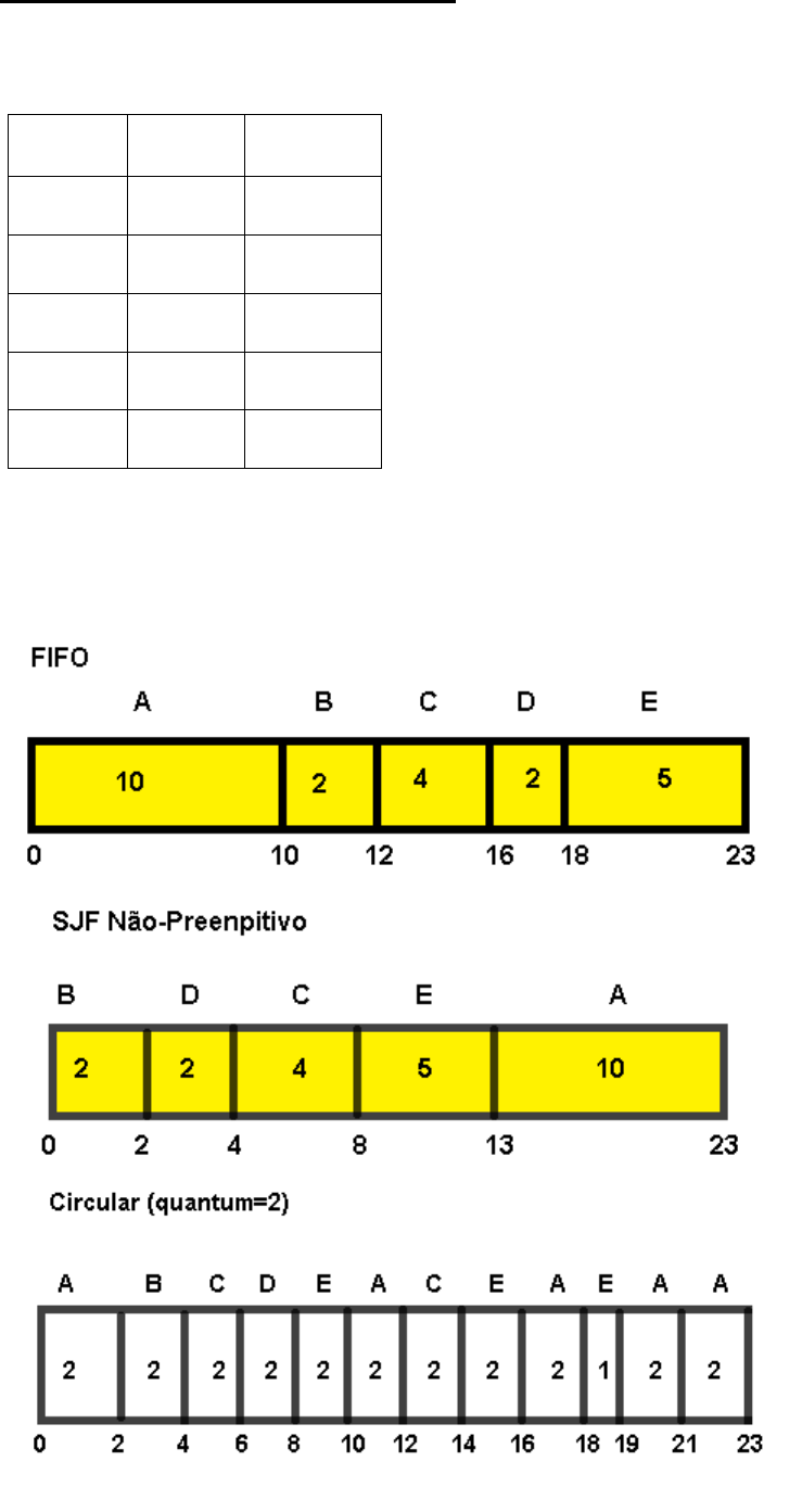 Gerencia de Processos-Escalonamento 1-) Considere o seguinte conjunto de processos, com o tamanho do tempo de burst de CPU dado em milissegundos: Processo Tempo (Burst) Prioridade A 10ms 3 B 2ms 1 C 4ms 3 D 2ms 4 E 5ms 2 Considere que os processos chegaram na ordem A, B, C, D , E; e todos no momentos 0 a-) Desenhe cinco gráficos de Grantt que ilustre a execução desses processos usando os seguintes algoritmos de escalonamento: FIFO, SJF (não preemptivo), Circular (quantum=2), Prioridade não preemptiva e preemptiva (quantum=2) b-) Qual o tempo de espera e tempo médio de cada processo para casa algoritmos de escalonamento? R: FIFO: A. 0 B. 10 C. 12 D. 16 E. 18 Tempo Médio: 11,2 SJF Não-preemptivo A. 13 B. 0 C. 4 D. 2 E. 8 Tempo Médio 5,4 Circular: A. 19 B. 2 C. 12 D. 6 E. 18 Tempo Médio: 11,4 Prioritário Não Preemptivo A. 2 B. 21 C. 12 D. 0 E. 16 Tempo Médio: 10,2 Prioritário Preemptivo A. 19 B. 8 C. 12 D. 0 E. 18 Tempo Médio 11,4 c-) Qual dos algoritmos resulta no menor tempo de espera médio (em relação a todos os processos)? R: O que apresenta menor tempo de espera médio é o SJF Não-Preemptivo d-) Desenhe o gráfico de Grantt para o algoritmo SJF-preemptivo considerando as informações da tabela seguinte: Processo Tempo (Burst) Chegada A 10ms 0 B 2ms 1 C 4ms 2 D 2ms 4 E 5ms 6 2-) Cinco jobs estão esperando para serem executados. Seus tempos de execução previsto são 9, 6, 3, 5 e 1. Em que ordem e qual algoritmo eles deveriam ser executados para minimizar o tempo de resposta? R: Ordem 1,3,5,6 e 9, sendo utilizado o algoritmo circular Round-Robin para que seja feito uma redução no tempo de resposta.