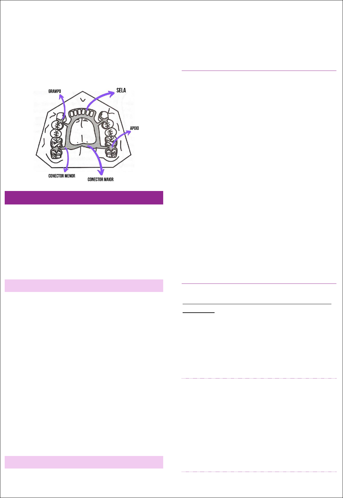 ELEMENTOS CONSTITUINTES DAS PPR • Conector maior: une todos os componentes • Conectores menores: une conector maior com os demais elementos • Retentores: apoios (fixação e suporte) e grampos (principais responsáveis por retenção) • Sela (dentes artificiais, mucosa e volume ósseo) CONECTORES MAIORES – BARRAS DE UNIÃO CONFERE A PRÓTESE UMA CONFIGURAÇÃO ÚNICA São elementos metálicos rígidos que conectam os elementos constituintes da PPR, localizados de um lado do arco dentário, aos que se situam do outro lado. São barras metálicas rígidas que unem bilateralmente os retentores e a sela entre si, através dos conectores menores. FUNÇÕES DO CONECTOR MAIOR • Unir (rigidamente) os retentores diretos e indiretos (suporte, retenção e estabilidade) • Conferir a prótese uma configuração única e indeformável • Função principal: conexão • Funções secundárias: participar do suporte, das retenções diretas e indiretas e estabilização da prótese – funções que podem ocorrer em próteses para maxila e que recubram consideravelmente o palato. RETENÇÃO DIRETA: mesmos princípios que retem PT, adesão, coesão e pressão atmosférica RETENÇÃO INDIRETA: depende do intimo contato do conector com tecido mucos, auxilia no impedimento de rotação da prótese por meio de um fulcro formado pelos 2 apoios oclusais principais. REQUISITOS FUNDAMENTAIS • Rigidez • Passividade com os tecidos mucosos (relação de contato e de alívio) – conector não pode causar um desconforto ao paciente • Comodidade (forma, interferências, fonética) RIGIDEZ Fundamental para que a PPR tenha um bom desempenho biomecânico, ao mesmo tempo preservando os tecidos remanescentes e dando o máximo de conforto ao paciente Quando a estrutura metálica não for suficientemente rígida para a função mastigatória, poderá sofrer deformação com possíveis consequências traumáticas para o tecido de suporte periodontal – pode intruir no tecido fibroomucoso e lesionar Além disso, se for flexível demais, se movimenta e causa forças excessivas sobre dente e mucosa. Importante que a estrutura tenha uma espessura adequada para proporcionar uma rigidez estrutural que suporte cargas das forças mastigatórias. Próteses muito flexíveis conferem muitas forças para a mucosa e não direciona nenhuma força para os dentes – sendo mucosuportada e consequentemente afisiológica. As próteses flexíveis devem apenas cumprir funções provisórias. PASSIVIDADE COM OS TECIDOS MUCOSOS COMO DEVE SER A RELAÇÃO DO CONECTOR MAIOR COM A MUCOSA? Passividade com os tecidos mucosos (relação de contato e de alívio) A PPR tem relação direta ou indireta com a mucosa – moldar muito bem mucosa e dentes. RELAÇÃO DE CONTATO O Conector maior possui uma relação de contato com o palato. Mucosa do palato: espessa, queratinizada, bem aderida, osso palatino não é reabsorvido, suporta mais carga Essas características permitem que a relação que o conector maior tem com a mucosa do palato seja em contato direto, justaposto, encostado. Na mandíbula não pode RELAÇÃO DE ALÍVIO O conector maior possui uma relação de alivio na mucosa mandibular, ou já, deve estar ligeiramente afastado, não pode estar muito colado. Mucosa mandibular mais fina, menos aderida, não queratinizada, impossibilita esse contato direto do conector com mucosa. COMODIDADE Não permitir que o conector pressione: músculos, freios e bridas, margem gengival, etc Conforto – permitir boa fonética TIPOS DE CONECTORES MAIORES – ARCO SUPERIOR • Barra palatina dupla • Em forma de U • Única • Placa palatina • Barra bipartida • Recobrimentos parciais BARRA PALATINA DUPLA • Mais utilizada - versátil • Combinação das barras anterior e posterior • Ótima rigidez (7 a 9mm) • Distancia do conector à margem gengival de 4 a 6mm: comodidade • Limite da área chapável (zona de post daming): até onde a barra palatina pode estar – entre palato duro e palato mole • Casos de sobre-extensão pode causar: dor (compressão de tecido mole vibrátil), desconforto (ânsia de vômito) e deslocamento (pouca retenção) • Indicada para todas as classes de Kennedy (com restrições) BARRA PALATINA EM FORMA DE “U” • Variação da barra dupla • Apenas uma barra anterior • Extensão de 10 a 12mm para conferir maior rigidez • Indicação principal: presença de tórus palatino (volumoso) • Indicação: classes III e IV de Kennedy BARRA PALATINA ÚNICA • Quando uma única barra une diretamente os elementos bilaterais da PPR • Largura aproximada de 15mm • Indicada: paciente com comunicações buco-sinusais, pacientes fissurados e Classe III (espaços protéticos pequenos e médios CONECTOR MAIOR EM FORMA DE PLACA OU PLACA PALATINA TOTAL OU CAPEADO PALATINO • Recobre todo palato • Indicação: extremo livre, principalmente com pilares mal implantados e/ou grandes perdas dentais • Palato ajuda a suportar e reter a prótese BARRA PALATINA BIPARTIDA • Conector maior subdivide-se em 2 partes • Parte anterior: une-se aos elementos constituintes • Parte posterior une-se à sela • Indicação: preservação dos dentes pilares de sobrecarga mastigatória- tem como intenção que o funcionamento independente da sela • Problema: impossibilidade de controlar as forças recebidas pelo rebordo, sobrecarga excessiva e prejudicial RECOBRIMENTOS PARCIAIS (BARRAS PALATINAS SIMPLES) • São constituídos por uma única barra que une bilateralmente os componentes da PPR • Indicações: todas as classes • Suporte palatino mínimo • Grandes espaços RECEBE A DENOMINAÇÃO DE ACORRDO COM A ÁREA QUE OCUPA: • Barra palatina anterior – região anterior de palato • Barra palatina média – região media do palato • Barra palatina posterior – região posterior do palato BATTA PALATINA MÉDIA BARRA PALATINA ANTERIOR: atravessa a área das rugosidades palatinas – pode causar desconf