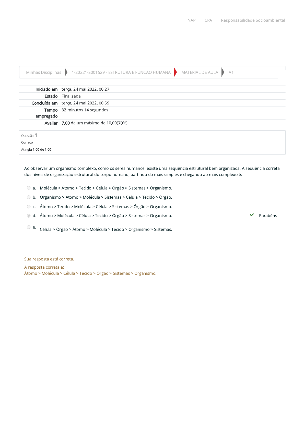 24/05/2022 01:15 A1: Revisão da tentativa https://ambienteacademico.com.br/mod/quiz/review.php?attempt=503705&cmid=351978 1/6 Minhas Disciplinas 1-20221-S001529 - ESTRUTURA E FUNCAO HUMANA MATERIAL DE AULA A1 Iniciado em terça, 24 mai 2022, 00:27 Estado Finalizada Concluída em terça, 24 mai 2022, 00:59 Tempo empregado 32 minutos 14 segundos Avaliar 7,00 de um máximo de 10,00(70%) Questão 1 Correto Atingiu 1,00 de 1,00 Ao observar um organismo complexo, como os seres humanos, existe uma sequência estrutural bem organizada. A sequência correta dos níveis de organização estrutural do corpo humano, partindo do mais simples e chegando ao mais complexo é: a. Molécula > Átomo > Tecido > Célula > Órgão > Sistemas > Organismo. b. Organismo > Átomo > Molécula > Sistemas > Célula > Tecido > Órgão. c. Átomo > Tecido > Molécula > Célula > Sistemas > Órgão > Organismo. d. Átomo > Molécula > Célula > Tecido > Órgão > Sistemas > Organismo. Parabéns e. Célula > Órgão > Átomo > Molécula > Tecido > Organismo > Sistemas. Sua resposta está correta. A resposta correta é: Átomo > Molécula > Célula > Tecido > Órgão > Sistemas > Organismo. NAP CPA Responsabilidade Socioambiental https://ambienteacademico.com.br/my/ https://ambienteacademico.com.br/course/view.php?id=11246 https://ambienteacademico.com.br/course/view.php?id=11246§ion=2 https://ambienteacademico.com.br/mod/quiz/view.php?id=351978 https://codely-fmu-content.s3.amazonaws.com/Moodle/NAP/inicial/nap/fmu/index.html https://codely-fmu-content.s3.amazonaws.com/Moodle/CPA/landing_CPA/index.html https://portal.fmu.br/sustentabilidade 24/05/2022 01:15 A1: Revisão da tentativa https://ambienteacademico.com.br/mod/quiz/review.php?attempt=503705&cmid=351978 2/6 Questão 2 Correto Atingiu 1,00 de 1,00 Questão 3 Correto Atingiu 1,00 de 1,00 No corpo humano possuímos três tipos de músculos: estriado cardíaco que possui contração involuntária, rápida e vigorosa; estriado esquelético que possui contração voluntária rápida e vigorosa e lisa que possui contração involuntária e lenta. Os músculos esqueléticos possuem classi�cações de acordo com a forma, número de origens, número de inserções, quanto ao número de ventres musculares e quanto ao número de tendões intermediários. Sendo assim os músculos esqueléticos podem ser classi�cados quanto ao número de origens como: a. longos, largos e fusiformes. b. trapézio e pronador quadrado c. policaudado e bicaudado d. tríceps, bíceps e quadríceps Parabéns e. poligástrico e digástrico Sua resposta está correta. A resposta correta é: tríceps, bíceps e quadríceps Quando o desvio do padrão anatômico perturba a função, diz-se que se trata de uma anomalia. Se a anomalia se for tão acentuada de modo a deformar profundamente a construção do corpo do indivíduo, sendo, em geral, incompatível com a vida, denomina-se: a. variação morfológica b. longilíneo c. variação anatômica d. anomalia profunda e. monstruosidade Parabéns Sua resposta está correta. A resposta correta é: monstruosidade NAP CPA Responsabilidade Socioambiental https://codely-fmu-content.s3.amazonaws.com/Moodle/NAP/inicial/nap/fmu/index.html https://codely-fmu-content.s3.amazonaws.com/Moodle/CPA/landing_CPA/index.html https://portal.fmu.br/sustentabilidade 24/05/2022 01:15 A1: Revisão da tentativa https://ambienteacademico.com.br/mod/quiz/review.php?attempt=503705&cmid=351978 3/6 Questão 4 Correto Atingiu 1,00 de 1,00 Questão 5 Correto Atingiu 1,00 de 1,00 O tecido conjuntivo tem a função de preenchimento, sustentação e armazenamento de reservas. O corpo humano apresenta esse tipo de tecido praticamente em todos os órgãos e sistemas. São quatro tipos de tecido conjuntivo que podem ser classi�cados como: a. Tecido conjuntivo propriamente dito, tecido adiposo, tecido ósseo e tecido epitelial. b. Tecido conjuntivo propriamente dito, tecido adiposo, tecido ósseo e tecido cartilaginoso. Parabéns c. Tecido conjuntivo propriamente dito, tecido muscular estriado esquelético, tecido ósseo e tecido cartilaginoso. d. Tecido conjuntivo nervoso, tecido adiposo, tecido ósseo e tecido cartilaginoso. e. Tecido conjuntivo propriamente dito, tecido nervoso, tecido ósseo e tecido cartilaginoso. Sua resposta está correta. A resposta correta é: Tecido conjuntivo propriamente dito, tecido adiposo, tecido ósseo e tecido cartilaginoso. O Sistema Nervoso representa uma rede de comunicações do organismo, sendo dividido em Sistema Nervoso Central (SNC) e Sistema Nervoso Periférico (SNP). O Sistema Nervoso Central (SNC) responsável pelas funções mais complexas, como a interpretação de estímulos, o desencadeamento das respostas adequadas, o planejamento do controle dos órgãos internos e as atividades abstratas, como o raciocínio, sendo altamente protegido por parte óssea (crânio e coluna vertebral), por meninges e pelo líquido cerebrospinal ou líquor. Sendo que o SNC é formado pelo Encéfalo e Medula Espinal. Assinale a alternativa que contêm as estruturas que compõe o Encéfalo: a. Cerebelo, Ponte e Nervos. b. Cérebro, Cerebelo e Tronco Encefálico. Parabéns c. Cérebro, Cerebelo e Nervos Espinais. d. Nervos Espinais, Cérebro e Nervos Cranianos. e. Nervos, Gânglios e Terminações Nervosas. Sua resposta está correta. A resposta correta é: Cérebro, Cerebelo e Tronco Encefálico. NAP CPA Responsabilidade Socioambiental https://codely-fmu-content.s3.amazonaws.com/Moodle/NAP/inicial/nap/fmu/index.html https://codely-fmu-content.s3.amazonaws.com/Moodle/CPA/landing_CPA/index.html https://portal.fmu.br/sustentabilidade 24/05/2022 01:15 A1: Revisão da tentativa https://ambienteacademico.com.br/mod/quiz/review.php?attempt=503705&cmid=351978 4/6 Questão 6 Incorreto Atingiu 0,00 de 1,00 Questão 7 Correto Atingiu 1,00 de 1,00 O Sistema nervoso está dividido em CENTRAL (SNC) e PERIFÉRICO (SNP). A função do SNC é basicamente receber informações 
