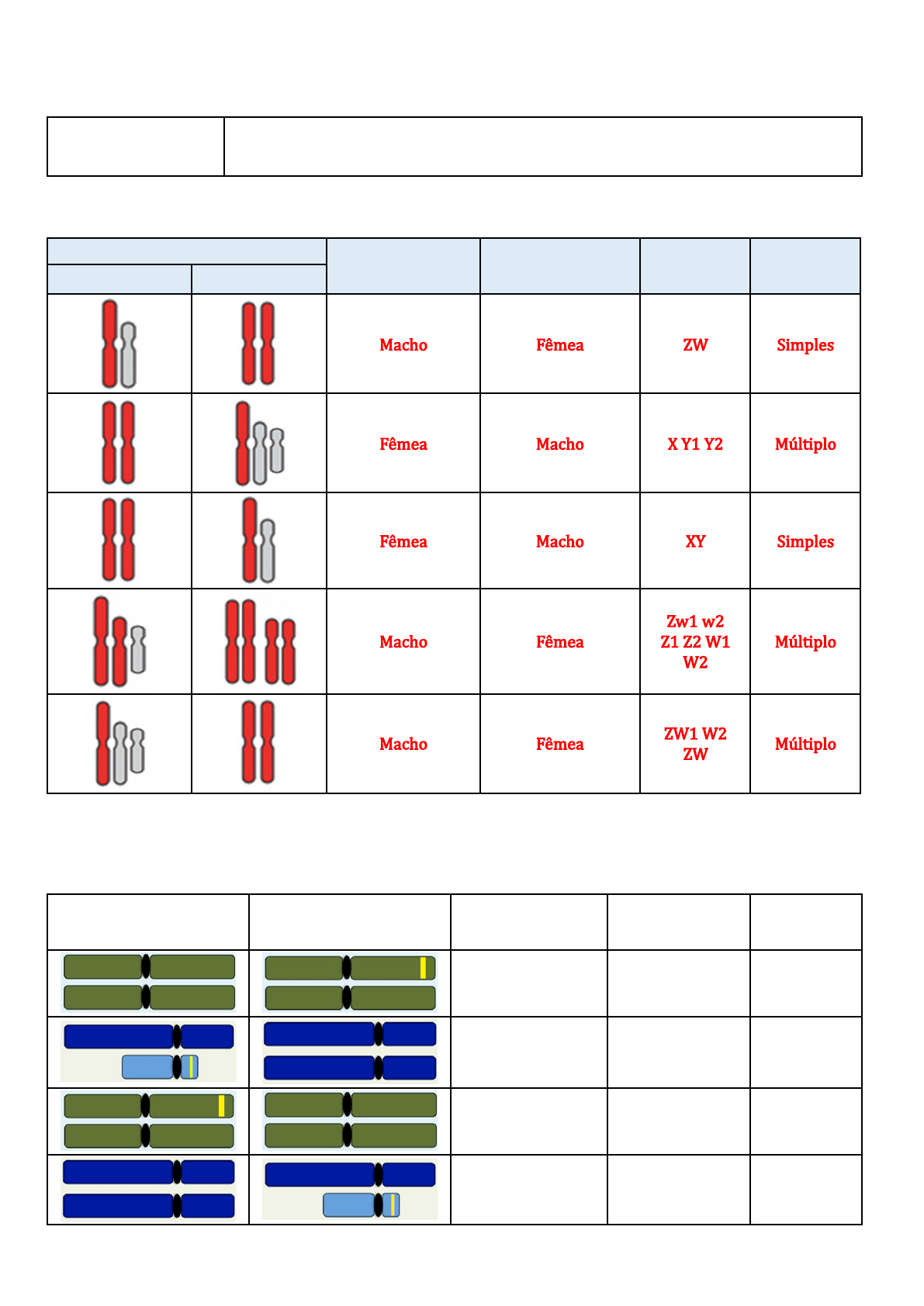 Disciplina Citogenética – Bacharelado em Ciências Biológicas – Profª Ana Maria Benko Iseppon Aula Prática – Cromossomos e Sistemas de Determinação Sexual Nome do(a) Aluno(a): Karolaine Martins da Silva Santos 1. Preencha o quadro abaixo com as informações sobre os sistemas sexuais, com base no explicado em aula. Cromossomos Sexuais Quem é o sexo homogamético? Quem é o sexo heterogamético? Qual o sistema sexual? Múltiplo ou simples?Fêmea♀ Macho♂ Macho Fêmea ZW Simples Fêmea Macho X Y1 Y2 Múltiplo Fêmea Macho XY Simples Macho Fêmea Zw1 w2 Z1 Z2 W1 W2 Múltiplo Macho Fêmea ZW1 W2ZW Múltiplo 2. Considerando os cromossomos sexuais abaixo, informe qual situação refere-se a cromossomos sexuais homomórficos e qual a heteromórficos. A banda amarela (presente em alguns cromossomos) representa o gene determinante do sexo (desencadeador da diferenciação masculina ou feminina). Fêmea♀ Macho♂ Cromossomos Homomórficos ou Heteromórficos? Qual o sexo heterogamético? Qual o Sistema Sexual? Homomór�icos Macho XY Heteromór�icos Fêmea ZW Homomór�icos Fêmea ZW Heteromór�icos Macho XY Disciplina Citogenética – Bacharelado em Ciências Biológicas – Profª Ana Maria Benko Iseppon Aula Prática – Cromossomos e Sistemas de Determinação Sexual 3. Abaixo estão ilustrados cariótipos de quatro espécies (duas de besouros escarabeídeos e duas de camaleões), sendo para cada espécie um cariótipo do macho e outro da fêmea. Com base no exposto, informe: (I) O sistema sexual de cada espécie; (II) A fórmula Cariotípica de cada indivíduo (tanto macho como fêmea); (III) Se o sistema de determinação sexual é simples ou múltiplo; (IV) Se os cromossomos sexuais são homomórficos ou heteromórficos; (V) Descreva a morfologia dos autossomos e dos cromossomos sexuais da fêmea da espécie D (Furcifer verrucosus). Responda no quadro abaixo da figura. Fontes das imagens: Cariótipos A+B: Proença et al. (2005). Genetics and Molecular Biology, 28(4):725-733. Cariótipos C+D: Rovatsos et al. (2019). Genes 10(12), 1020; https://doi.org/10.3390/genes10121020. Imagens - besouros: https://carabidae.org/gallery?taxon=22769. Fucifer lateralis Disciplina Citogenética – Bacharelado em Ciências Biológicas – Profª Ana Maria Benko Iseppon Aula Prática – Cromossomos e Sistemas de Determinação Sexual (https://www.123rf.com/photo_84117037_carpet-chameleon-furcifer-lateralis-.html); F. verrucosus: American Natural History Museum (domínio público). Cariótipos (I) SistemaSexual? (II) Fórmula Cariotípica? (III) Sistema de determinação sexual: simples ou múltiplo? (IV) Cromossomos sexuais: homomórficos ou heteromórficos ? A (Macho♂) XX 2n= 31, X simples homomór�icosA (Fêmea♀) 2n= 32, XX B (Macho♂) XY 2n= 29, X1 X2 X3 X4 Y múltiplo heteromór�icoB (Fêmea♀) 2n= 32, X1 X1 X2 X2 X3 X3 X4 X4 C (Macho♂) ZW 2n= 24, ZZ simples heteromór�icoC (Fêmea♀) 2n= 24, ZW D (Macho♂) ZW 2n= 22, Z1 Z2 múltiplo heteromór�icoD (Fêmea♀) 2n= 22, Z1 Z2 W (V). Descreva a morfologia dos autossomos e dos cromossomos sexuais da fêmea da espécie D (Furcifer verrucosus). cada par de autossomo é metacêntrico. Os cromossomos sexuais são submetacêntrico. 4. Suponha que você seja um pesquisador da área biológica e que está analisando o sapo Odorrana swinhoana pela primeira vez. Você observa que o cariótipo diploide tem 26 cromossomos (n=13, Idiograma da Figura A, abaixo). Nas fêmeas a meiose é regular (Figura B), com formação de bivalentes. Por sua vez nos machos há pares cromossômicos heteromórficos (Figura C). Na meiose dos machos 6 cromossomos se associam formando um hexavalente (Figura D). Com base no exposto e nas figura apresentadas, responda: Disciplina Citogenética – Bacharelado em Ciências Biológicas – Profª Ana Maria Benko Iseppon Aula Prática – Cromossomos e Sistemas de Determinação Sexual (I) A fórmula cariotípica de cada indivíduo (tanto macho como fêmea). (II) Qual o sistema de determinação sexual e se o sistema é simples ou múltiplo. (III) Se os cromossomos sexuais são homomórficos ou heteromórficos. (IV) Ao publicar essa nova informação para a ciência, qual seria a sua hipótese sobre a origem dos cromossomos sexuais dessa espécie? Justifique. Fonte das figuras: Adaptado de Miura et al. (2021). Cells 10(3) https://doi.org/10.3390/cells10030661 Resposta da questão 4 Quesito Resposta I Fêmea: n= 13, X1 X1 X2 X2 X3 X3 / Macho: n= 13, X1 Y1 X2 Y2 X3 Y3 II Sistema XY do macho porque ele é heterogamético, múltiplo III são heteromór�icos IV https://doi.org/10.3390/cells10030661