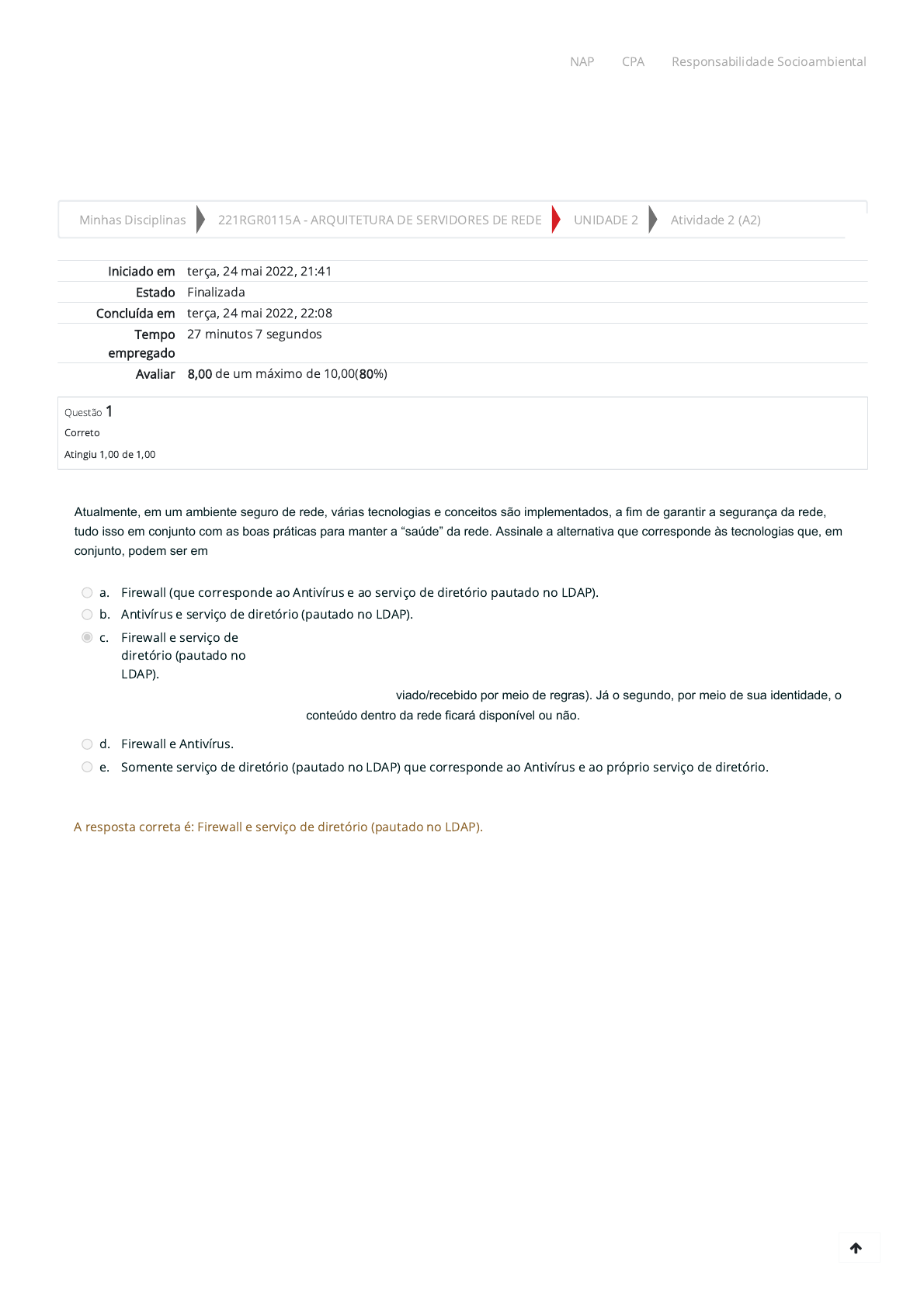 24/05/2022 22:10 Atividade 2 (A2): Revisão da tentativa https://ambienteacademico.com.br/mod/quiz/review.php?attempt=511095&cmid=338518#question-528783-2 1/8 Minhas Disciplinas 221RGR0115A - ARQUITETURA DE SERVIDORES DE REDE UNIDADE 2 Atividade 2 (A2) Iniciado em terça, 24 mai 2022, 21:41 Estado Finalizada Concluída em terça, 24 mai 2022, 22:08 Tempo empregado 27 minutos 7 segundos Avaliar 8,00 de um máximo de 10,00(80%) Questão 1 Correto Atingiu 1,00 de 1,00 Atualmente, em um ambiente seguro de rede, várias tecnologias e conceitos são implementados, a fim de garantir a segurança da rede, tudo isso em conjunto com as boas práticas para manter a “saúde” da rede. Assinale a alternativa que corresponde às tecnologias que, em conjunto, podem ser empregadas para garantir a segurança na rede e autenticação, respectivamente. a. Firewall (que corresponde ao Antivírus e ao serviço de diretório pautado no LDAP). b. Antivírus e serviço de diretório (pautado no LDAP). c. Firewall e serviço de diretório (pautado no LDAP). Resposta correta. A alternativa B está correta, pois, em um ambiente de rede corporativa, o Firewall, em conjunto com o serviço de diretório, pautado no LDAP, cria uma “camada” de segurança na rede, pois o primeiro fica responsável pelo controle seguro do tráfego da rede (o que pode ser enviado/recebido por meio de regras). Já o segundo, por meio de sua identidade, o conteúdo dentro da rede ficará disponível ou não. d. Firewall e Antivírus. e. Somente serviço de diretório (pautado no LDAP) que corresponde ao Antivírus e ao próprio serviço de diretório. A resposta correta é: Firewall e serviço de diretório (pautado no LDAP). NAP CPA Responsabilidade Socioambiental https://ambienteacademico.com.br/my/ https://ambienteacademico.com.br/course/view.php?id=12224 https://ambienteacademico.com.br/course/view.php?id=12224§ion=4 https://ambienteacademico.com.br/mod/quiz/view.php?id=338518 https://codely-fmu-content.s3.amazonaws.com/Moodle/NAP/inicial/nap/fmu/index.html https://codely-fmu-content.s3.amazonaws.com/Moodle/CPA/landing_CPA/index.html https://portal.fmu.br/sustentabilidade 24/05/2022 22:10 Atividade 2 (A2): Revisão da tentativa https://ambienteacademico.com.br/mod/quiz/review.php?attempt=511095&cmid=338518#question-528783-2 2/8 Questão 2 Correto Atingiu 1,00 de 1,00 Questão 3 Correto Atingiu 1,00 de 1,00 Devido à popularização da virtualização no ambiente corporativo, existem, atualmente, diversas ferramentas de virtualização no mercado, algumas oferecidas por grandes empresas do setor de TI e outras apresentadas pelo mundo opensource. Analise as afirmativas a seguir referentes às opções de ferramentas e assinale (V) para a(s) verdadeira(s) e (F) para a(s) falsa(s). I. VMWare, Hyper-V e KVM. II. Hypervisor e VM. III. OpenVZ e Xen. IV. VirtualBox e VirtualPC. Agora, assinale a alternativa que apresenta a sequência correta. a. V, V, F, F. b. V, F, V, V. Resposta correta. A alternativa D está correta, pois VMWare é uma empresa que possui soluções proprietárias para virtualização; Hyper-V é uma tecnologia de virtualização da Microsoft; Openvz é uma tecnologia com base no ambiente Linux, assim como o KVM. Já o Xen e o VirtualBox são open sources e ambos suportam vários sistemas operacionais. O VirtualPC é a antiga ferramenta de virtualização do Windows. c. F, V, F, V. d. V, F, V, F. e. V, V, F, V. A resposta correta é: V, F, V, V. Ao levar em consideração os estudos sobre as regras do Iptables, que existem comandos para liberação ou bloqueio de portas, bloqueio de uma rede específica, liberação de um determinado endereço para acesso à rede ou habilitação de acesso a portas específicas na rede, analise as afirmativas a seguir sobre as regras de Iptables. I. A regra: iptables -A INPUT -p tcp –destination-port 8080 -j ACCEPT. Libera a porta 8080 para fora da rede, por exemplo, Web. II. A regra: iptables -A INPUT -p tcp -s 192.168.0.45 –dport 22 -j ACCEPT. Libera a porta 22 (ssh) do ip 192.168.0.45 para acesso. III. A regra: iptables -A INPUT -s 10.0.0.0/8 -j DROP. Libera todos os endereços vindo da rede 10.0.0.0/8. Agora, assinale a alternativa correta. a. As a�rmativas I, II e III são falsas. b. As a�rmativas I, II e III são verdadeiras. c. As afirmativas I e III são verdadeiras e a II é falsa. d. As a�rmativas II e III são verdadeiras e a I é falsa. e. As a�rmativas I e II são verdadeiras e a III é falsa. Resposta correta. A alternativa B está correta, pois as afirmativas das regras I e II são verdadeiras, já que liberam a porta 8080 e 22 no ip 192.168.0.45. A regra III não libera, mas, sim, bloqueia todos os endereços vindos da rede 10.0.0.0/8 por causa da ação DROP. A resposta correta é: As a�rmativas I e II são verdadeiras e a III é falsa. NAP CPA Responsabilidade Socioambiental https://codely-fmu-content.s3.amazonaws.com/Moodle/NAP/inicial/nap/fmu/index.html https://codely-fmu-content.s3.amazonaws.com/Moodle/CPA/landing_CPA/index.html https://portal.fmu.br/sustentabilidade 24/05/2022 22:10 Atividade 2 (A2): Revisão da tentativa https://ambienteacademico.com.br/mod/quiz/review.php?attempt=511095&cmid=338518#question-528783-2 3/8 Questão 4 Correto Atingiu 1,00 de 1,00 A virtualização é uma tecnologia na área de TI muito utilizada atualmente, na qual temos o conceito de várias máquinas virtuais dentro de uma, trazendo, ao mundo da computação, uma série de benefícios, por exemplo, a escalabilidade, como exemplificado na figura a seguir. Figura - Representação da virtualização Fonte: John Aplessed / Wikimedia Commons. Com base no exposto, analise as afirmativas a seguir e assinale (V) para a(s) verdadeira(s) e (F) para a(s) falsa(s). I. Permite que o sistema operacional de uma máquina seja executado de modo parcial ou de modo pleno de forma virtual dentro de outra máquina. II. Pode transformar um servidor físico (divisão do hardware físico)